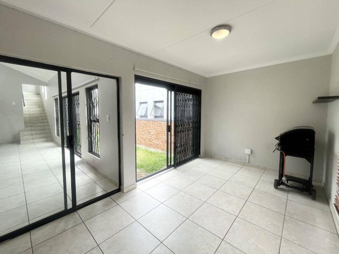 Enjoy secure, lock-up-and-go living with covered patio and private garden in Highveld's Eco Park Estate, steps from Eco Boulevard, N1 and Gautrain bus; two bedrooms, one bath, lock-up garage.
