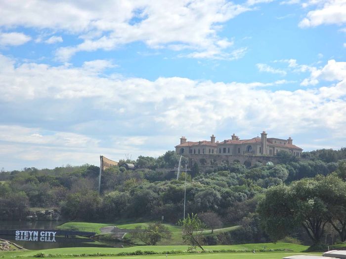 Host sunset soirées on Steyn City's rooftop sky-bar and Jacuzzi, enjoying panoramic estate views, glass elevator, private pool and boma; five ensuite bedrooms and four-car garage.