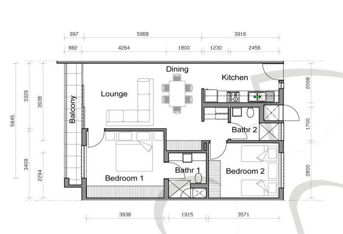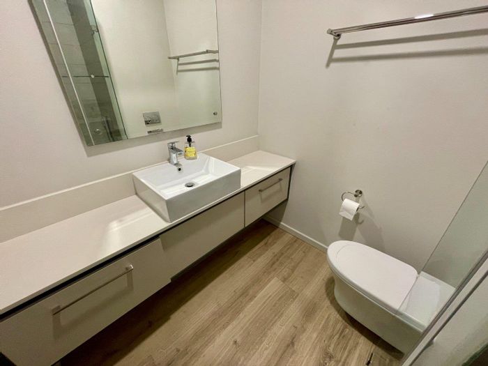 Upmarket 2-bedroom, 2-bathroom unit with study, sleek kitchen, laundry corner, open-plan living, and north-facing balcony. Premium choice.