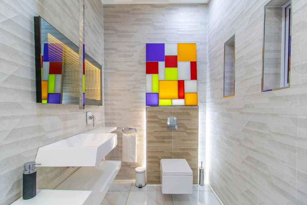 Inside, the home is adorned with chic Bauhaus design elements, showcasing European furniture and stunning finishes that exude elegance. The dramatic red and white kitchen is a culinary masterpiece, equipped with everything a chef could desire: a gas stove, built-in fridges, a pop-up extractor, an Italian countertop, and more. The open-plan layout seamlessly connects to a massive patio, perfect for entertaining guests or enjoying quiet evenings under the stars.