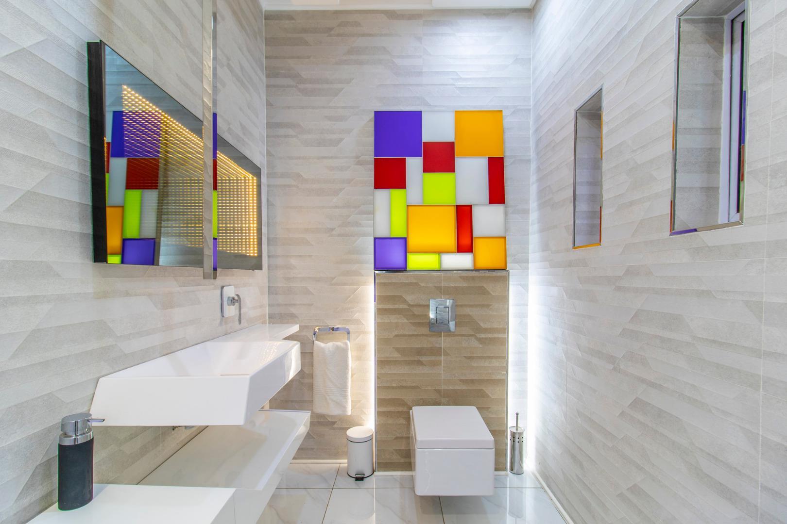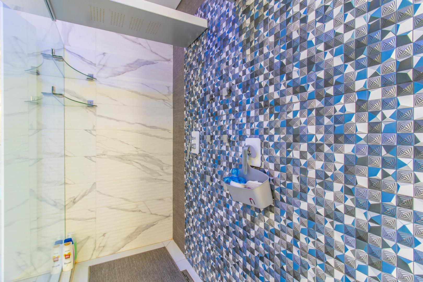 The outdoor space is equally impressive, with frameless glass balustrades along the pool and balconies, aesthetic privacy screens, and sweeping city views. Skylights flood the interior with natural light, complemented by artistic lighting features throughout. The cocktail bar and lounge area provide the perfect setting for socializing, while custom-made geometric ceilings with changing lights add a modern touch.