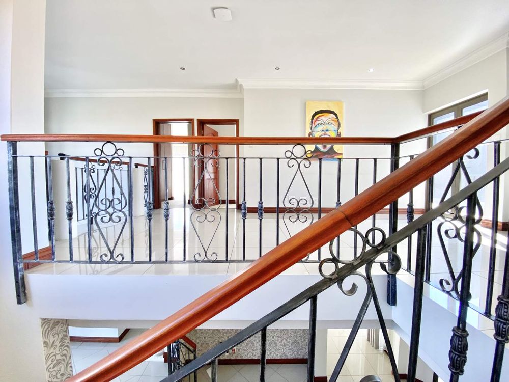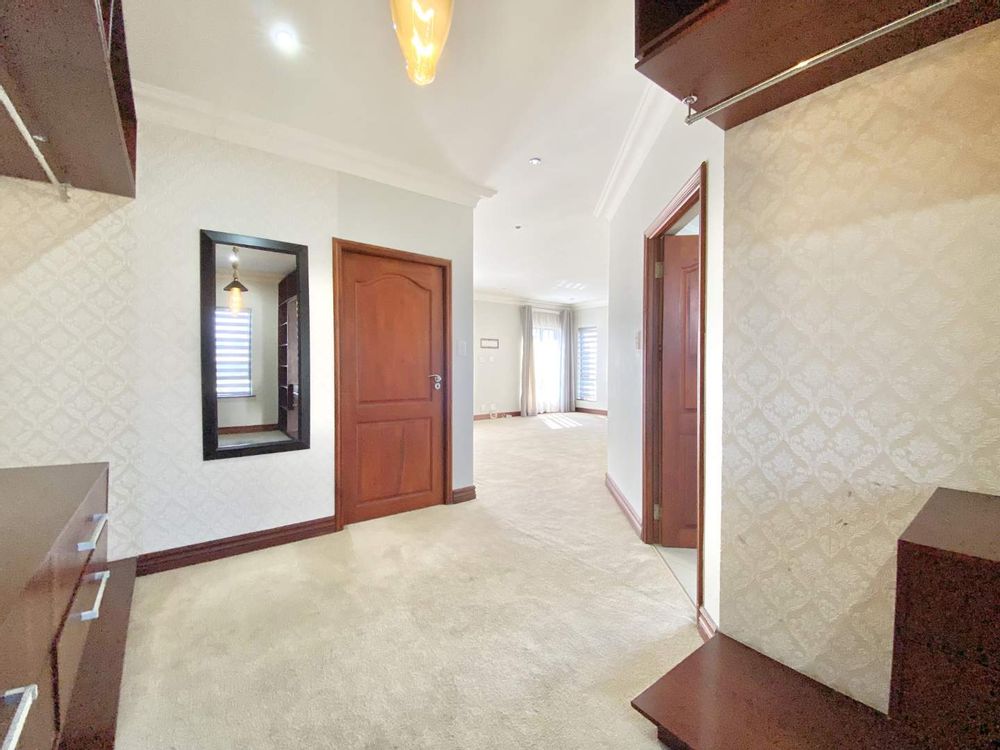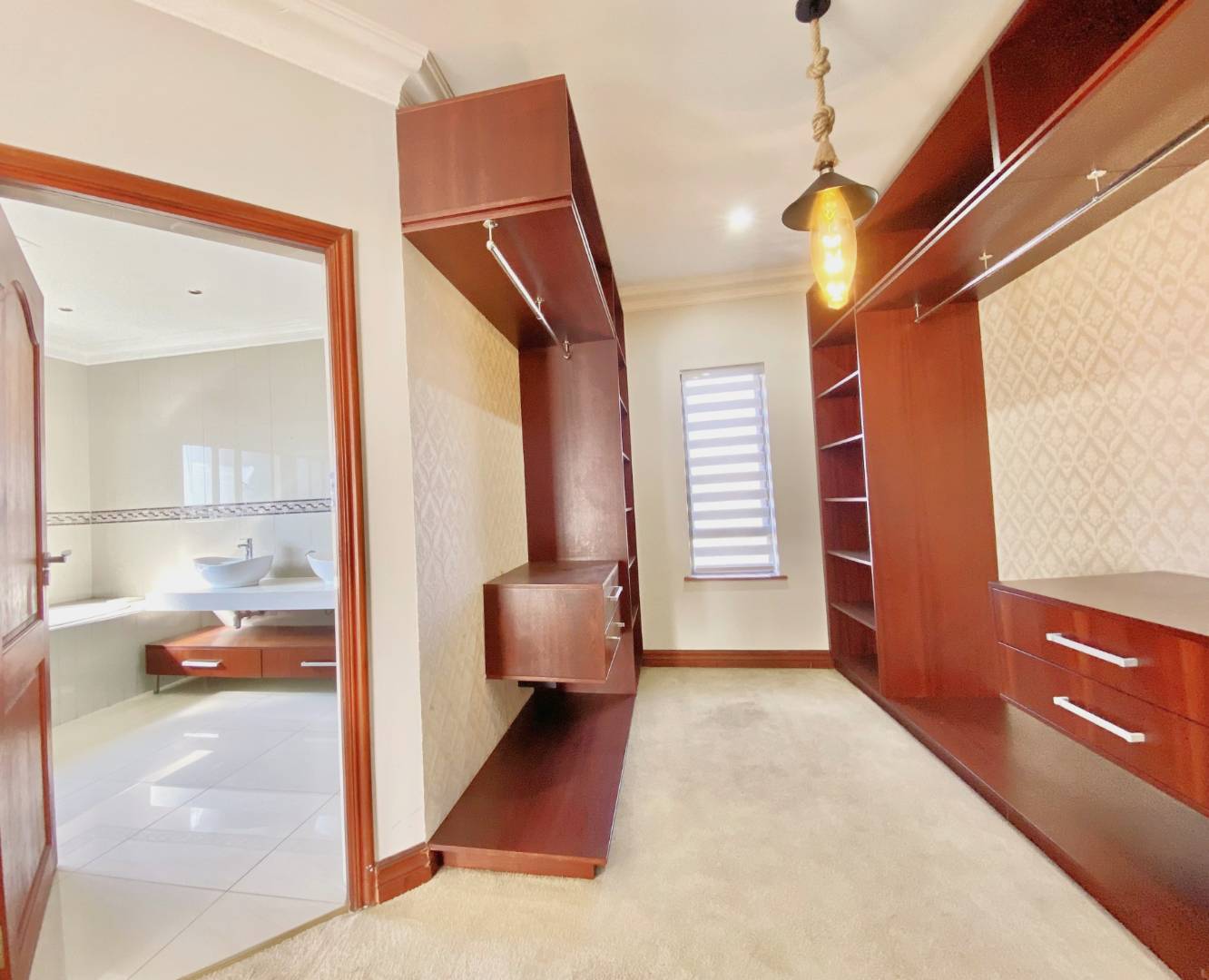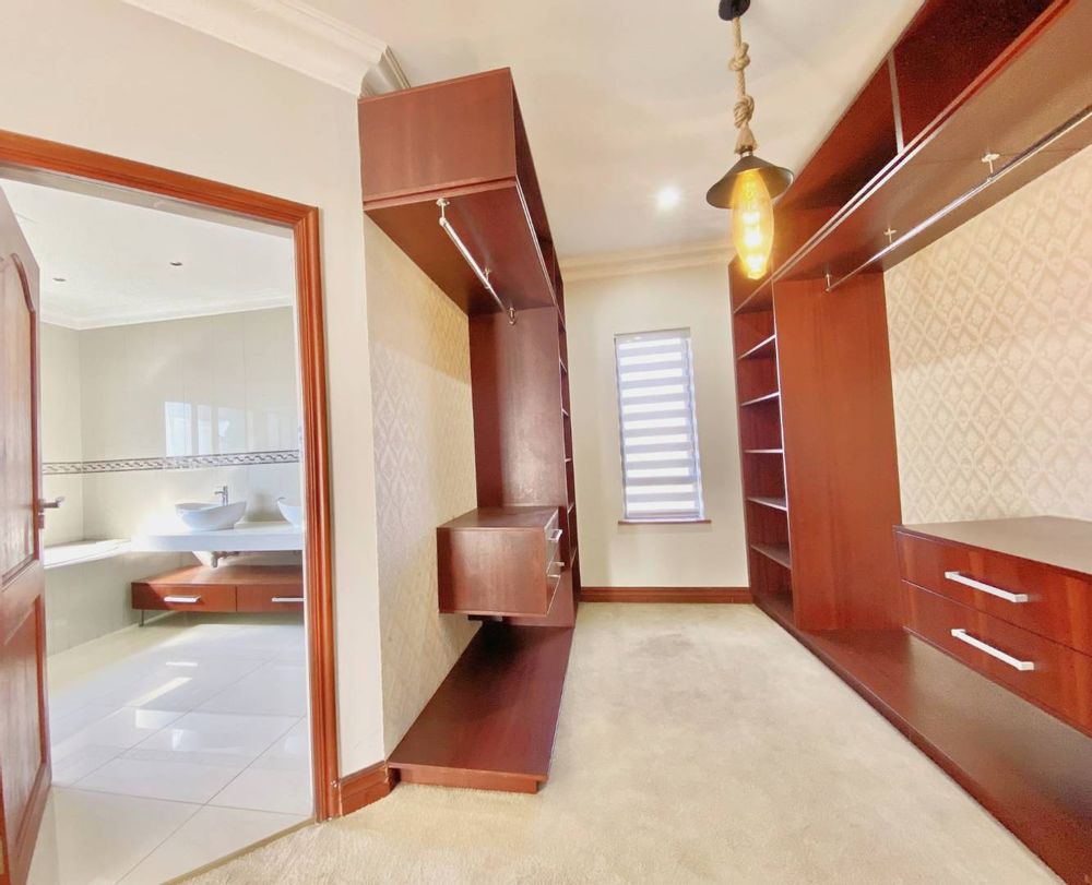 The outdoor area includes staff quarters with an adjoining toilet and shower. The house also includes three garages, providing ample parking and storage space. It is eco-friendly, equipped with a solar system and gas geysers, contributing to sustainable living.