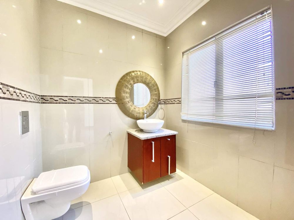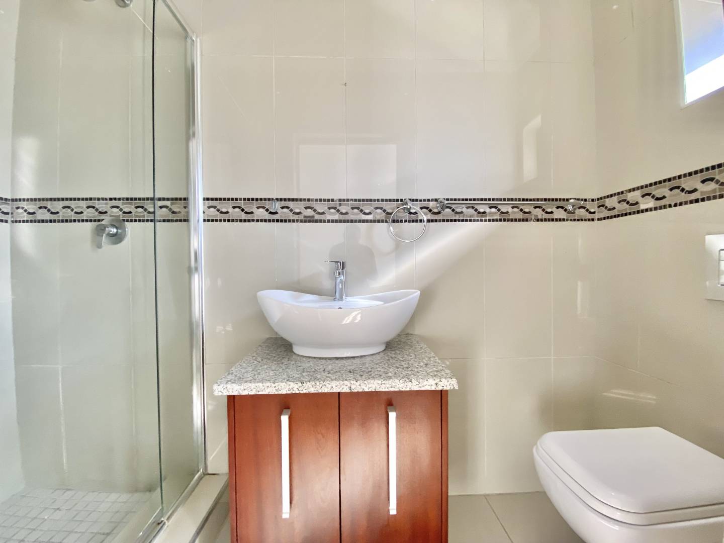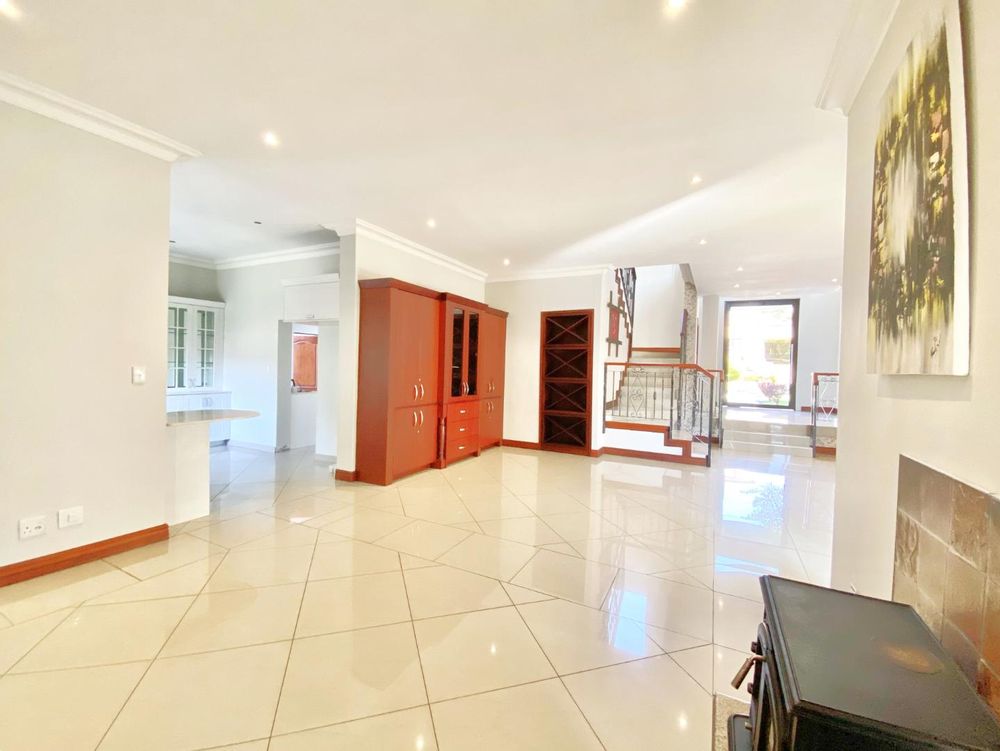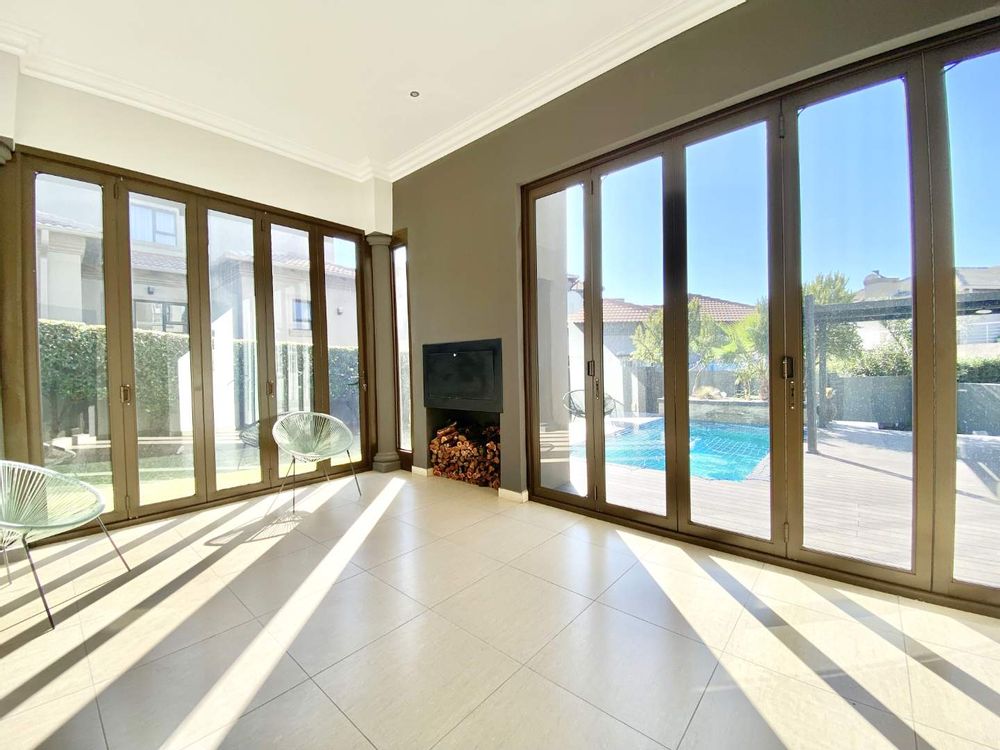 For added convenience, a separate guest toilet with a basin is located downstairs. The patio, equipped with a built-in braai, is enclosed by two sets of stacking aluminium doors. This versatile space opens up to a beautiful pool surrounded by decking, making it perfect for relaxing and entertaining.