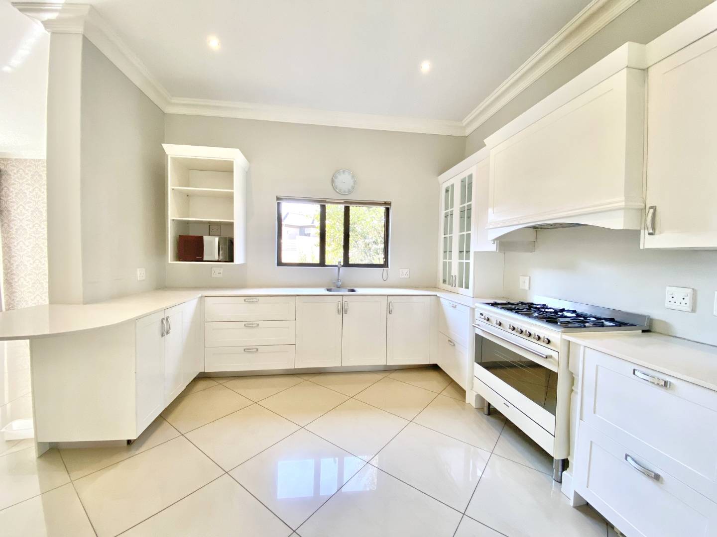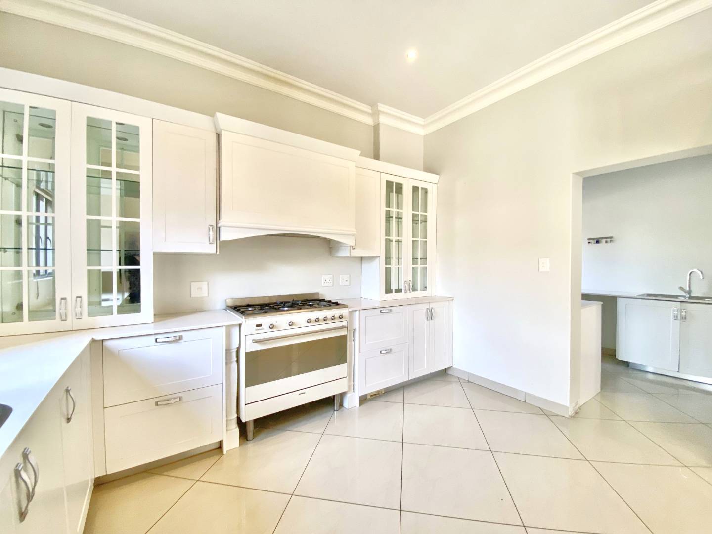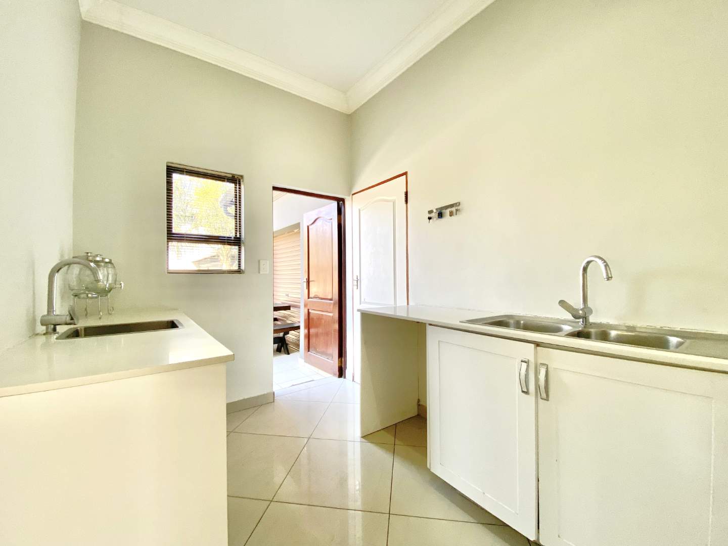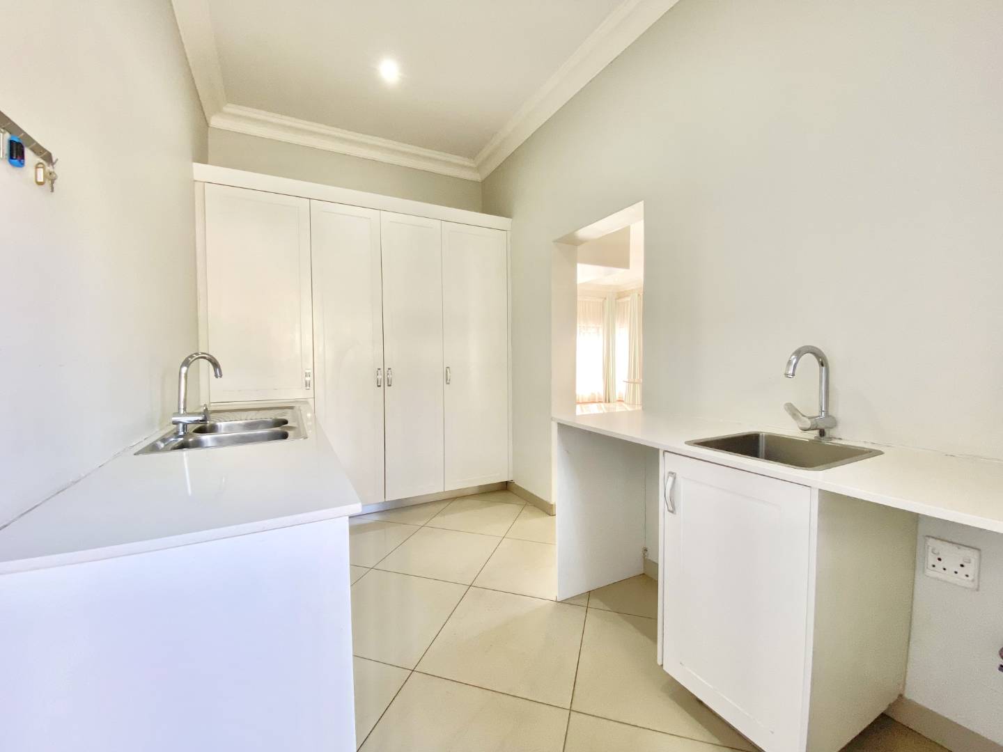 The home boasts an all-white, modern country-style U-shaped kitchen, complete with a countertop overhang ideal for a breakfast bar and also features a multi-plate gas stove. The kitchen is also equipped with multiple sinks, including a prep sink, and in the scullery, a double sink and a single laundry sink. This setup makes the kitchen a functional space that also caters to culinary needs.