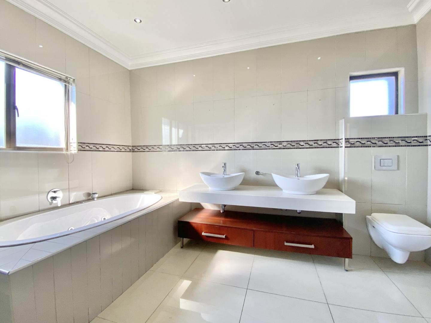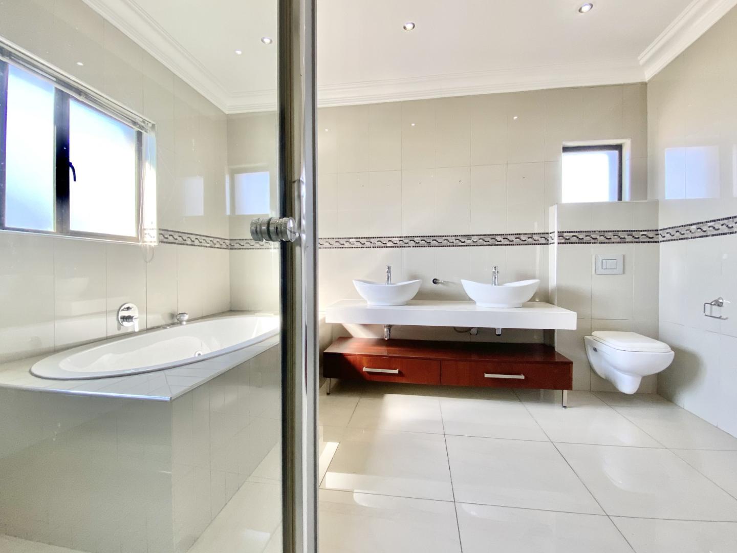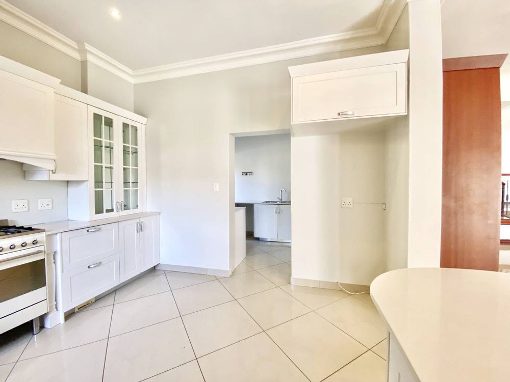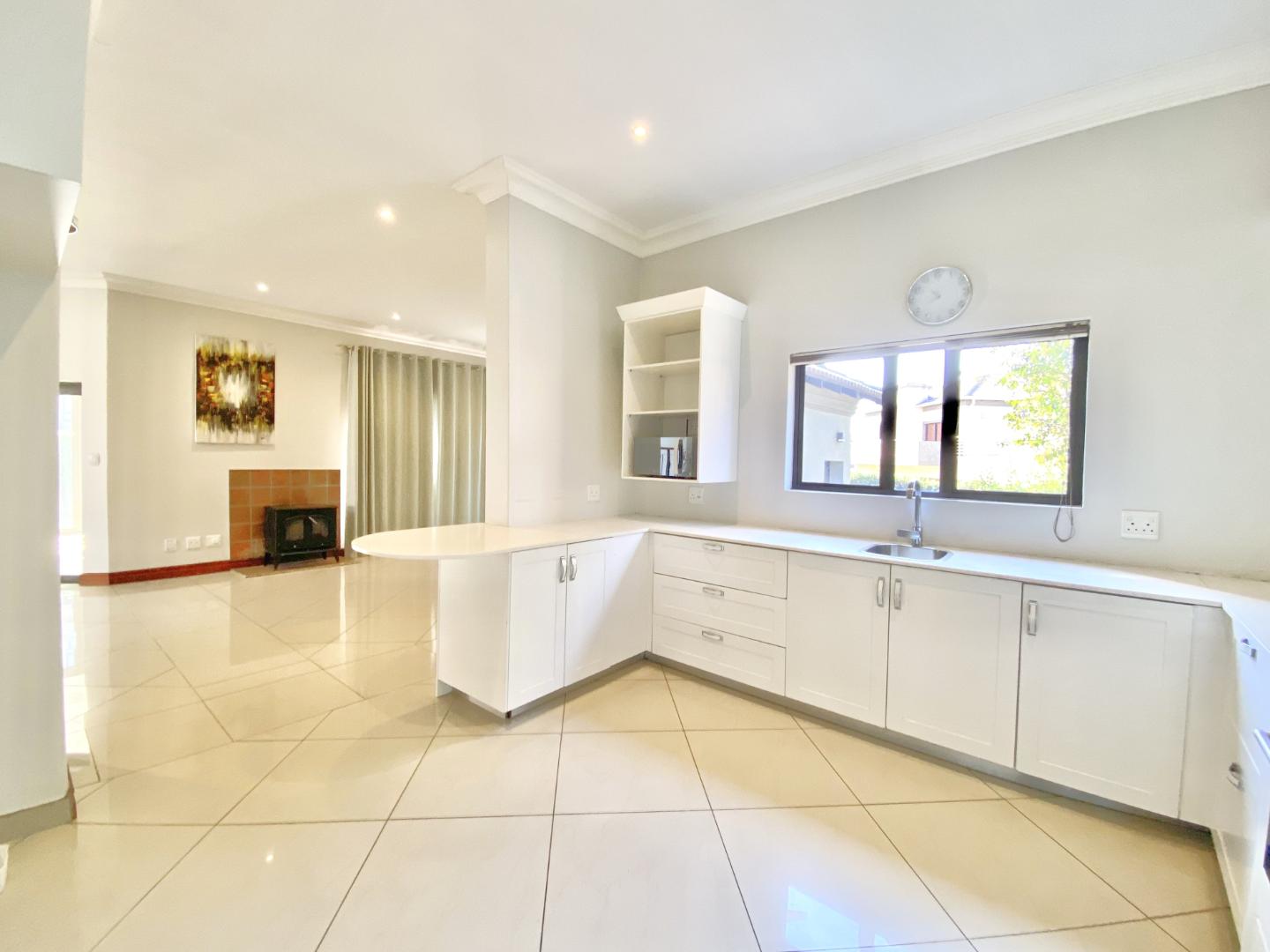 The home boasts an all-white, modern country-style U-shaped kitchen, complete with a countertop overhang ideal for a breakfast bar and also features a multi-plate gas stove. The kitchen is also equipped with multiple sinks, including a prep sink, and in the scullery, a double sink and a single laundry sink. This setup makes the kitchen a functional space that also caters to culinary needs.