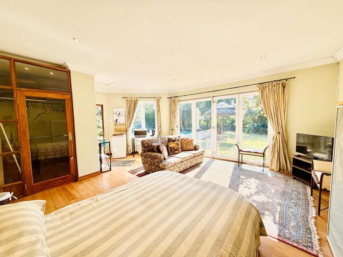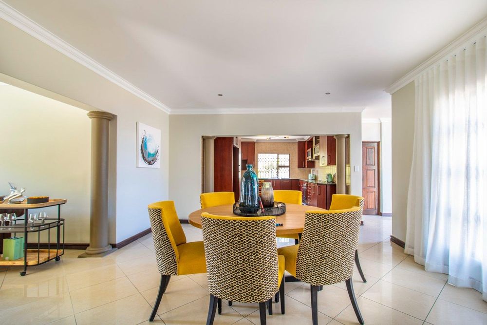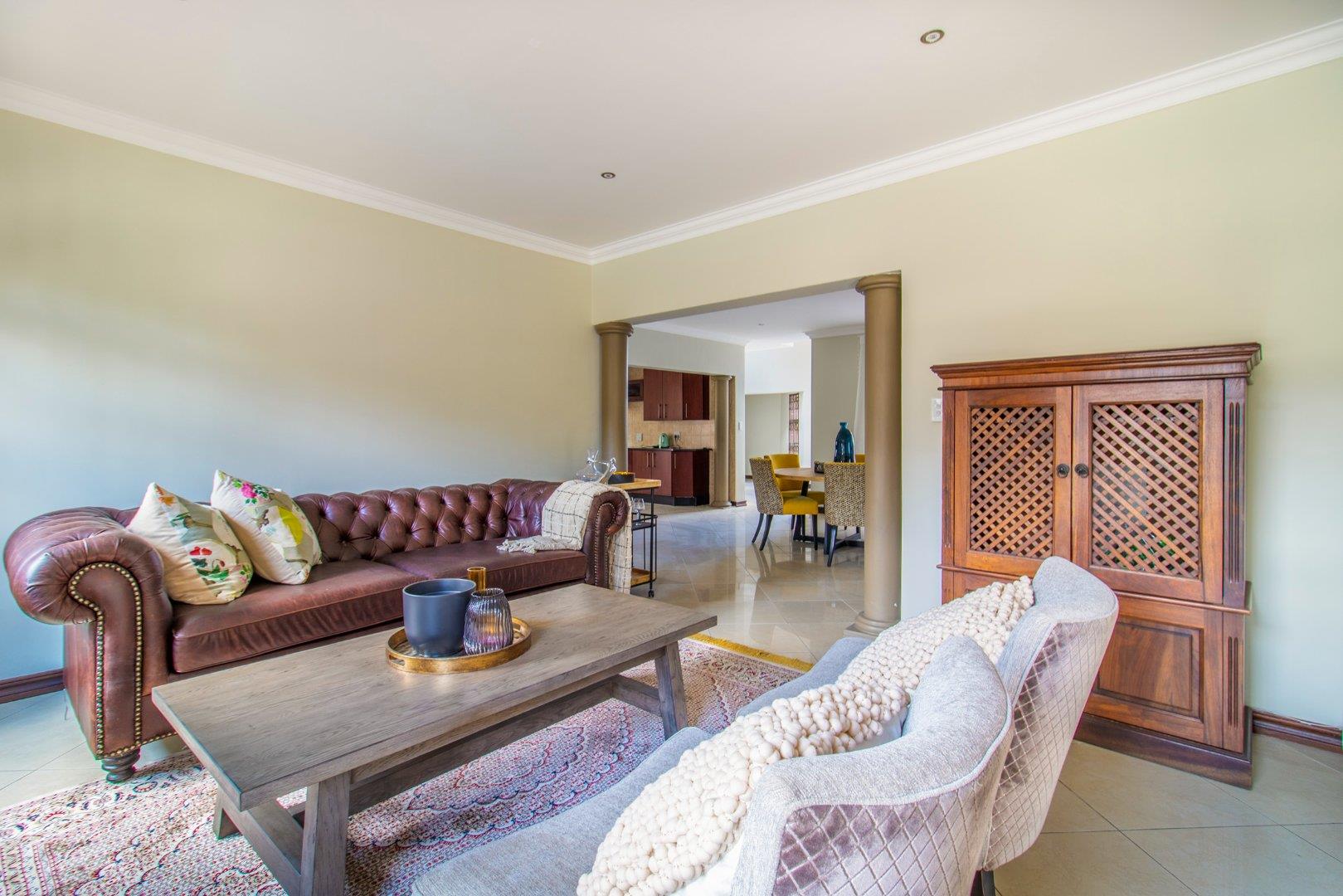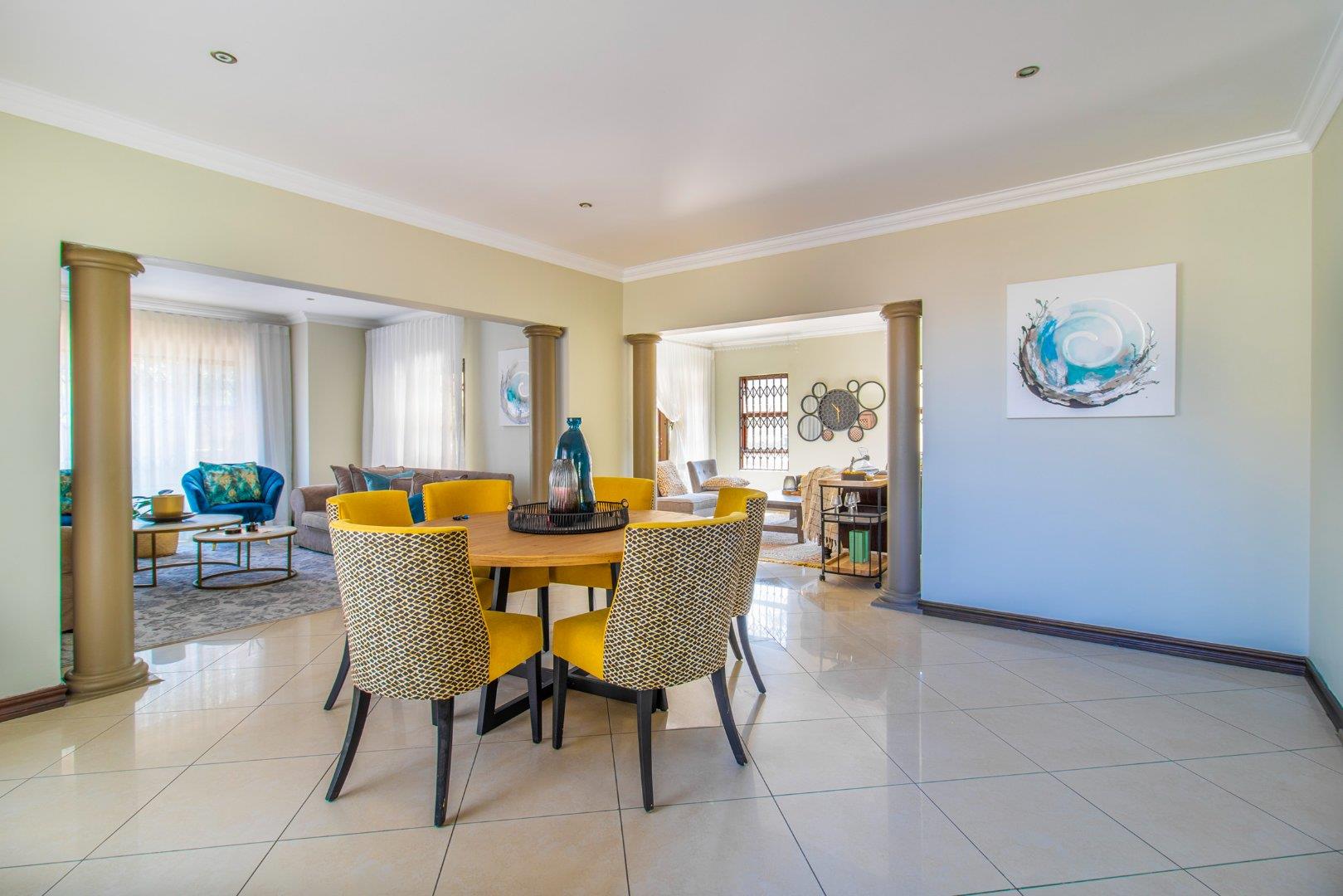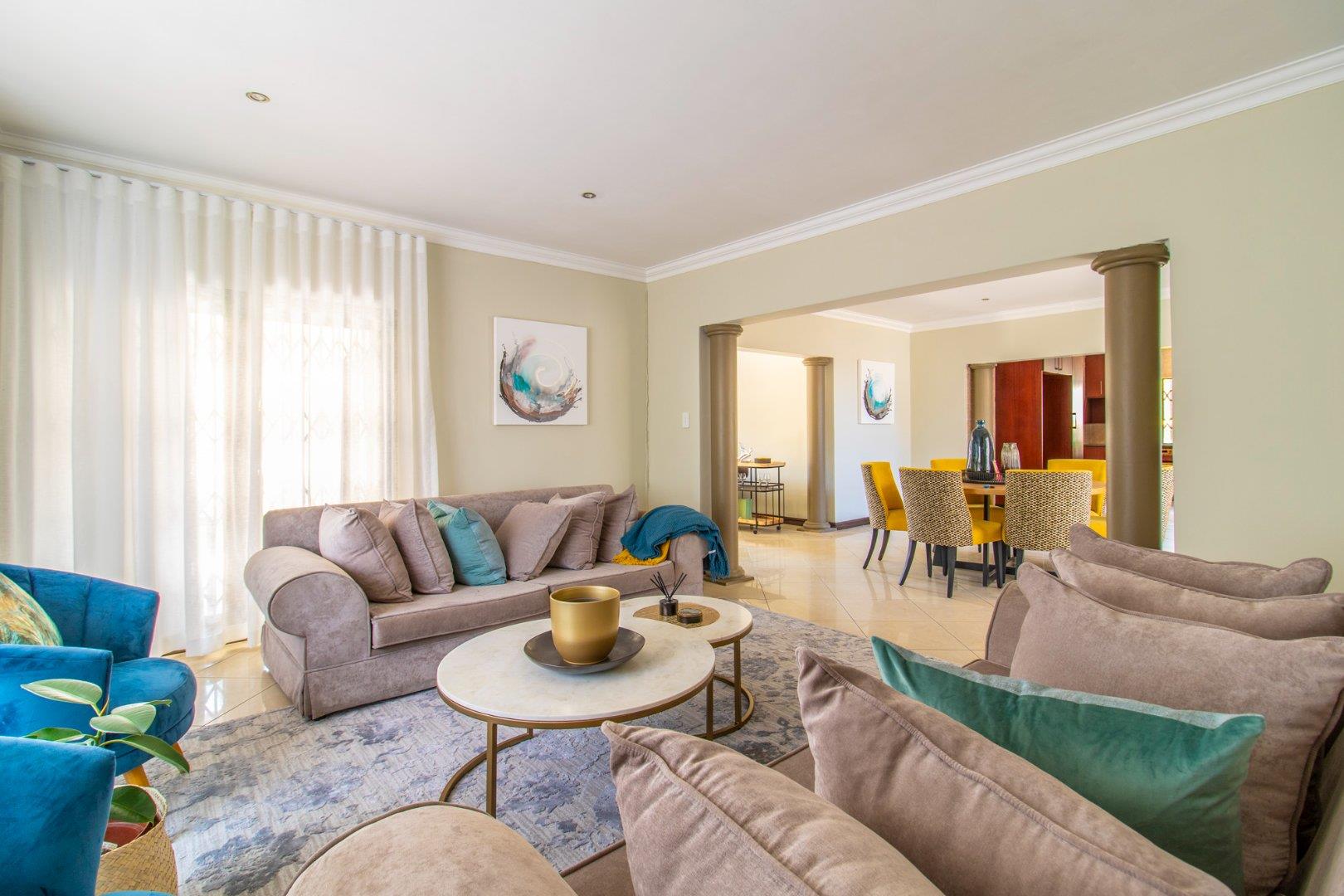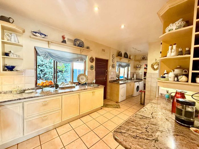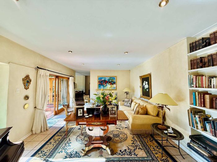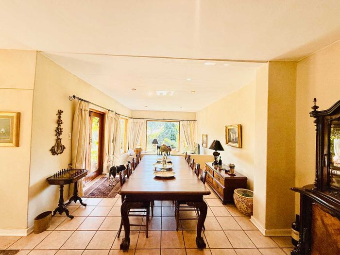 As you enter this stunning residence, you are welcomed by a spacious entrance hall that seamlessly flows into an expansive dining area and a grand formal living room. The formal living space transitions effortlessly to a cosy family room and a charming patio, featuring a built-in braai. This area is perfect for entertaining guests while enjoying serene views of the beautifully landscaped, low-maintenance garden and the sparkling swimming pool.