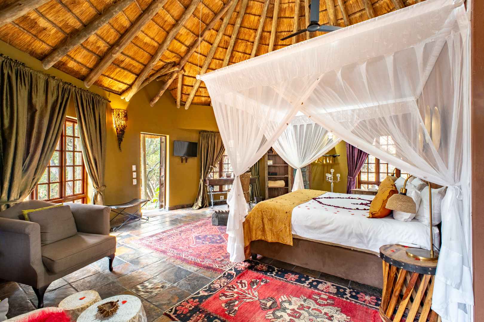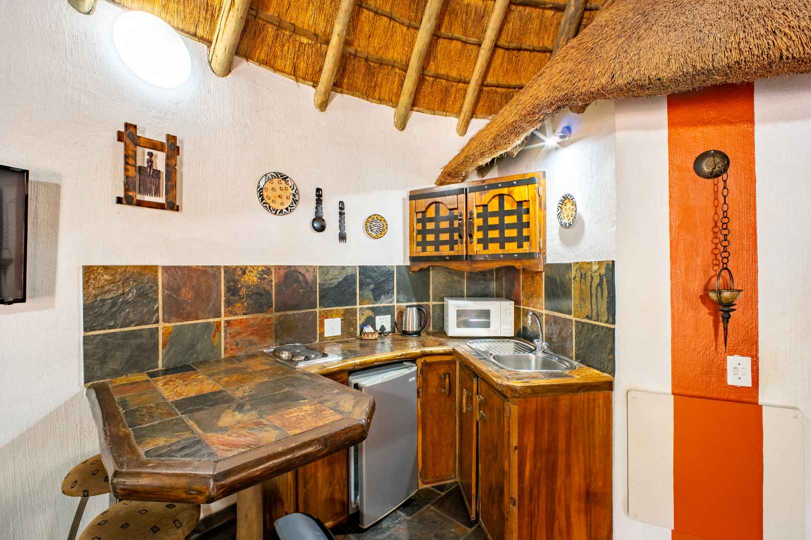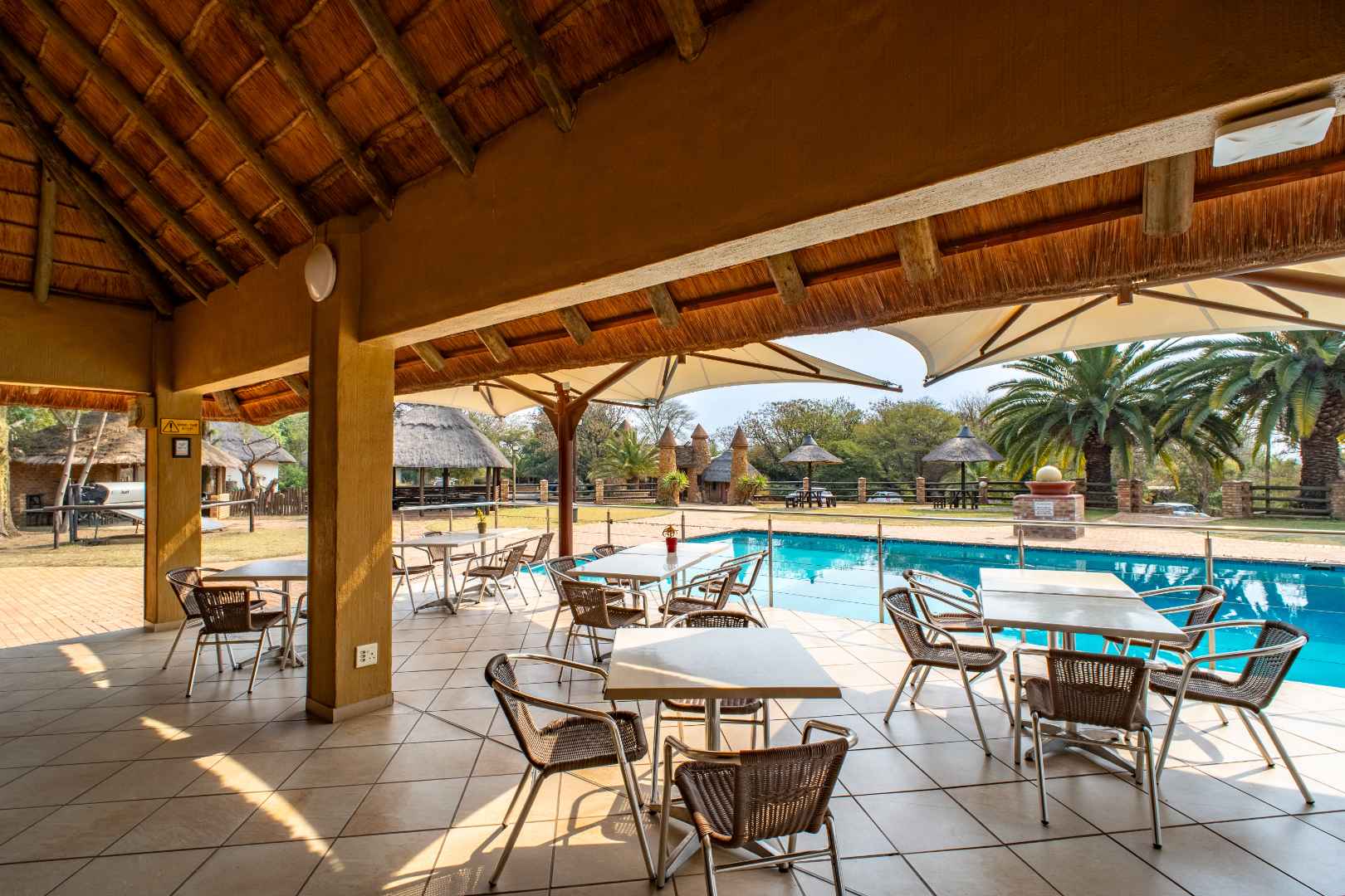 - 13 Thatched Chalets: Elegantly decorated with African flair, featuring energy-efficient thermo-insulated flooring for year-round comfort.