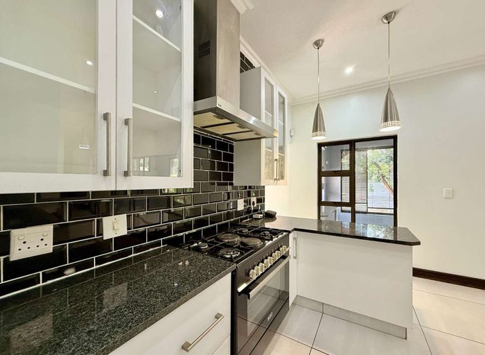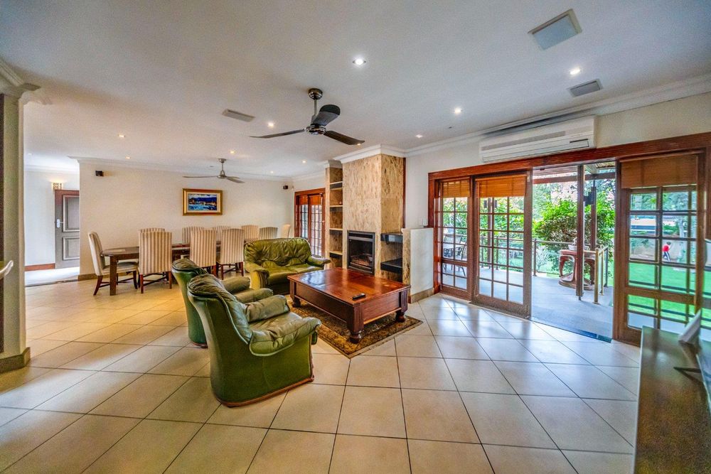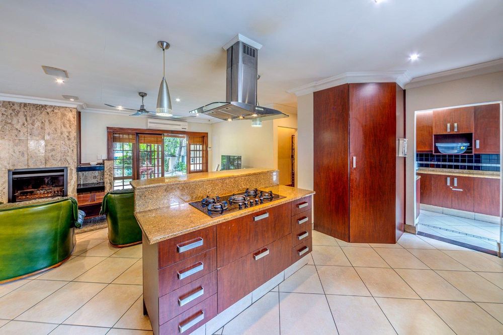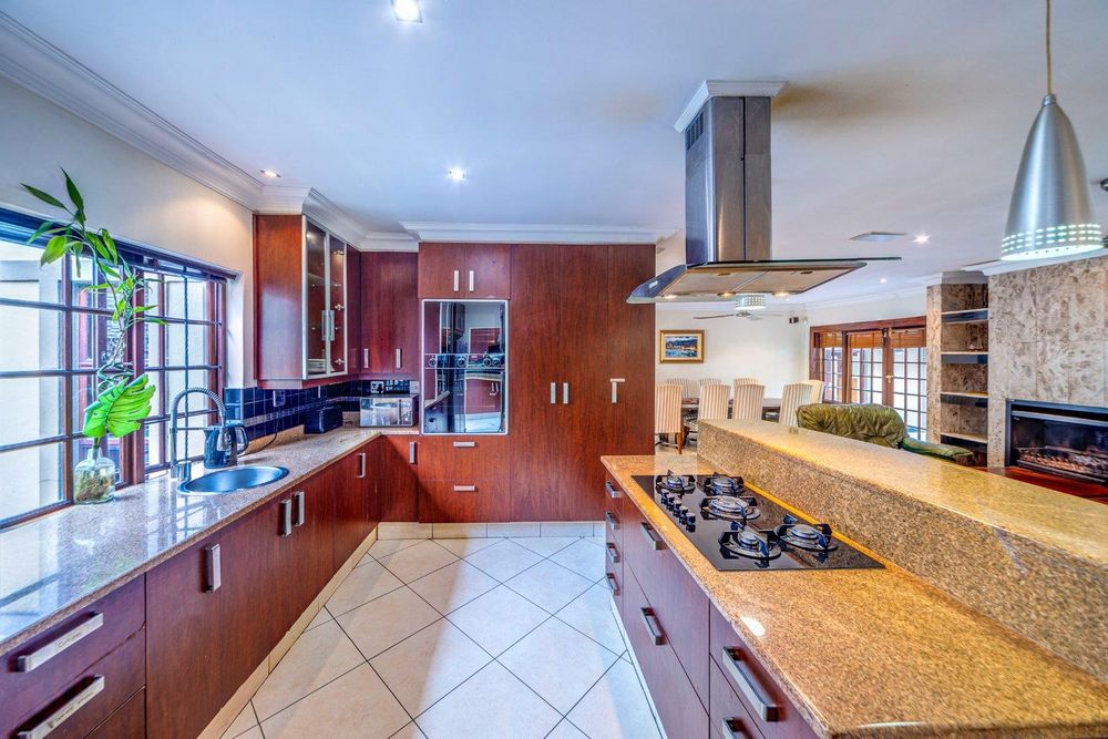 The heart of the home is the modern kitchen with a spacious layout, overlooking the open-plan living and dining areas. Equipped with granite countertops, a large gas stove, and an electrical oven, this kitchen is perfect for culinary enthusiasts. The open-plan TV room features a cosy fireplace while the separate living area offers versatility to be used as a formal lounge, office space, or any desired purpose. A separate study with built-in desk and bookshelves adds functionality to the space.