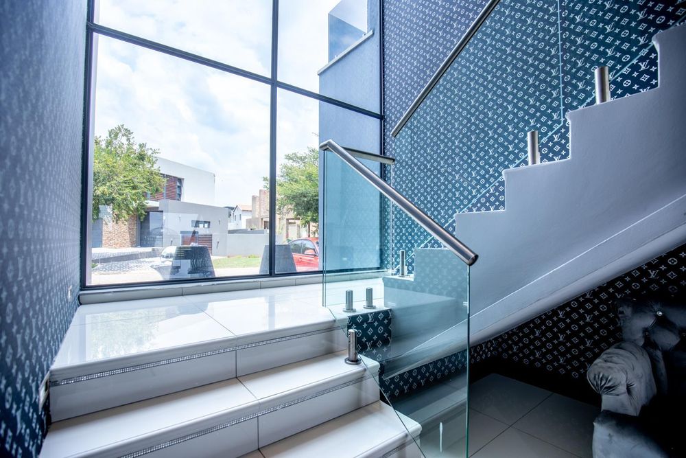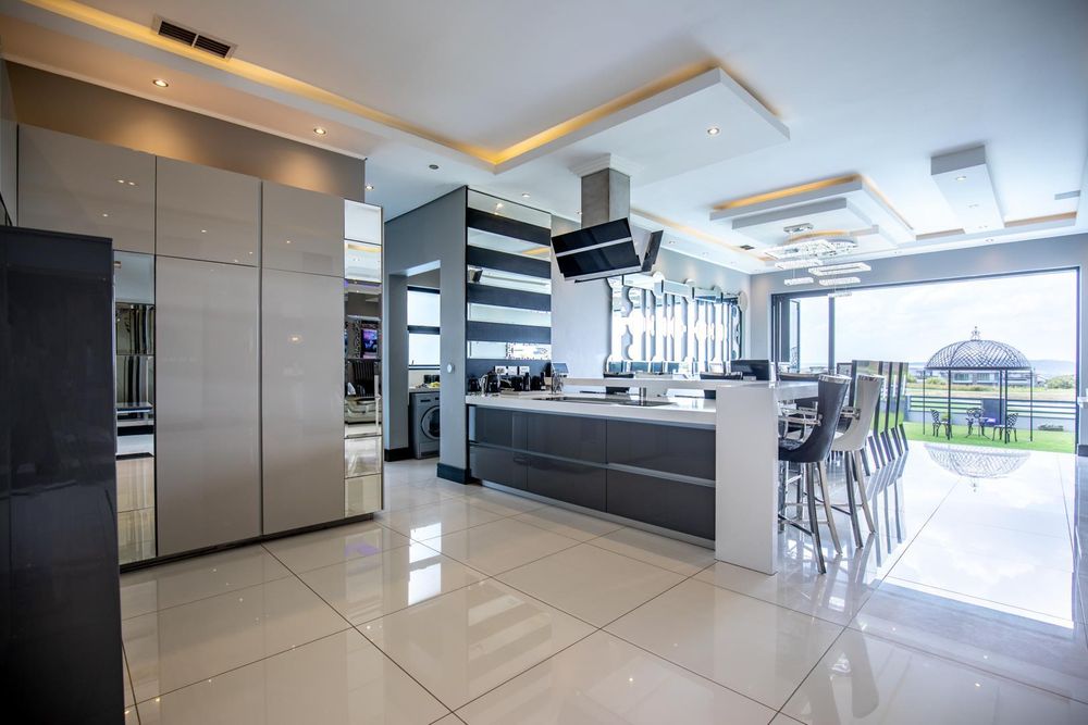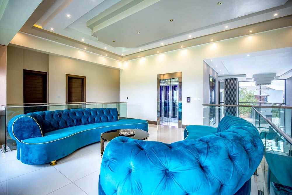 5 of the 6 opulent bedrooms are located on the top floor, all en suite, with ample cupboards and all with their bespoke finishes and designer look. A TV lounge upstairs enjoys the views of the living spaces. The houses also offers a prayer room, domestic quarters and additional gardener room outside as well as 4 garages.