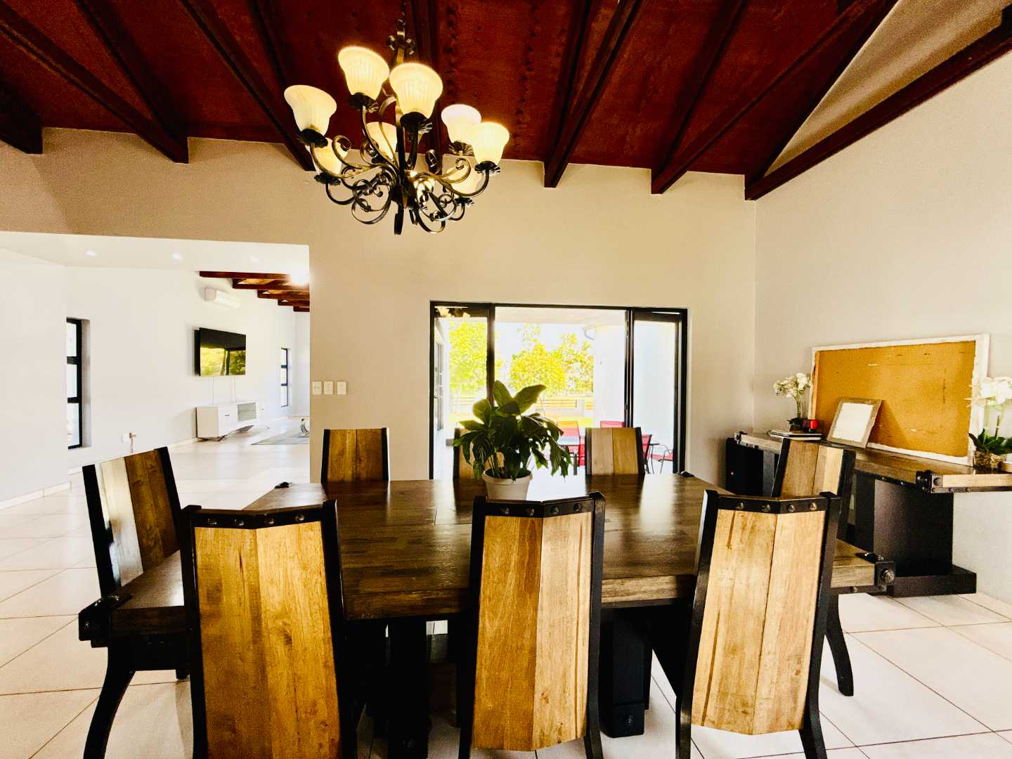 The heart of the home is an expansive open-plan living area, including a modern kitchen, dining room, TV lounge, and cozy living space all seamlessly flowing together. Large sliding doors lead to a generous entertainment patio with a built-in braai, ideal for hosting family and friends while enjoying uninterrupted views of the park and lush greenery.