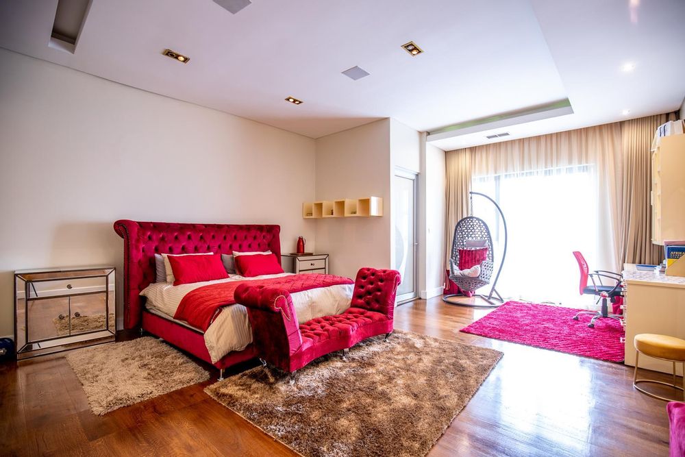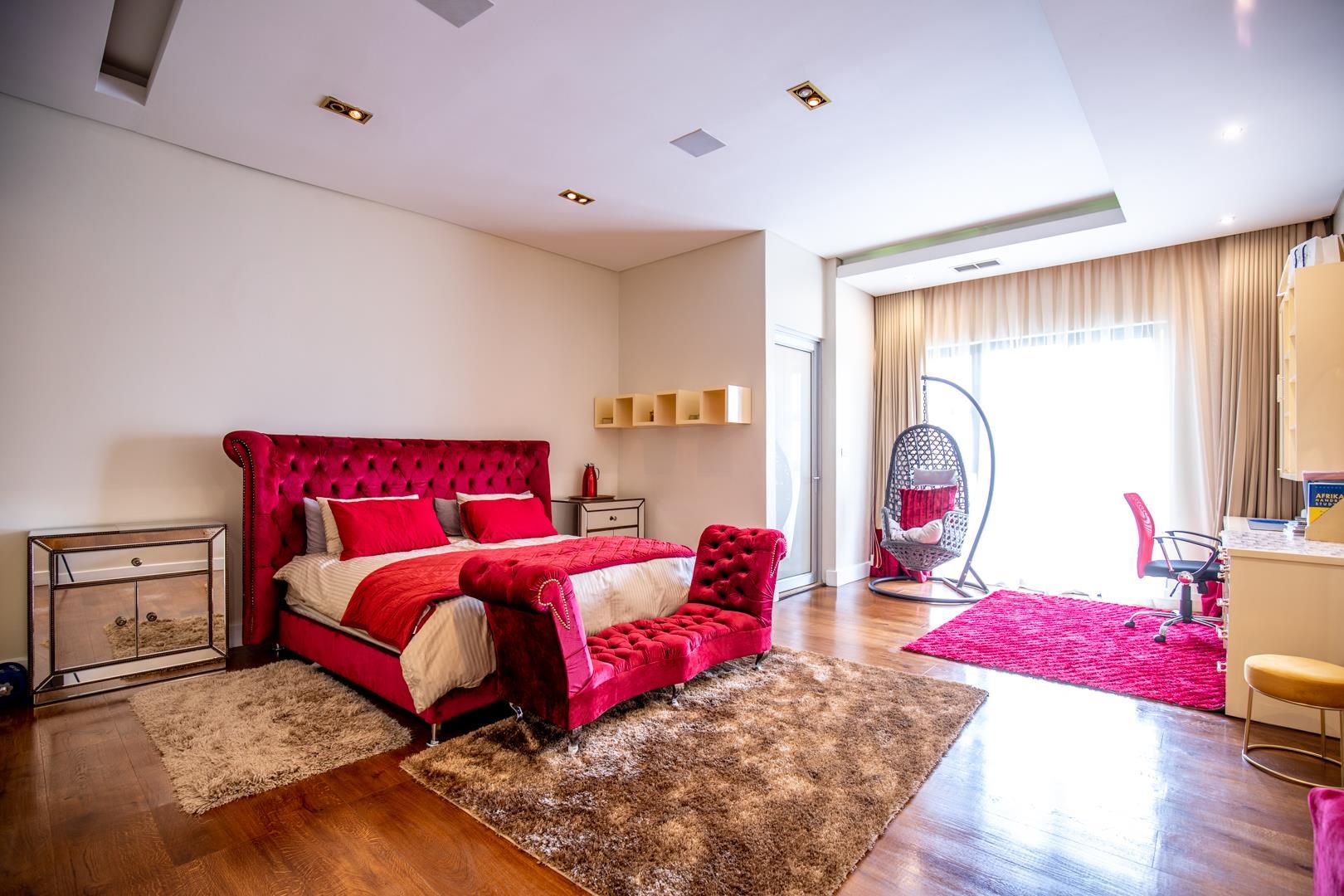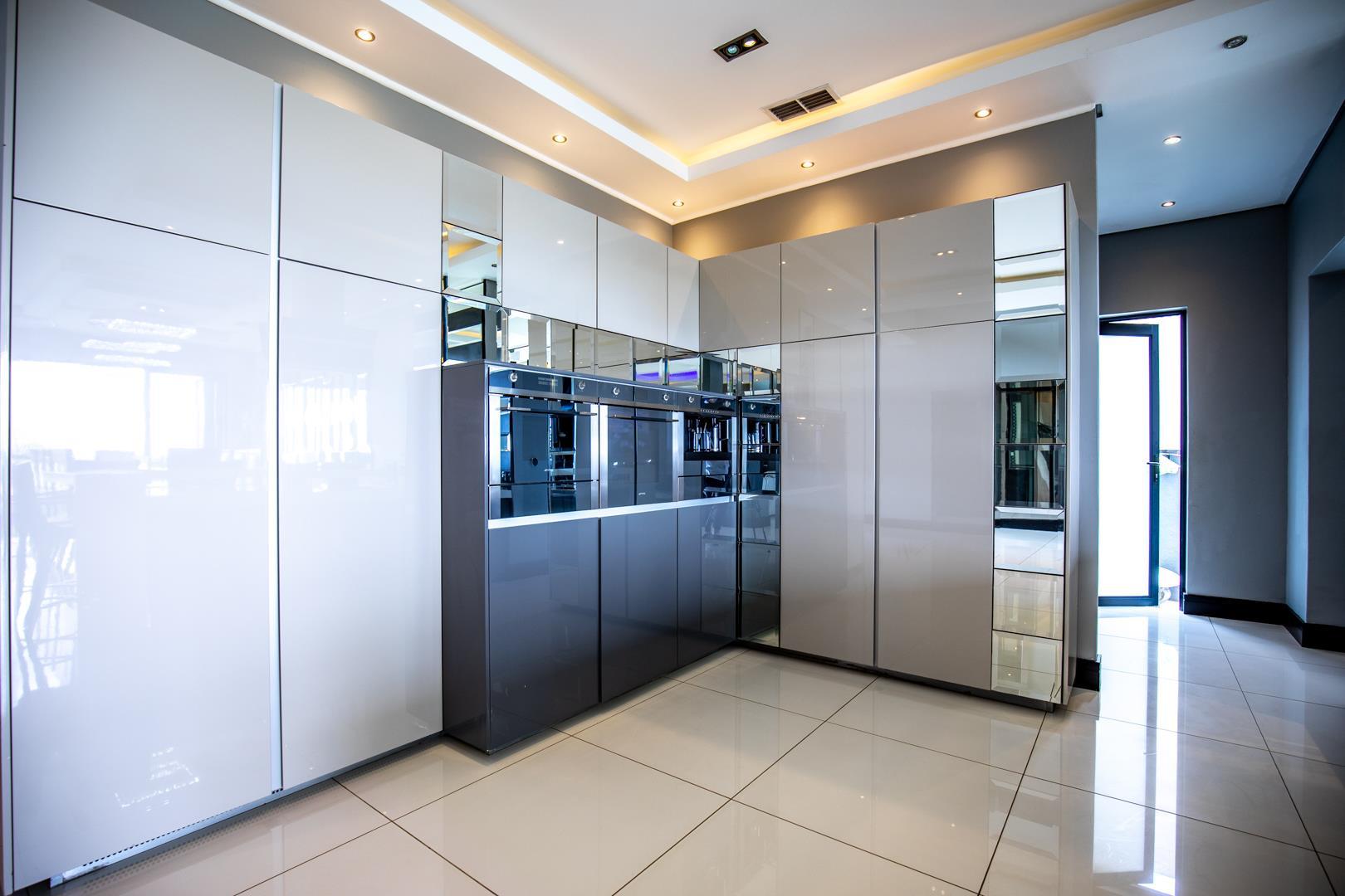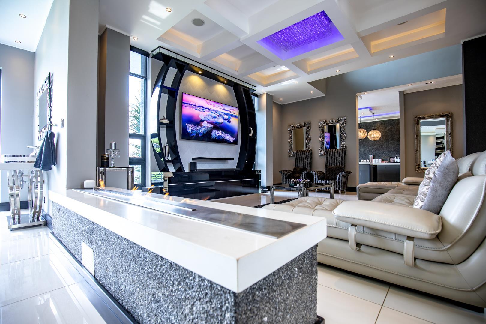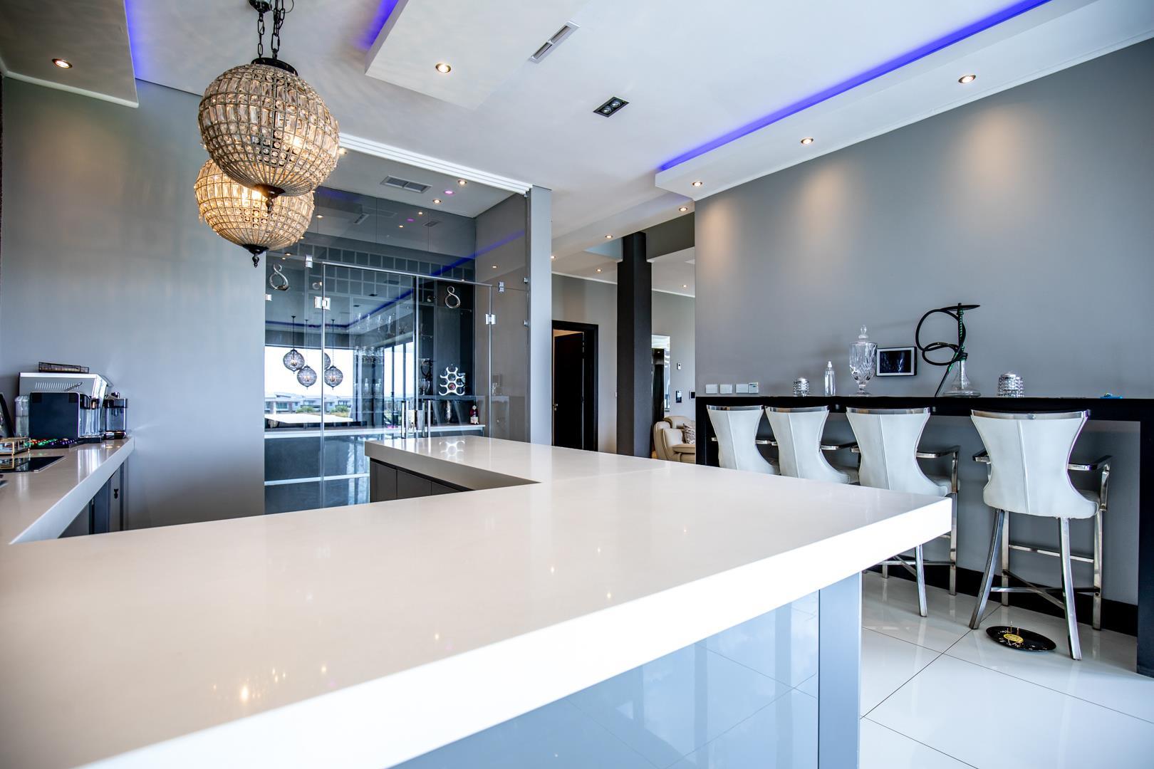 5 of the 6 opulent bedrooms are located on the top floor, all en suite, with ample cupboards and all with their bespoke finishes and designer look. A TV lounge upstairs enjoys the views of the living spaces. The houses also offers a prayer room, domestic quarters and additional gardener room outside as well as 4 garages.