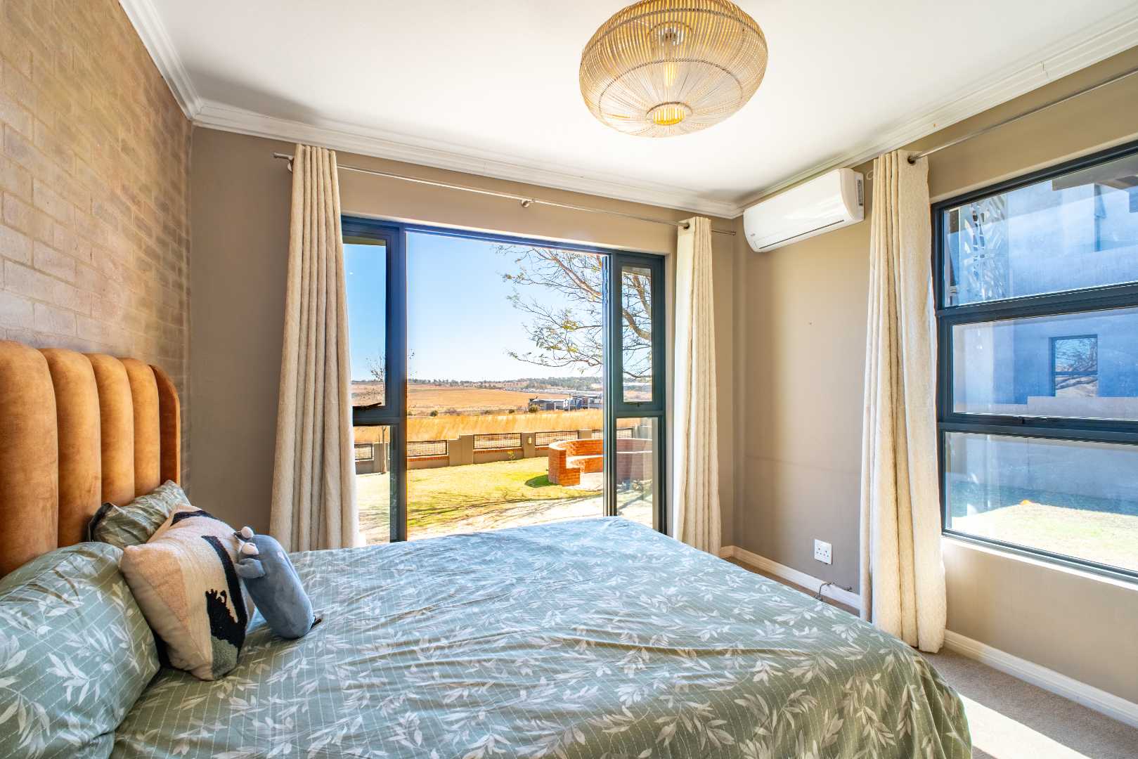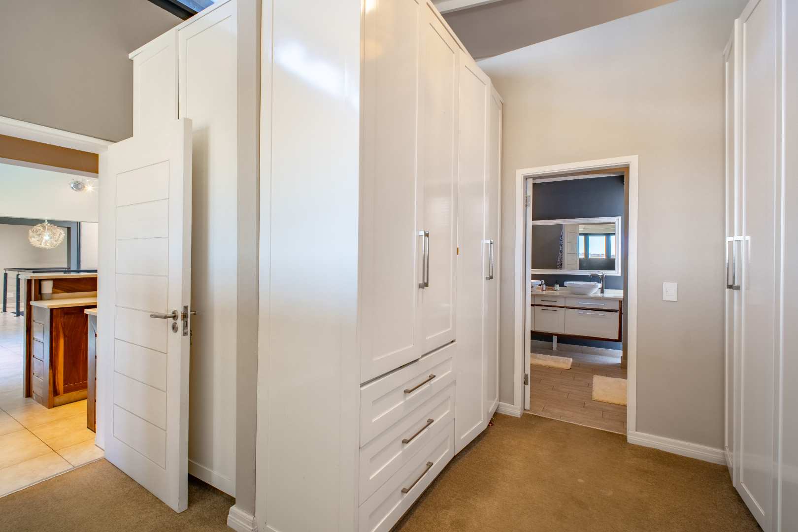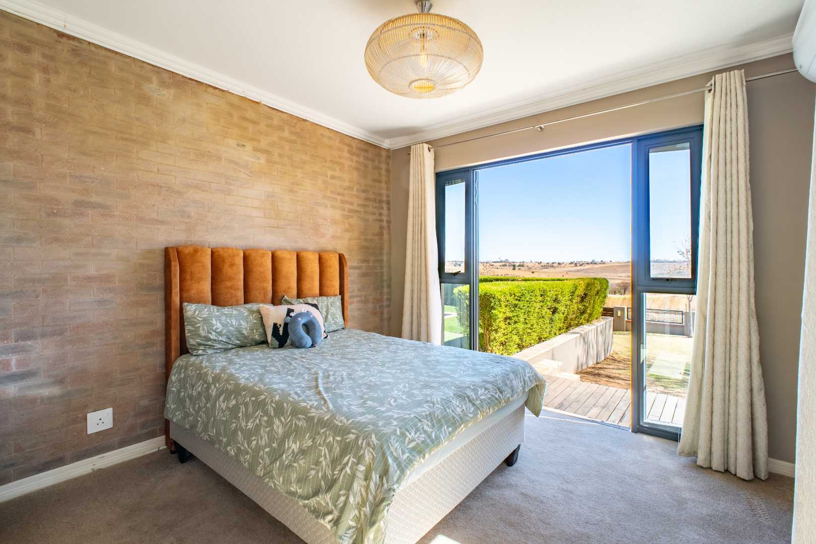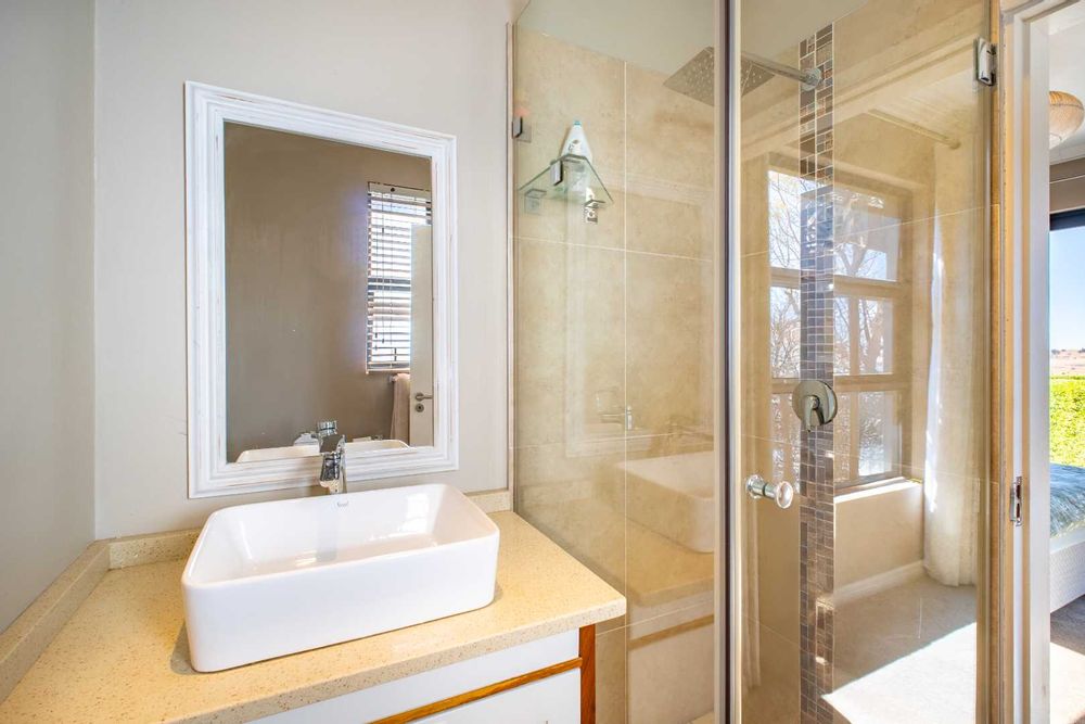 Upstairs, a generously sized Pyjama lounge/entertainment area with a built-in bar sets the scene for memorable evenings. Stacking doors open up to a balcony that captures sweeping views of the garden, golf course, and dam.