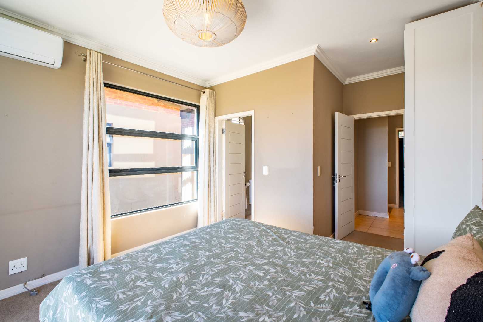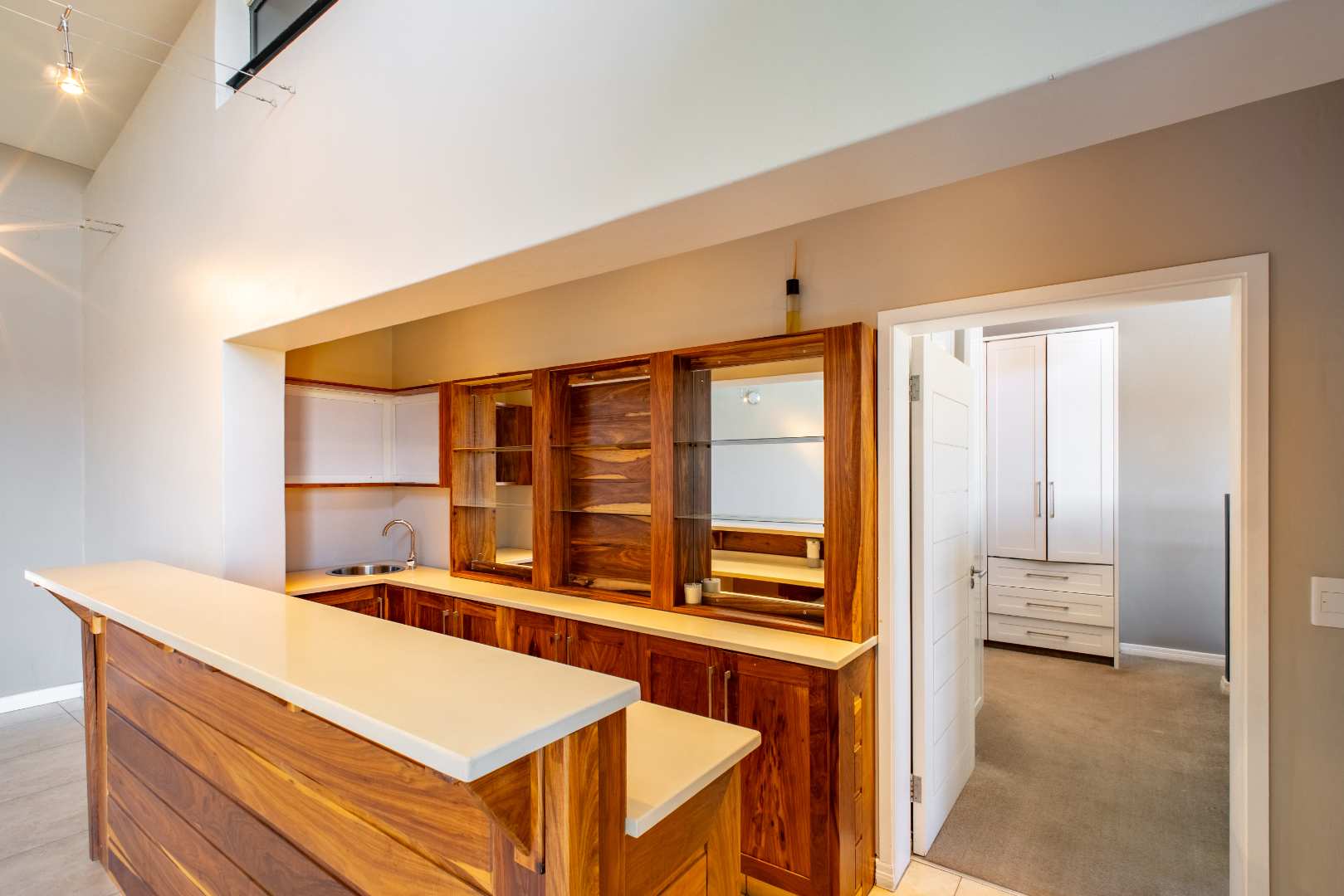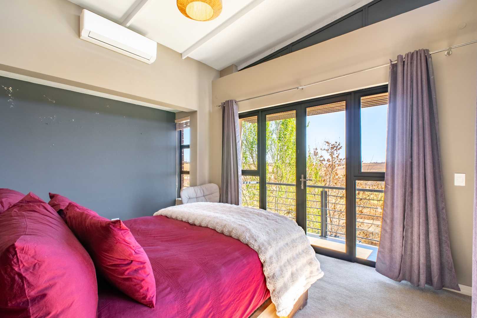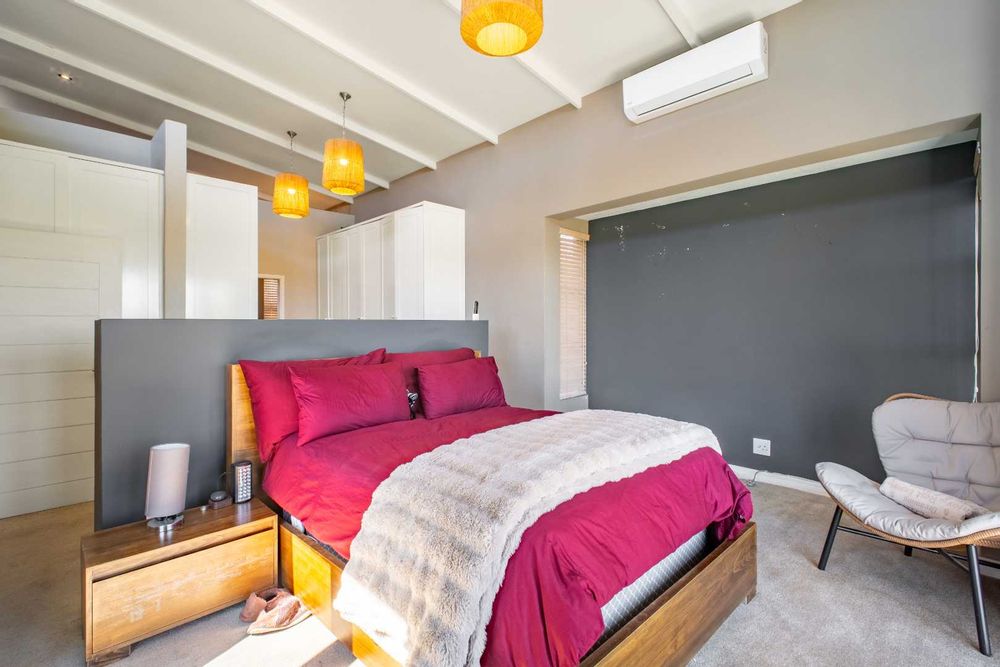 Upstairs, a generously sized Pyjama lounge/entertainment area with a built-in bar sets the scene for memorable evenings. Stacking doors open up to a balcony that captures sweeping views of the garden, golf course, and dam.