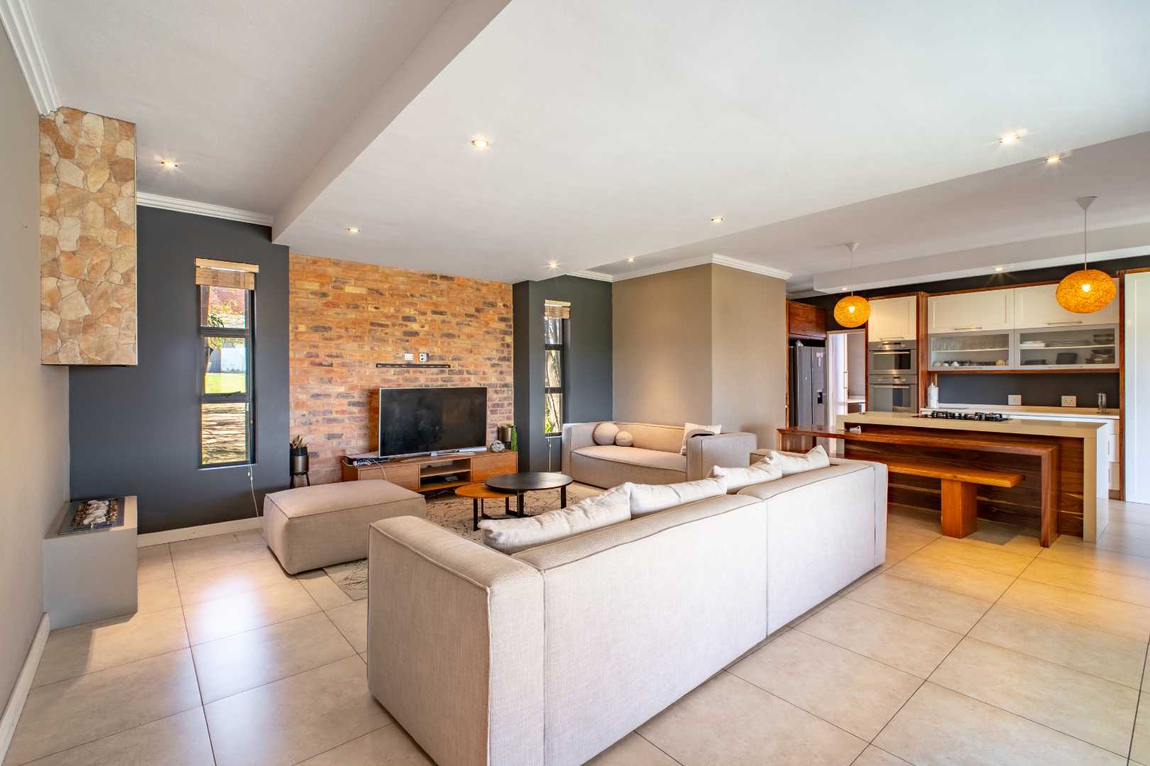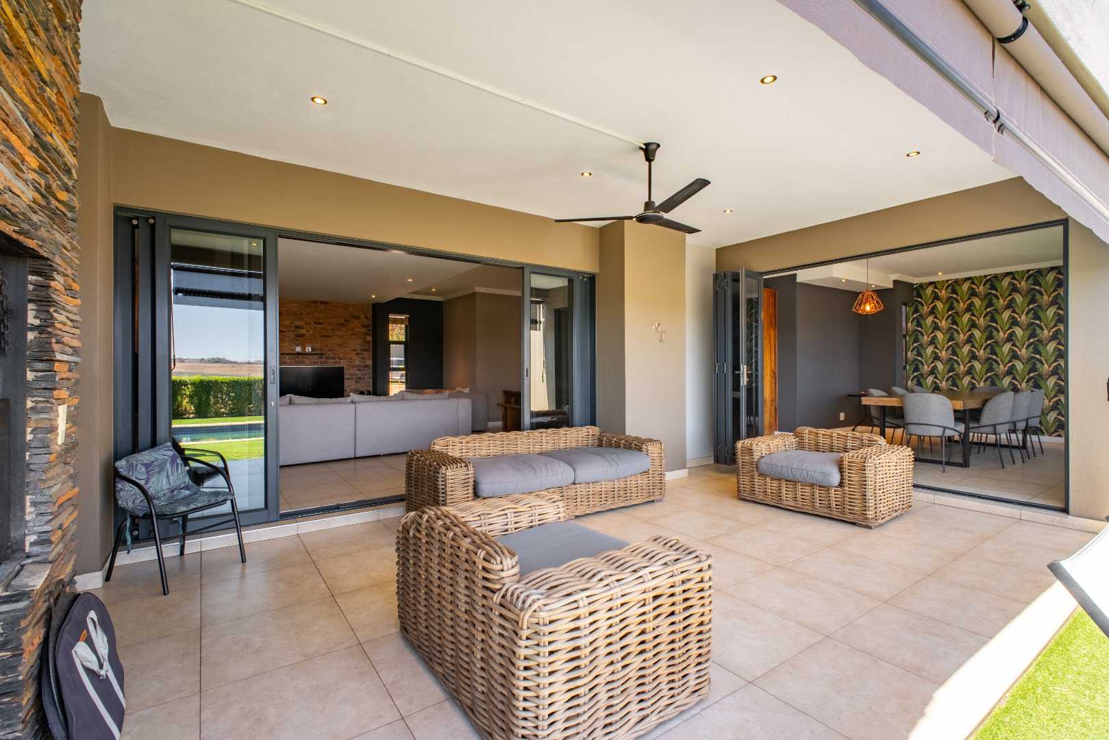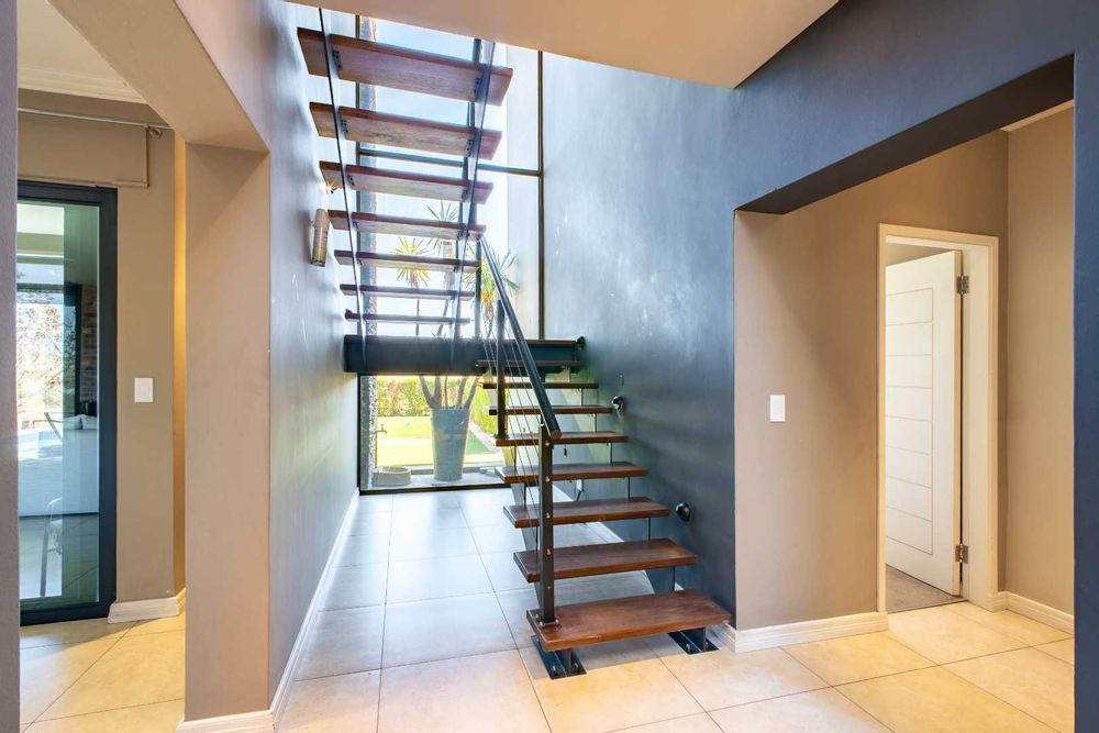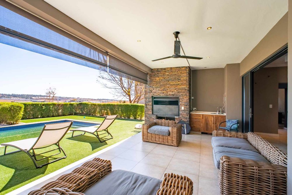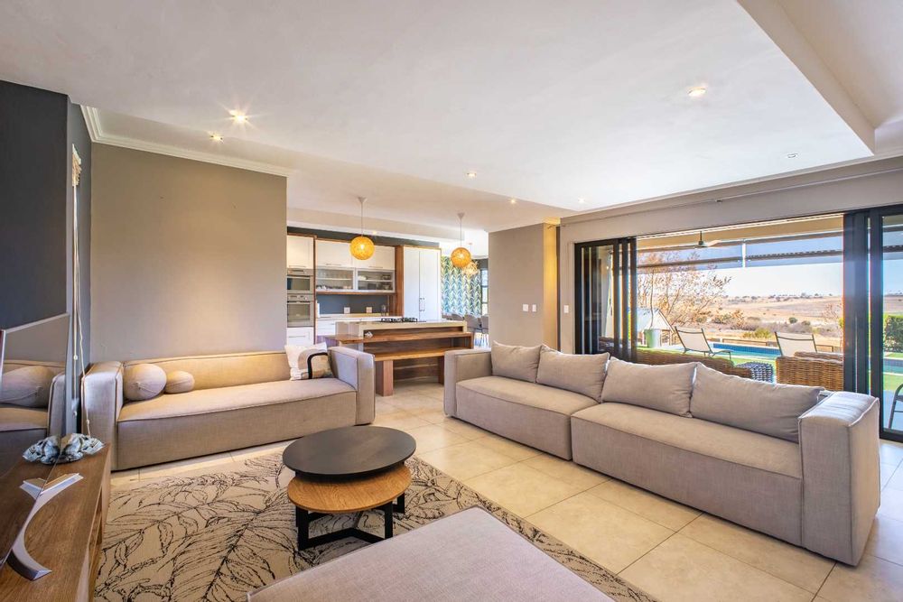 From the moment you enter, the floating staircase sets a contemporary tone. To your left, a light-filled living area flows seamlessly onto a covered patio that is ideal for entertaining.The open-plan layout connects to a modern kitchen and dining space with stack doors that extend to the living area outdoors. The patio overlooks a sparkling pool, expansive garden with artificial grass, and a boma, designed for family gatherings and entertaining under the stars.