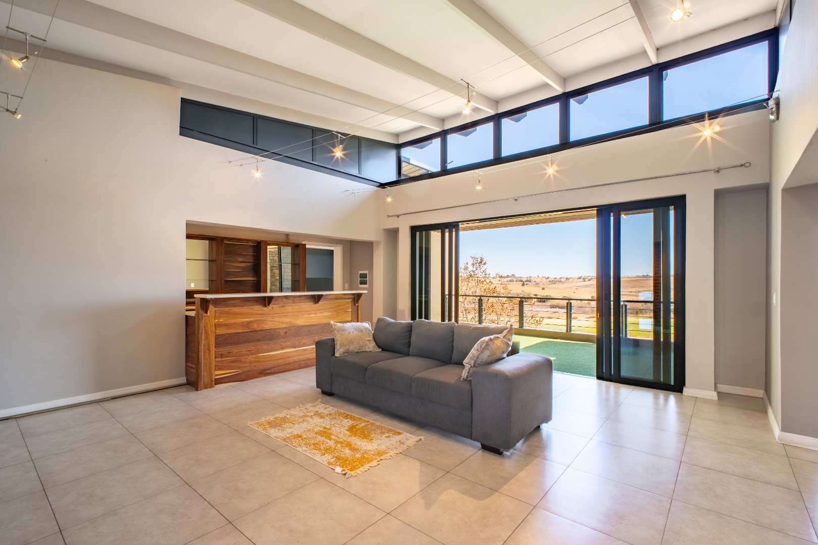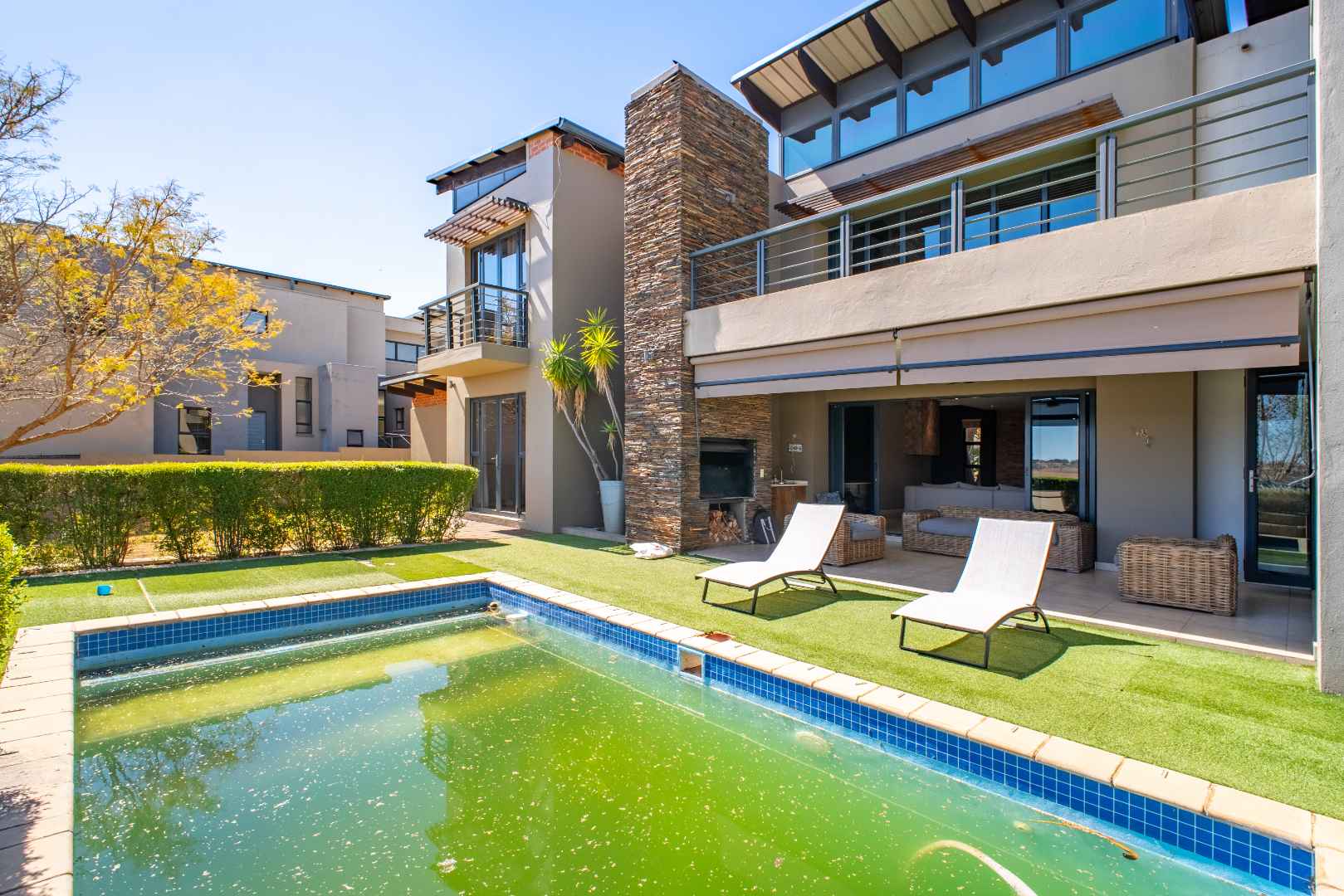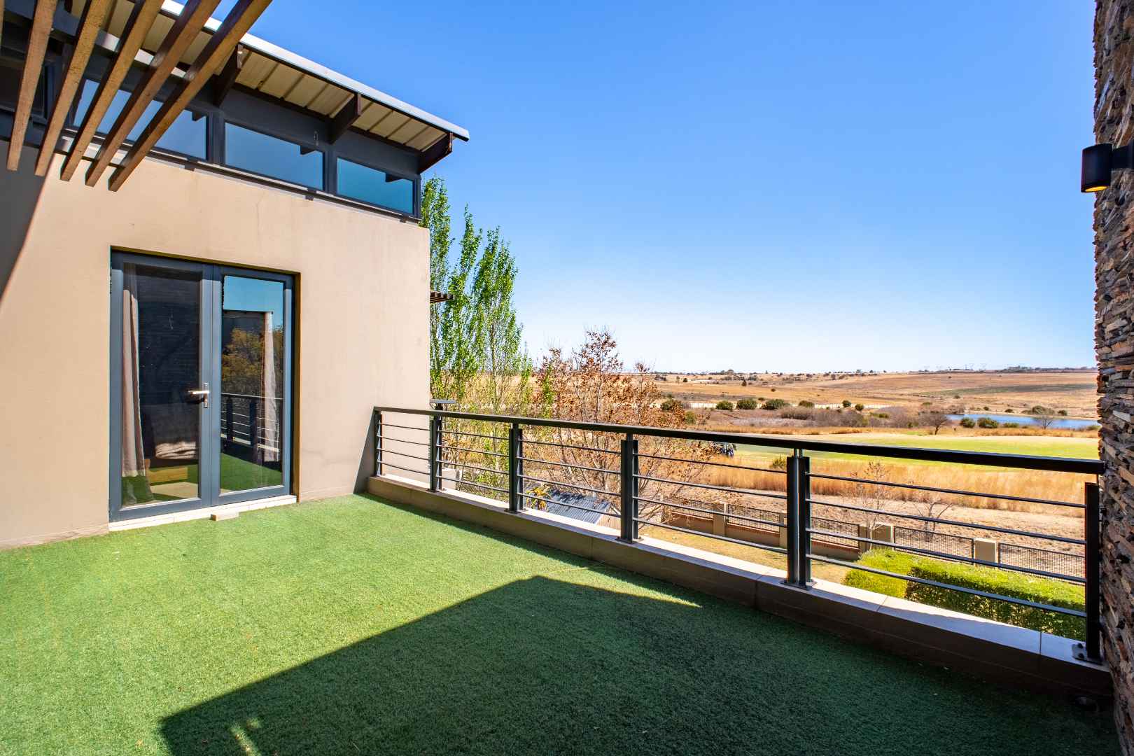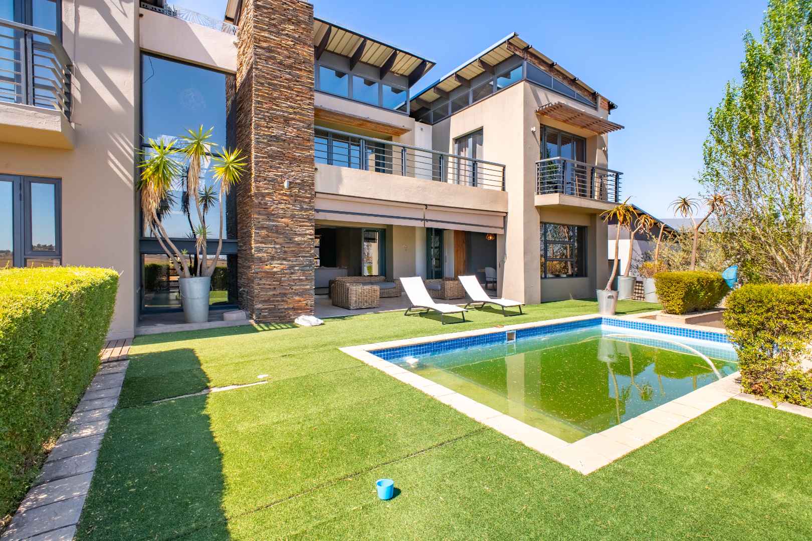 From the moment you enter, the floating staircase sets a contemporary tone. To your left, a light-filled living area flows seamlessly onto a covered patio that is ideal for entertaining.The open-plan layout connects to a modern kitchen and dining space with stack doors that extend to the living area outdoors. The patio overlooks a sparkling pool, expansive garden with artificial grass, and a boma, designed for family gatherings and entertaining under the stars.