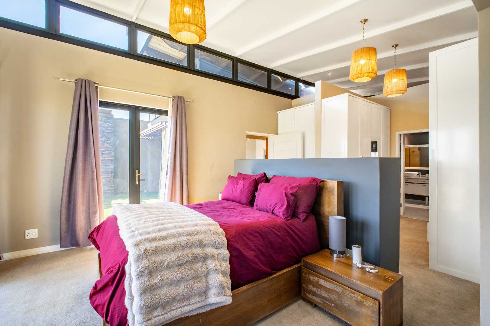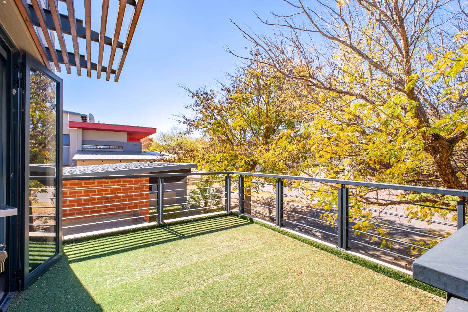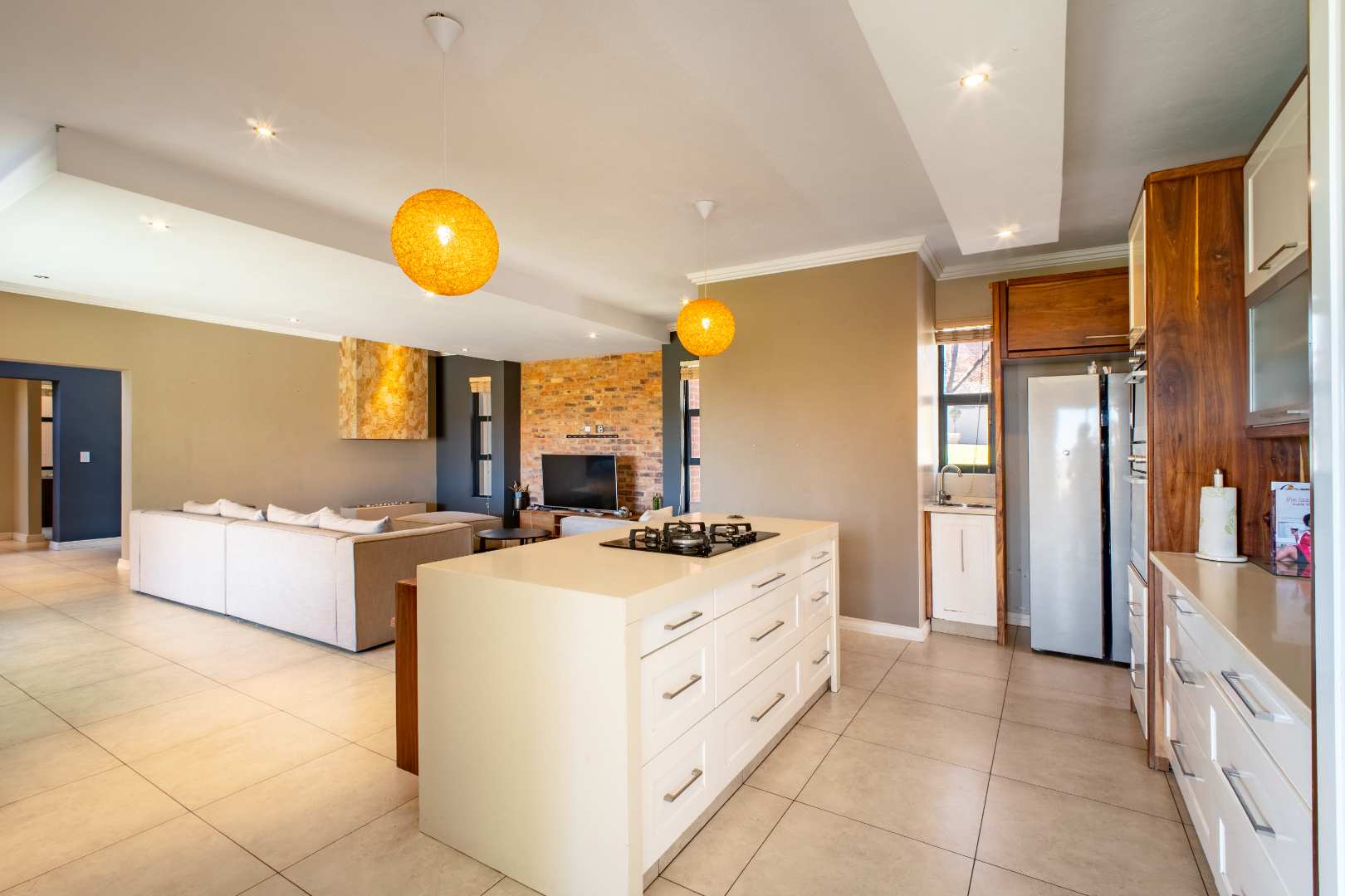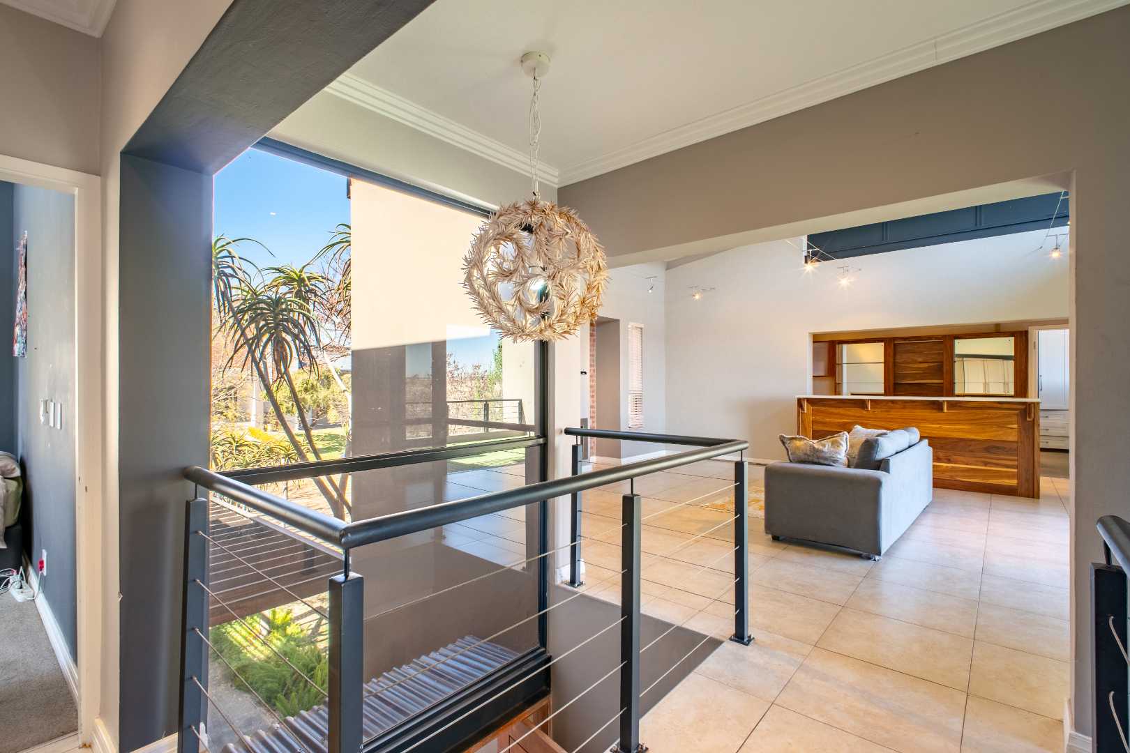 From the moment you enter, the floating staircase sets a contemporary tone. To your left, a light-filled living area flows seamlessly onto a covered patio that is ideal for entertaining.The open-plan layout connects to a modern kitchen and dining space with stack doors that extend to the living area outdoors. The patio overlooks a sparkling pool, expansive garden with artificial grass, and a boma, designed for family gatherings and entertaining under the stars.