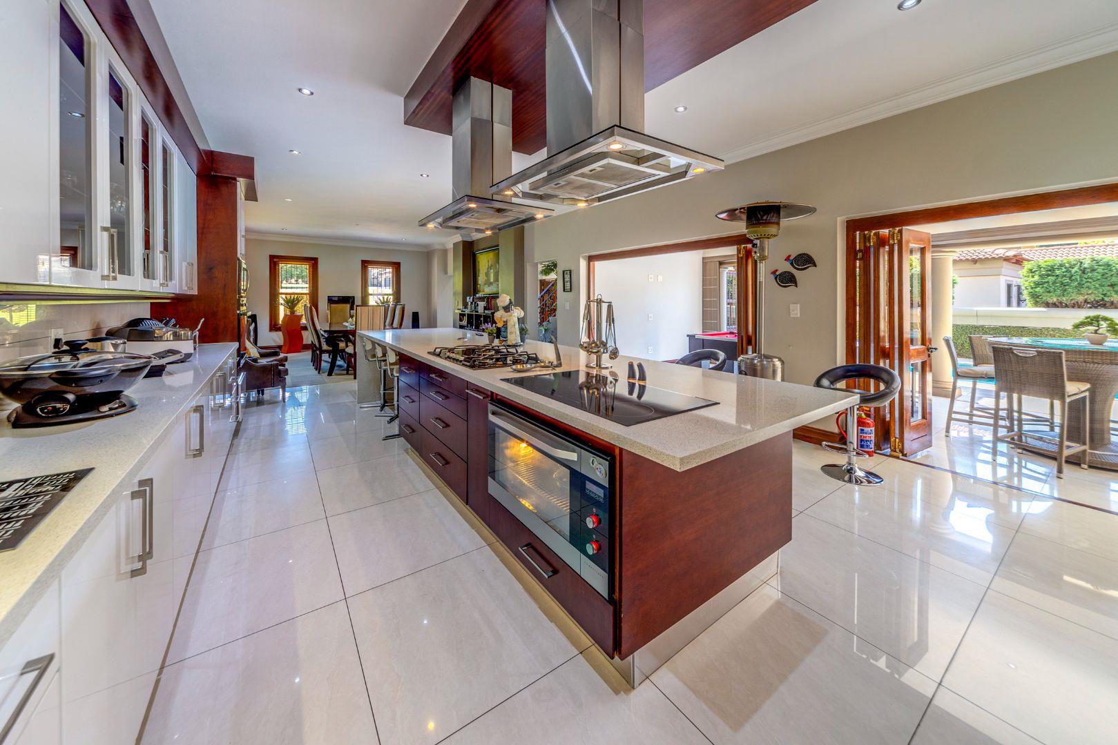 As you step through the impressive wooden entrance, the home unfolds into a spacious entertainment area and TV lounge that seamlessly extend to a heated pool, creating an ideal space for relaxation and social gatherings. The modern kitchen is a chef's dream, fitted with top-tier appliances and opening onto a patio with a built-in barbecue, perfect for outdoor dining and overlooking the inviting pool.