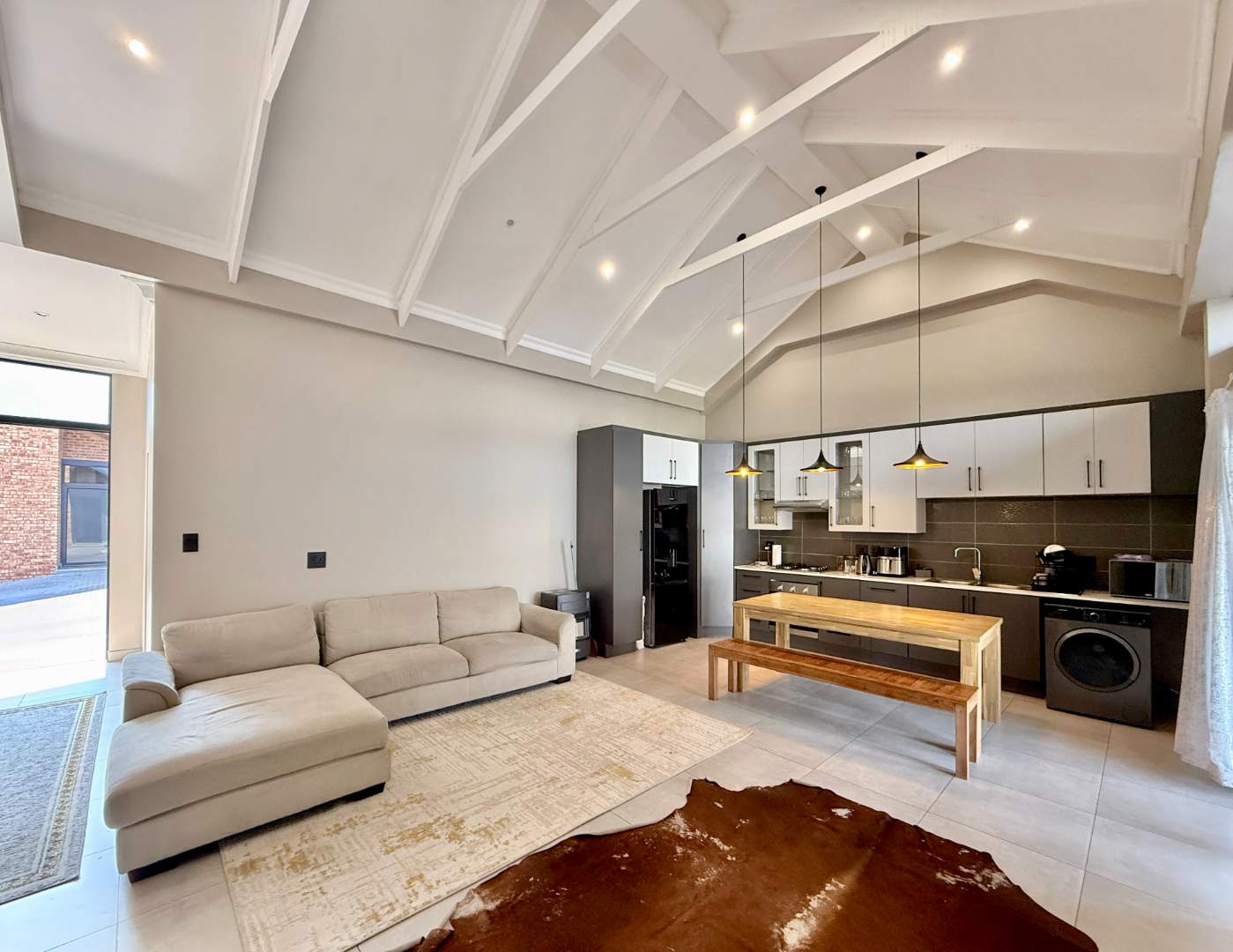 Each townhouse boasts three generously sized bedrooms and two well-appointed bathrooms, ensuring ample space for comfortable family living. The open-plan living area seamlessly flows into a state-of-the-art kitchen, creating a warm and inviting atmosphere ideal for both relaxation and entertaining guests. High ceilings adorned with exposed beams add an elegant touch, enhancing the sophisticated ambiance throughout.
