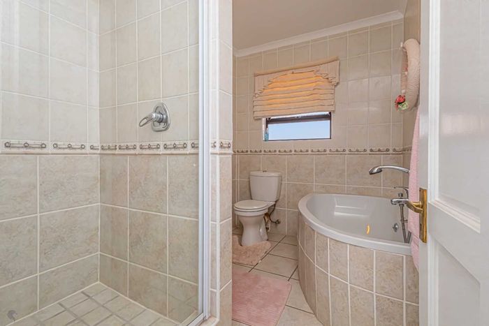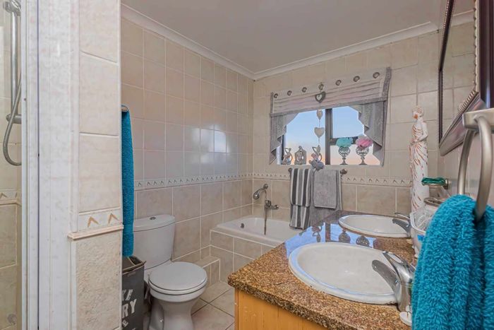 Resort-style living in Langebaan Country Estate with golf, trails and 24-hour security; private greenbelt views, pool and expansive covered braai patio. Four bedrooms, 3.5 baths, oversized double garage.