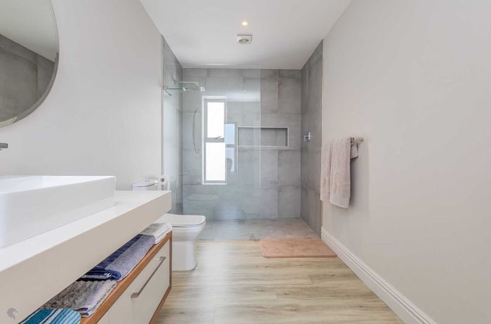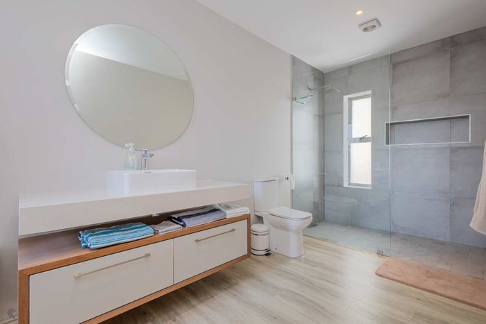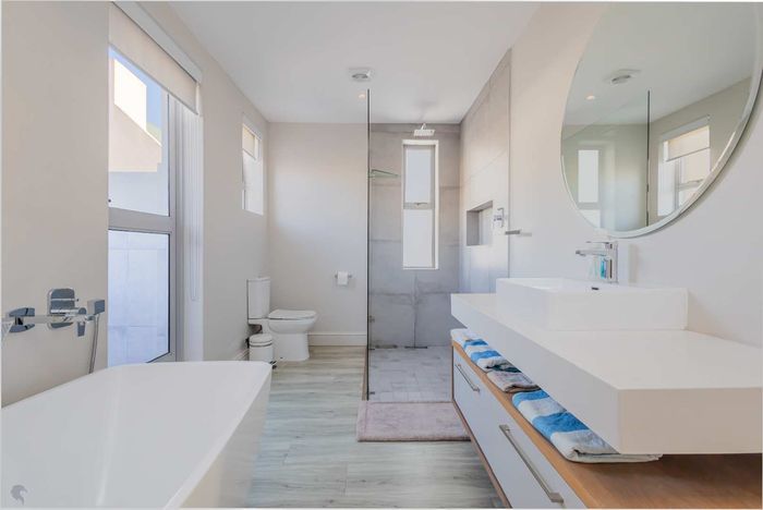 Embrace relaxed country-club living in Langebaan Country Estate, with lagoon access and golf course; this modern 3-bed home features a covered patio with built-in braai and private outdoor shower.