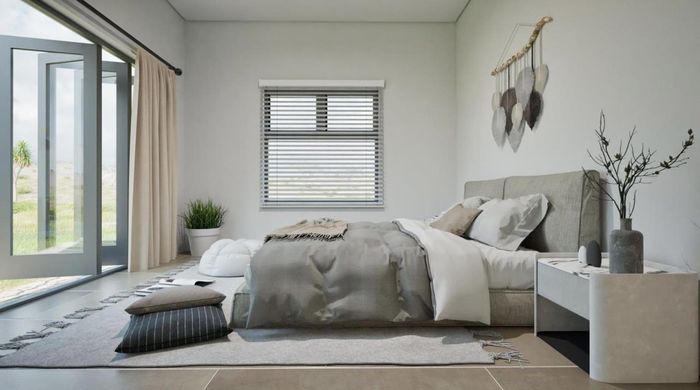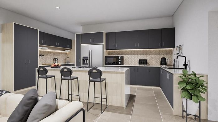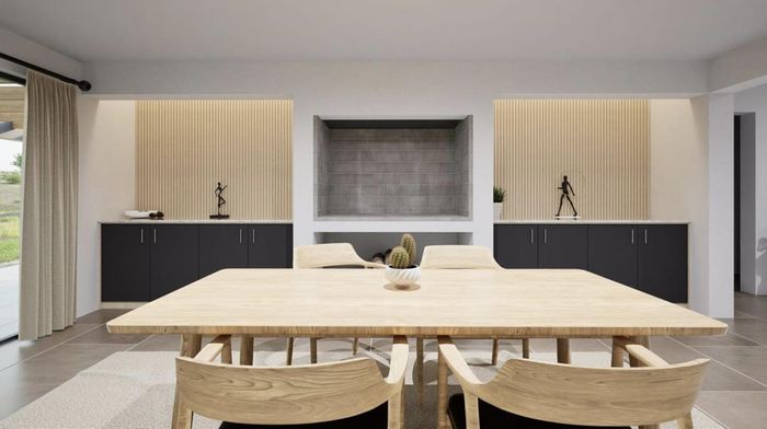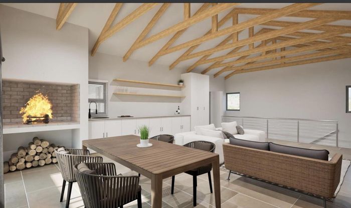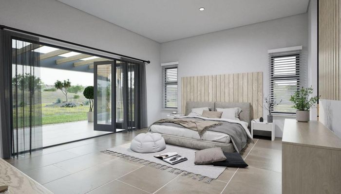 Relaxed modern living in Chardon Village's Langebaan Country Estate, opening onto a greenbelt via folding windows—patio with built-in SAFIRE BBQ, chef’s kitchen and scullery. 3 beds, 2 baths, double garage.