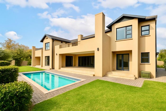 Entertain effortlessly in a family-friendly, leafy neighbourhood — waterfall entrance leads to open-plan bar with stacking doors, pool, boma fireplace and solar-backed power. Five bedrooms, 5.5 baths, four garages.