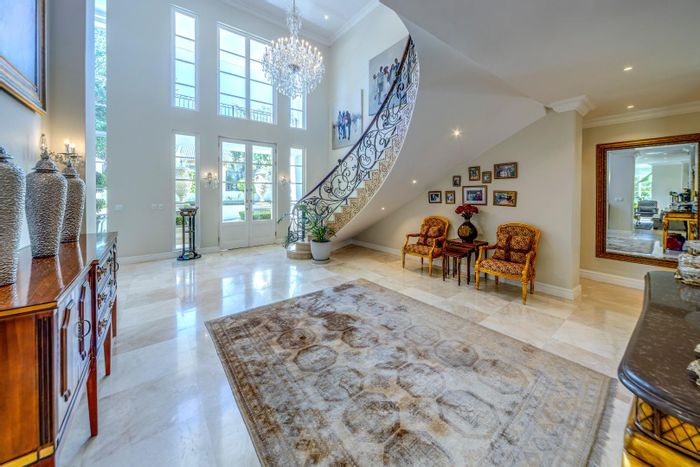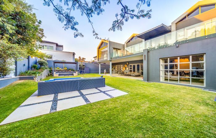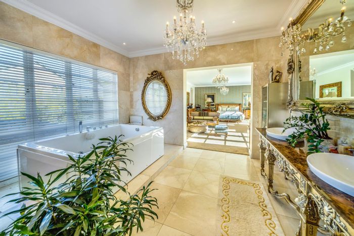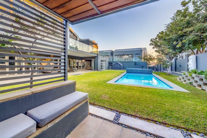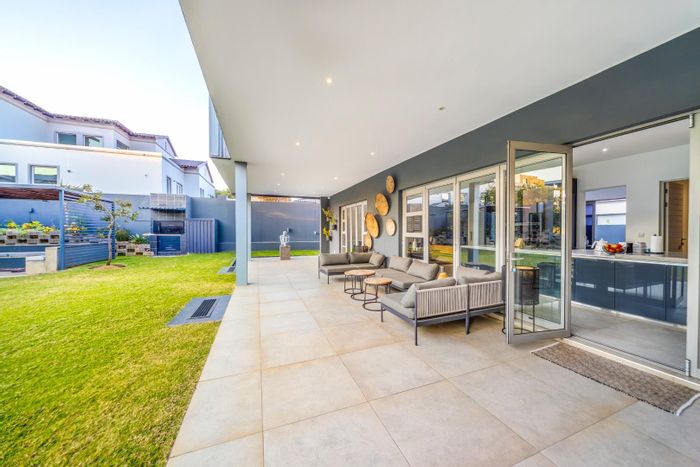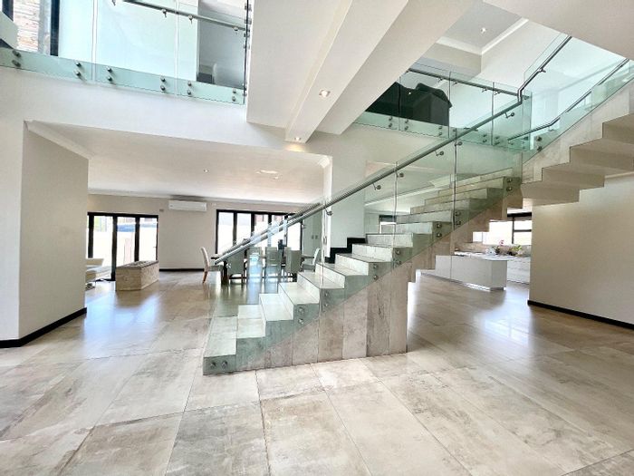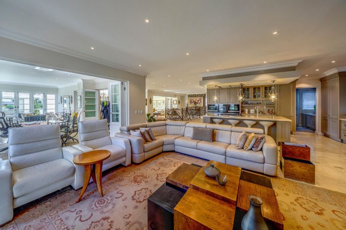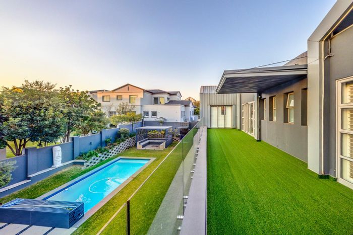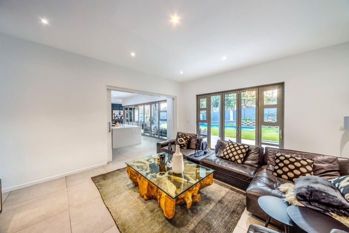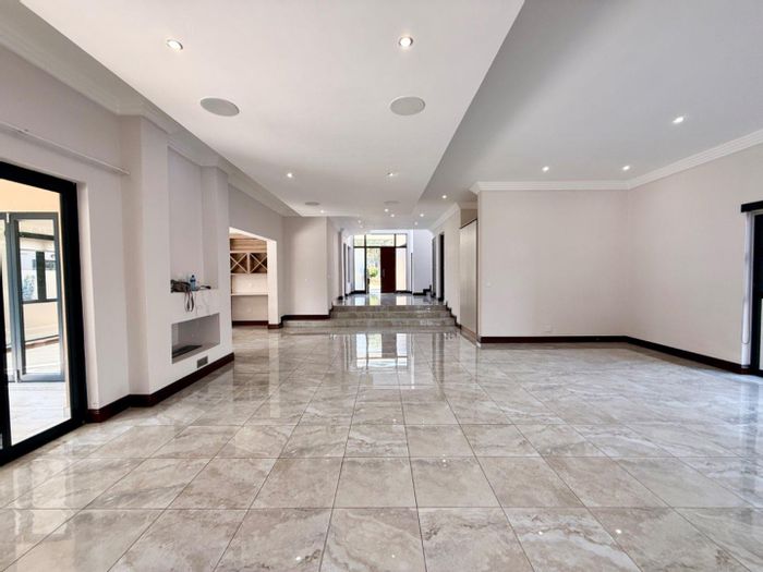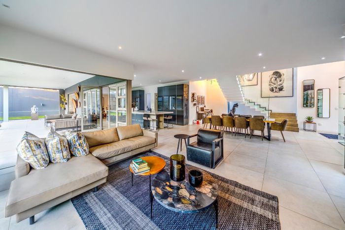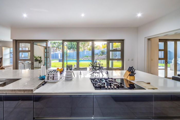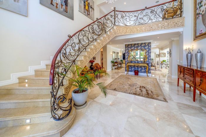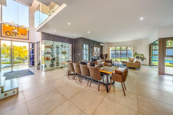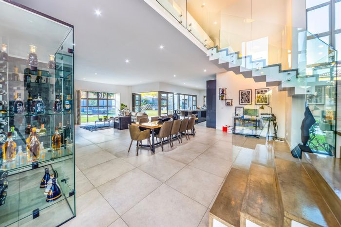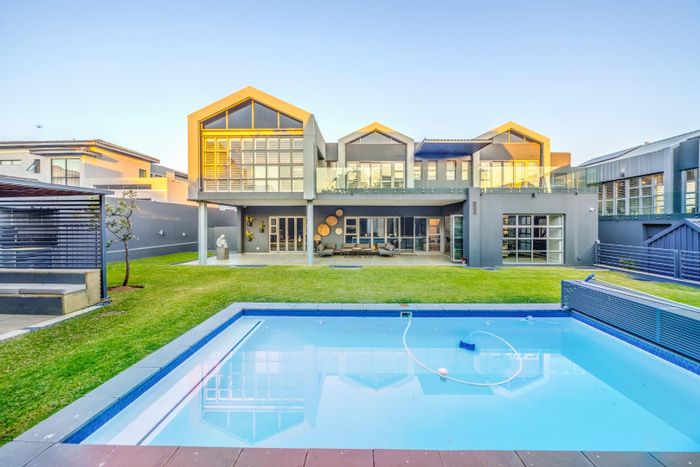 Entertain effortlessly in a family-friendly, leafy neighbourhood — waterfall entrance leads to open-plan bar with stacking doors, pool, boma fireplace and solar-backed power. Five bedrooms, 5.5 baths, four garages.