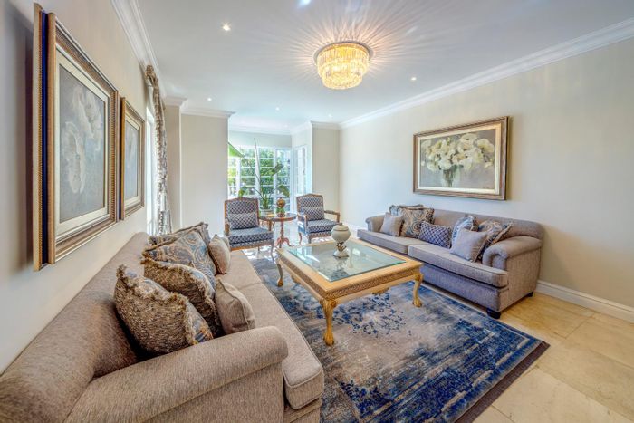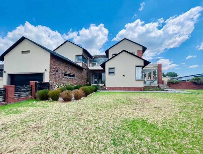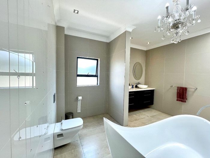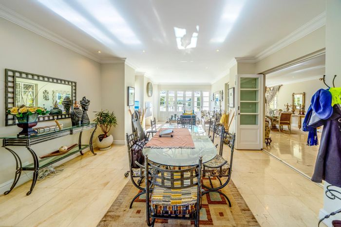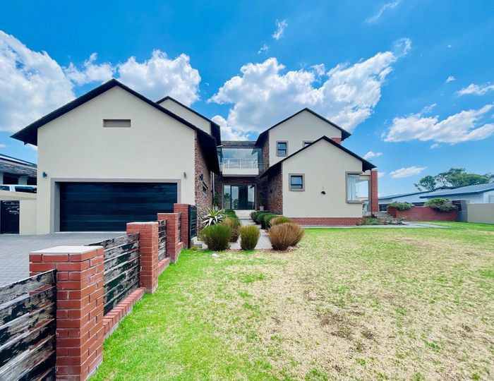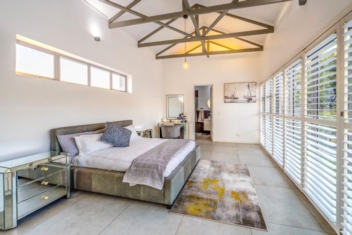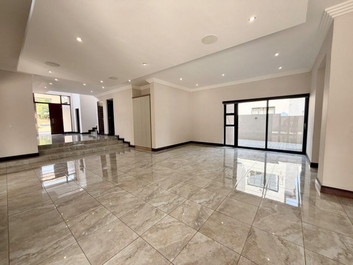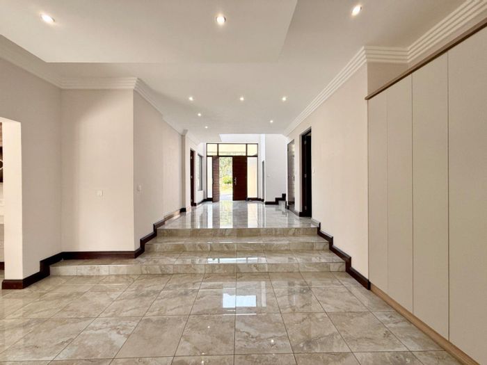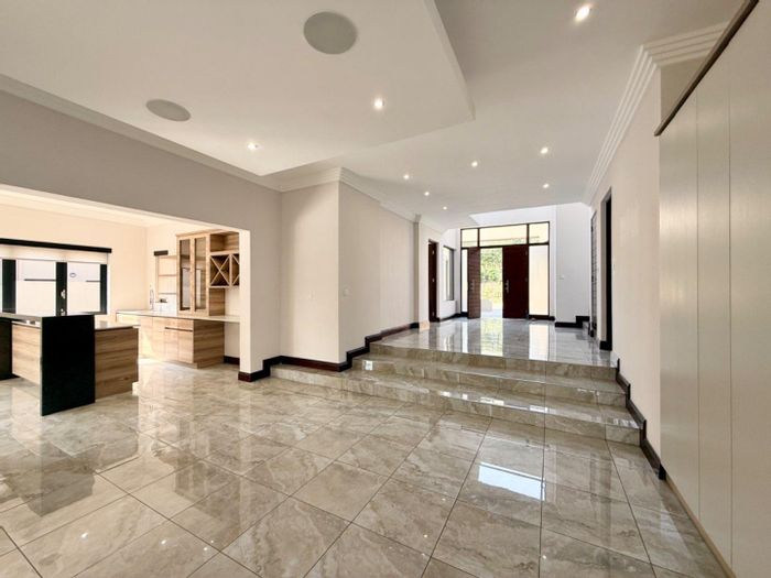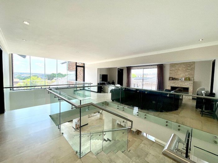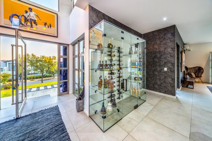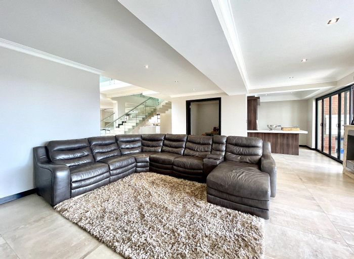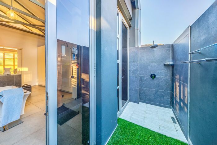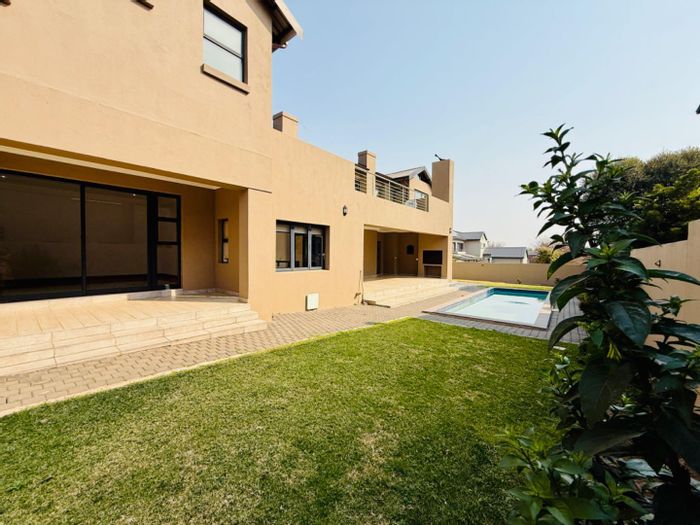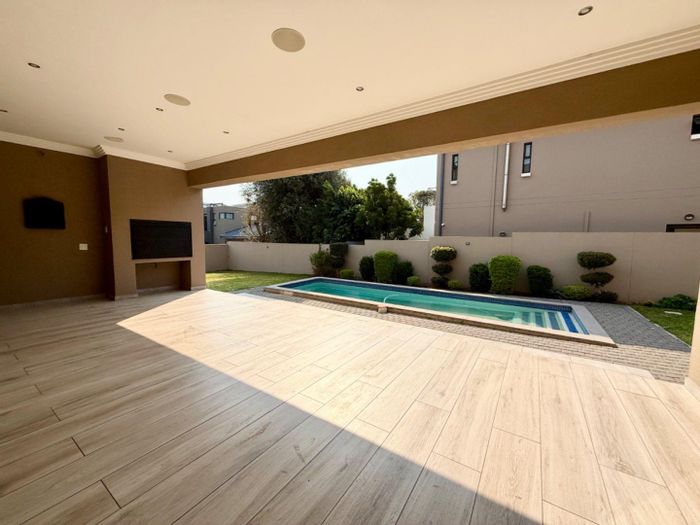 Entertain effortlessly in a family-friendly, leafy neighbourhood — waterfall entrance leads to open-plan bar with stacking doors, pool, boma fireplace and solar-backed power. Five bedrooms, 5.5 baths, four garages.