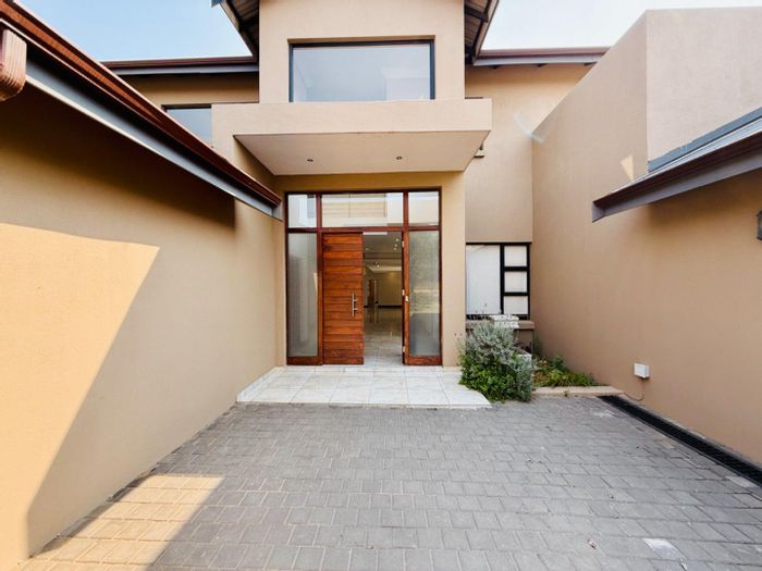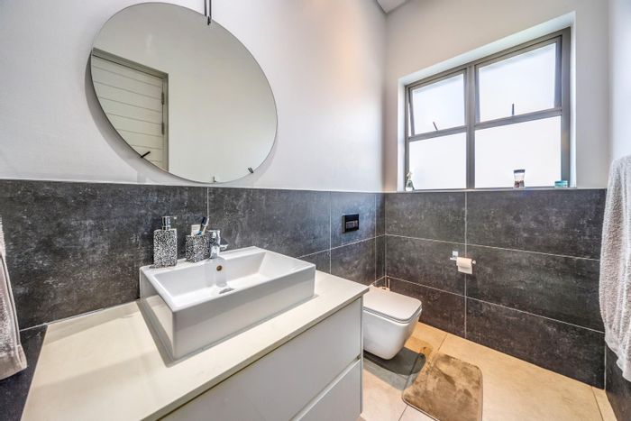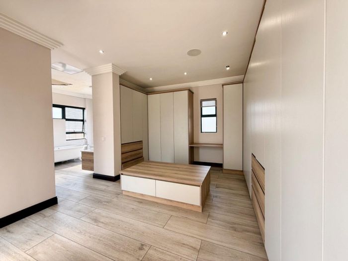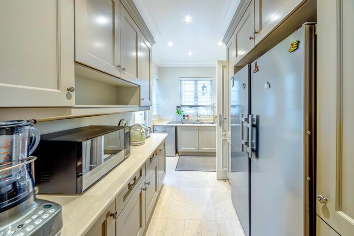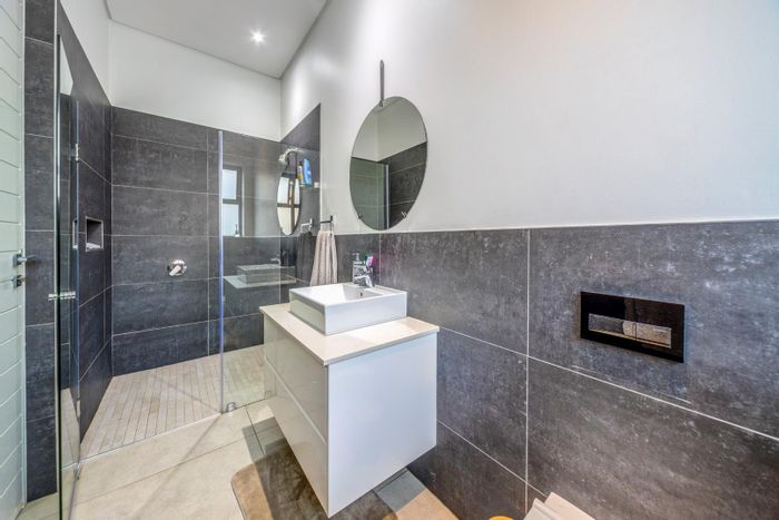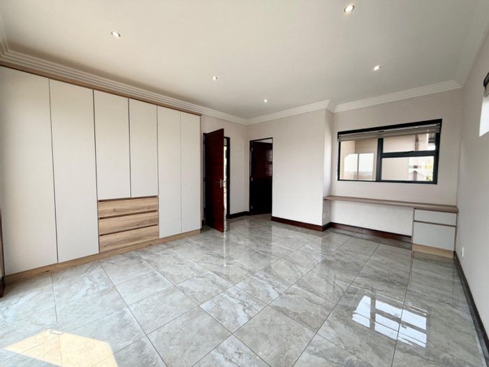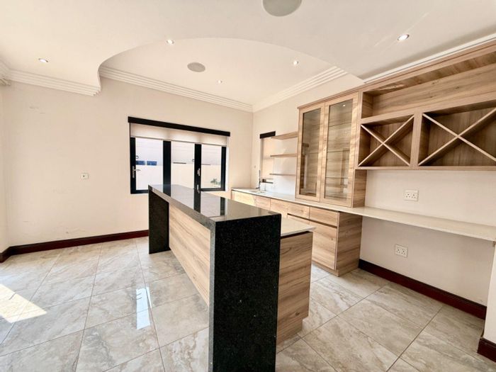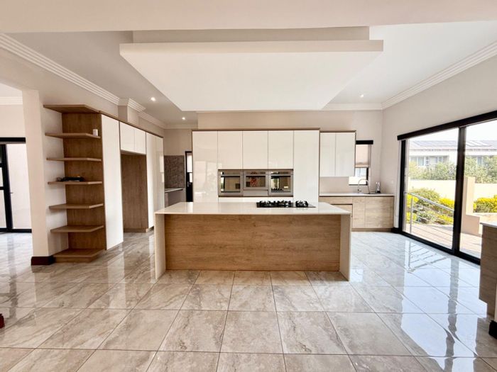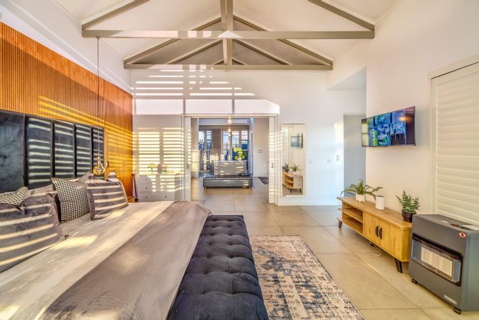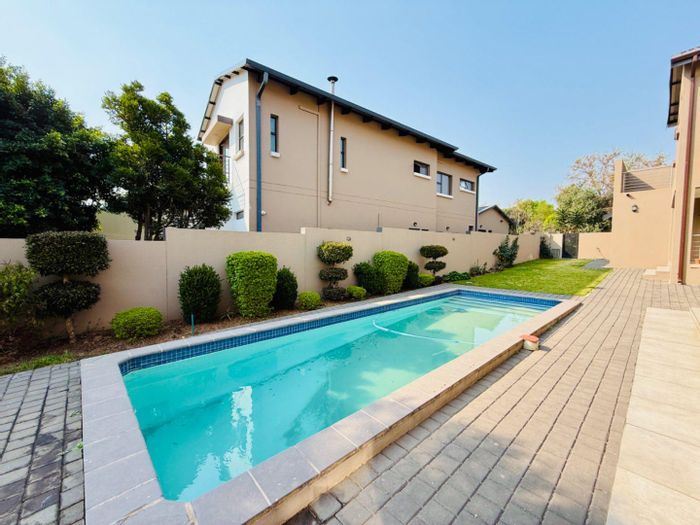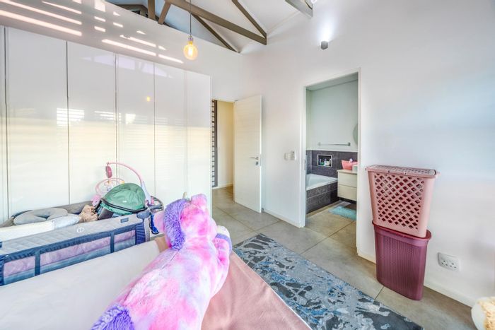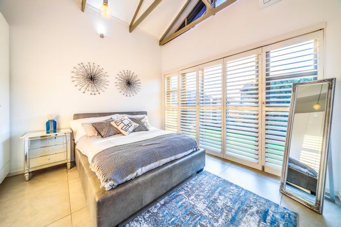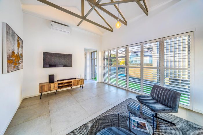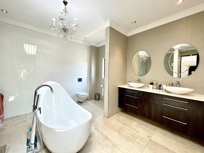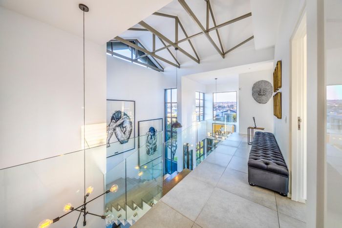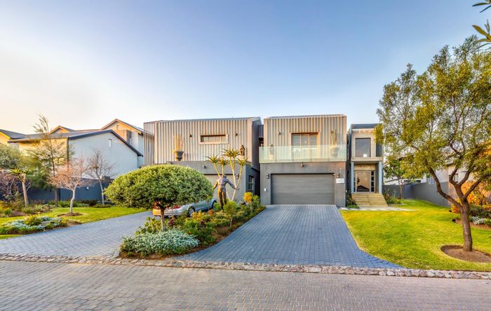 Entertain effortlessly in a family-friendly, leafy neighbourhood — waterfall entrance leads to open-plan bar with stacking doors, pool, boma fireplace and solar-backed power. Five bedrooms, 5.5 baths, four garages.
