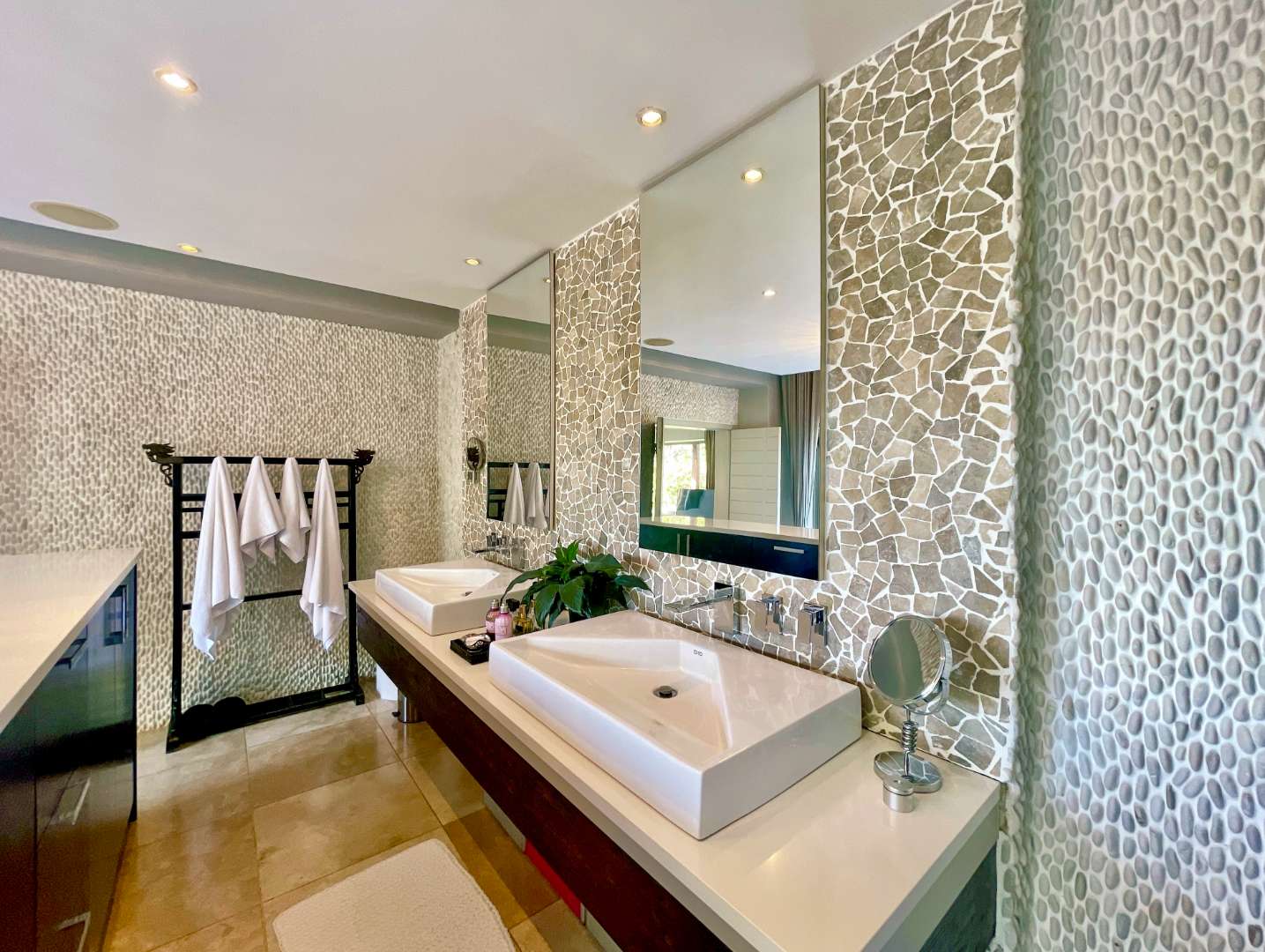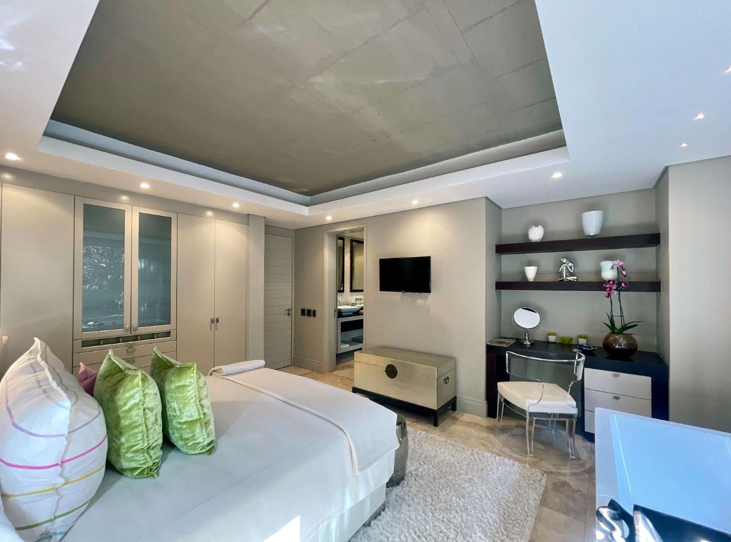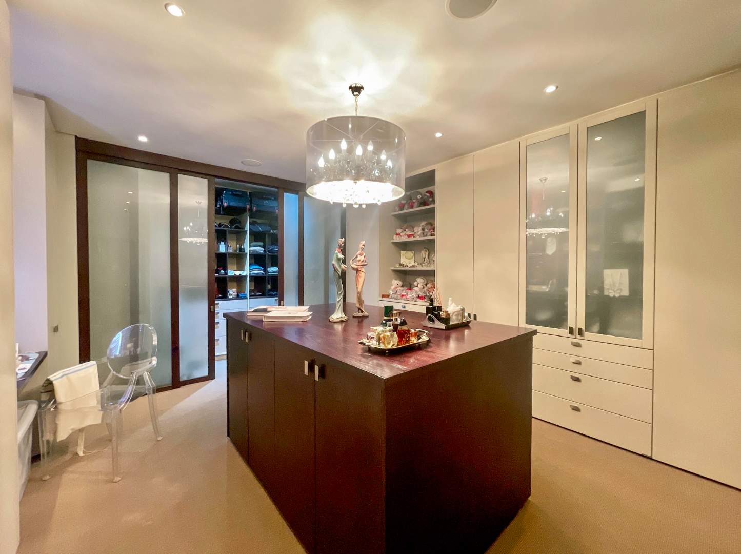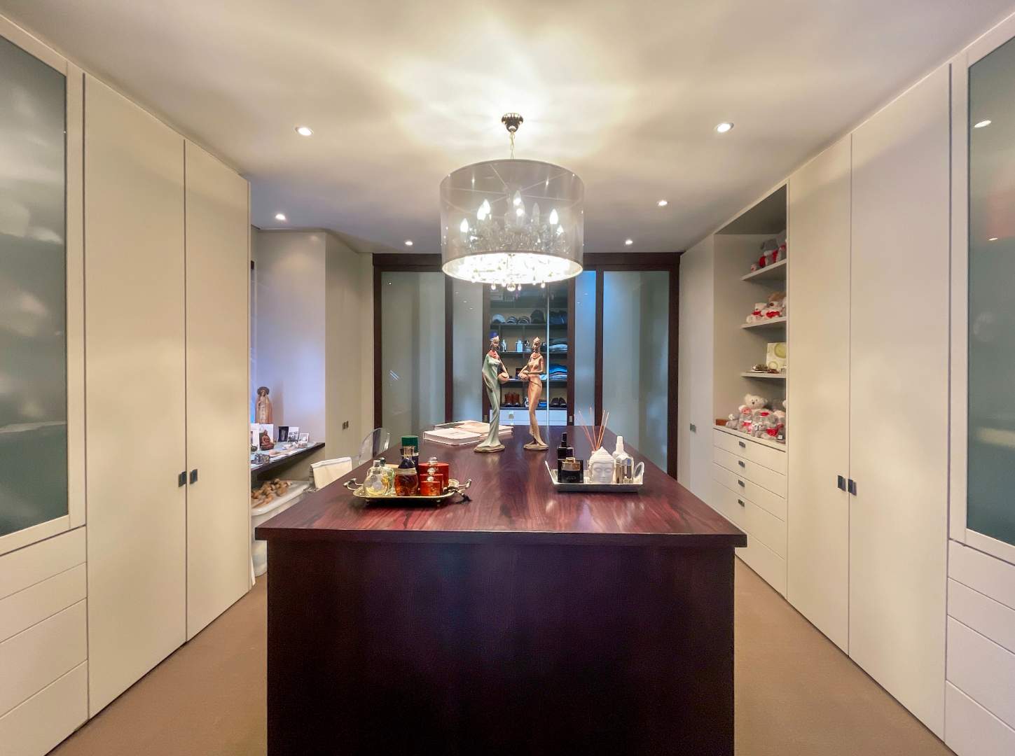 The guest wing offers two ensuite bedrooms with private outdoor areas, a living room, and a kitchen equipped with top-of-the-line Gaggenau appliances. Upstairs, three exquisite bedrooms await, each with a balcony offering panoramic views. The main ensuite bedroom is a haven of indulgence with a spacious walk-in closet and lavish bathroom.