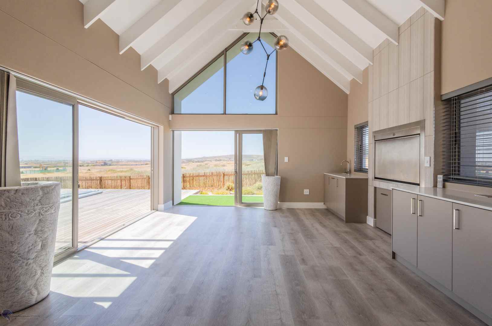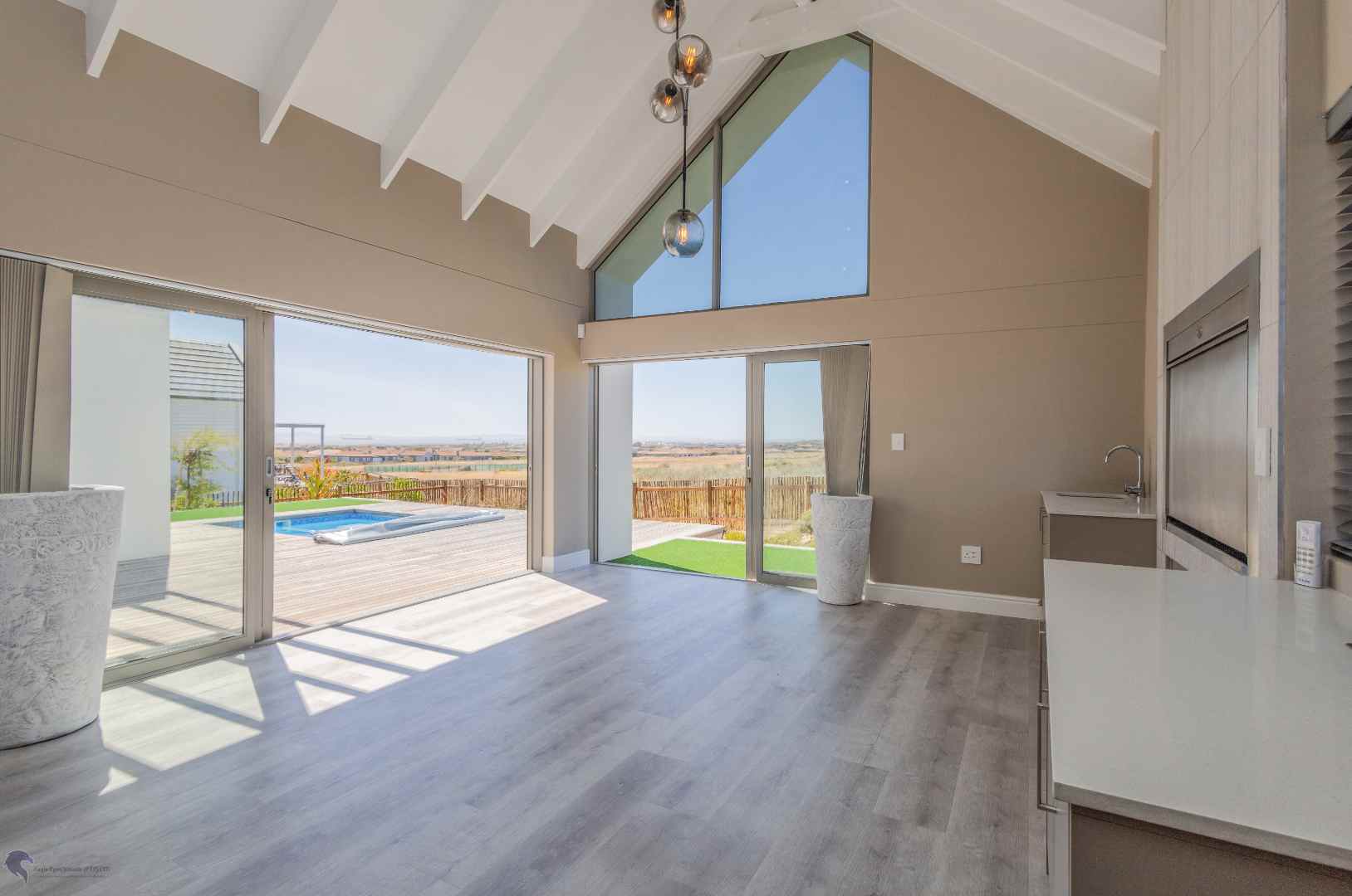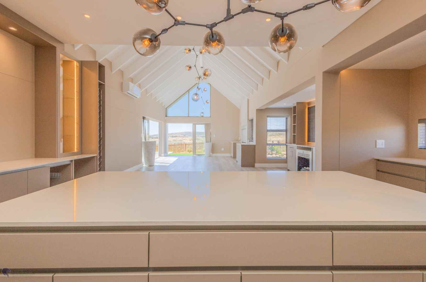 The heart of the home is the bright and airy living area, with double-volume ceilings and large windows that fill the space with natural light. The open-plan layout includes: