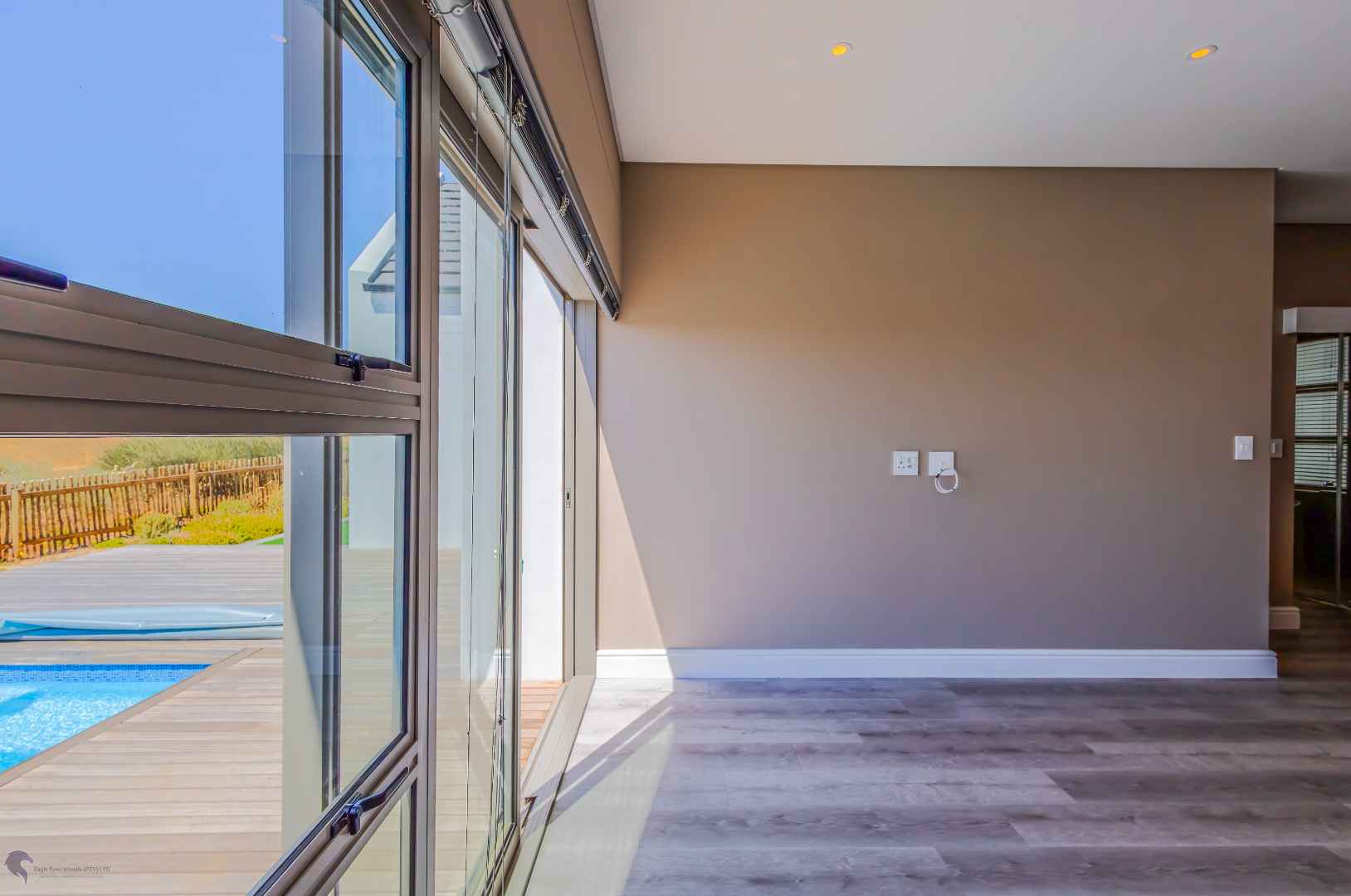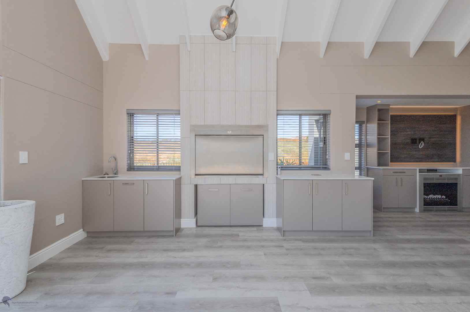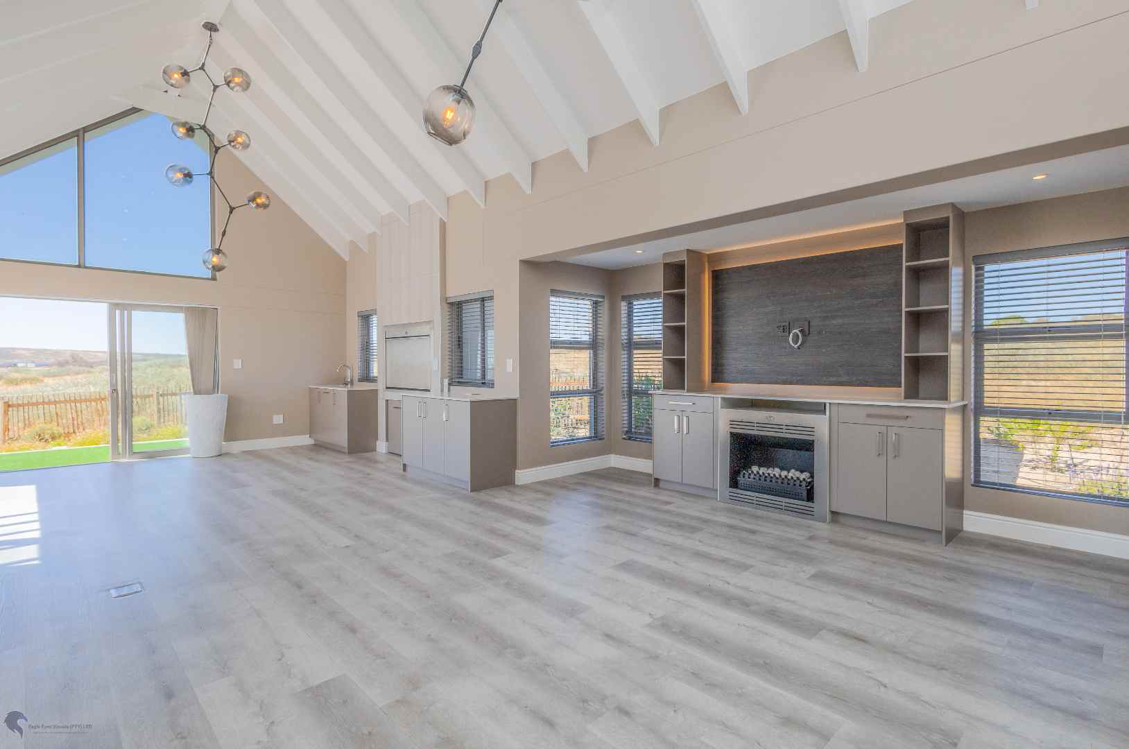 The heart of the home is the bright and airy living area, with double-volume ceilings and large windows that fill the space with natural light. The open-plan layout includes: