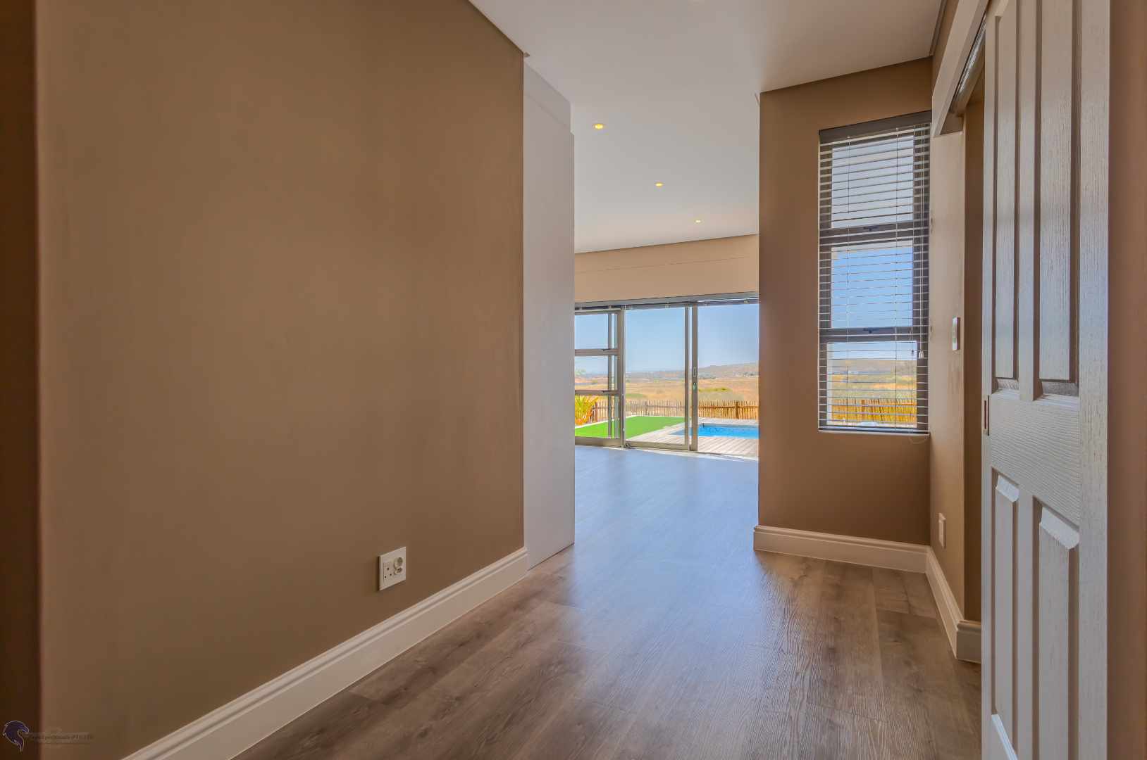 The outdoor space includes a deck and a built-in pool, creating an excellent spot for relaxing or entertaining.