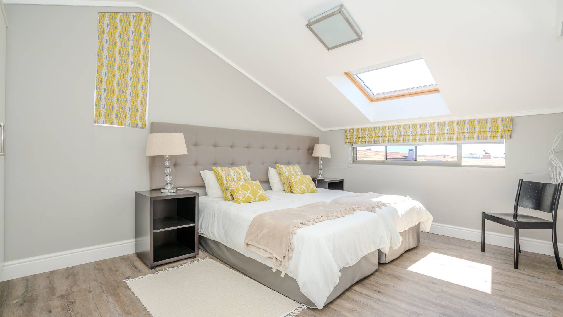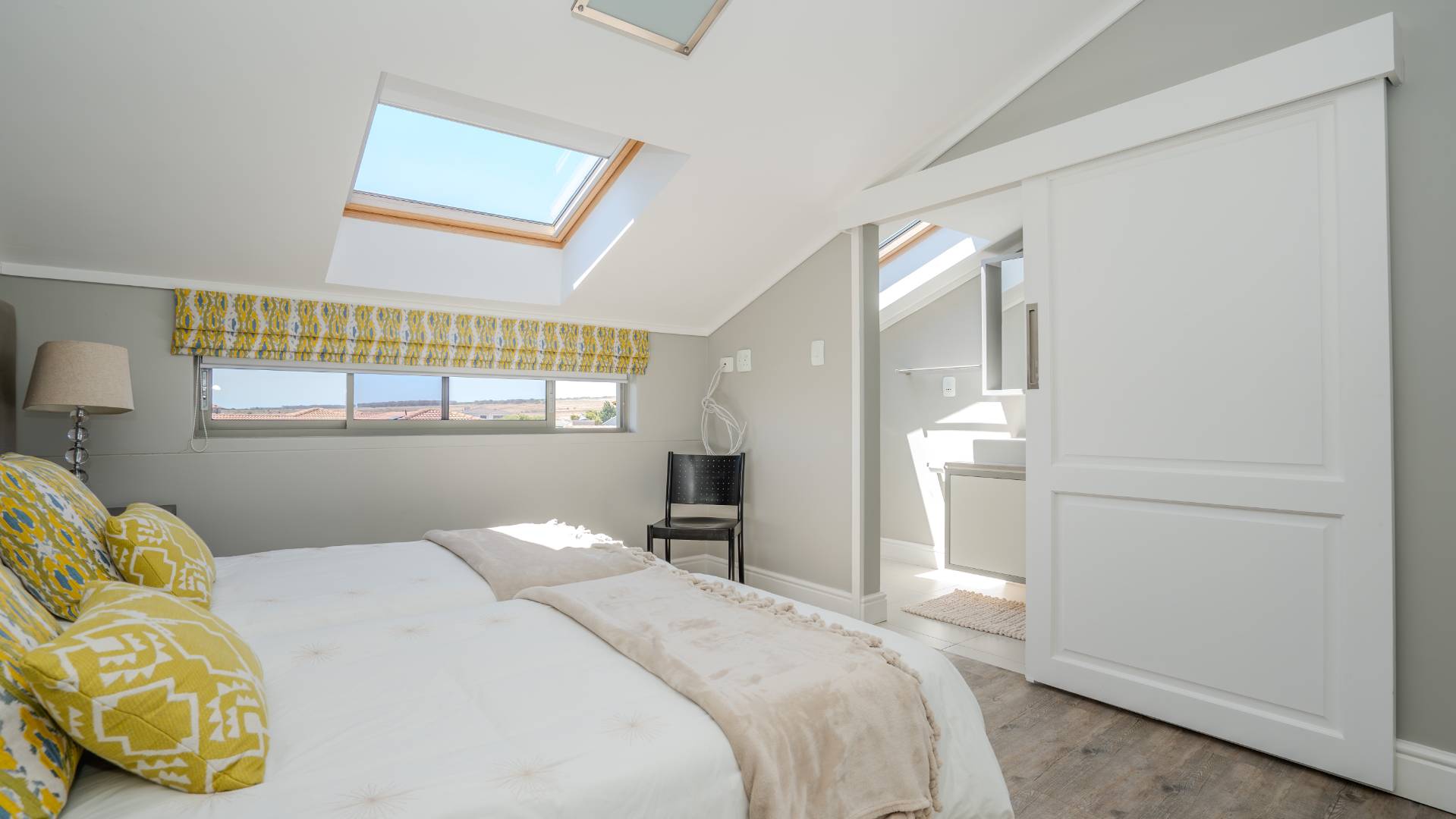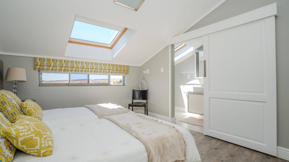 Upstairs, two additional bedrooms each offer en-suite bathrooms, built-in wardrobes, and skylights with automatic rain sensors, flooding the rooms with natural light.