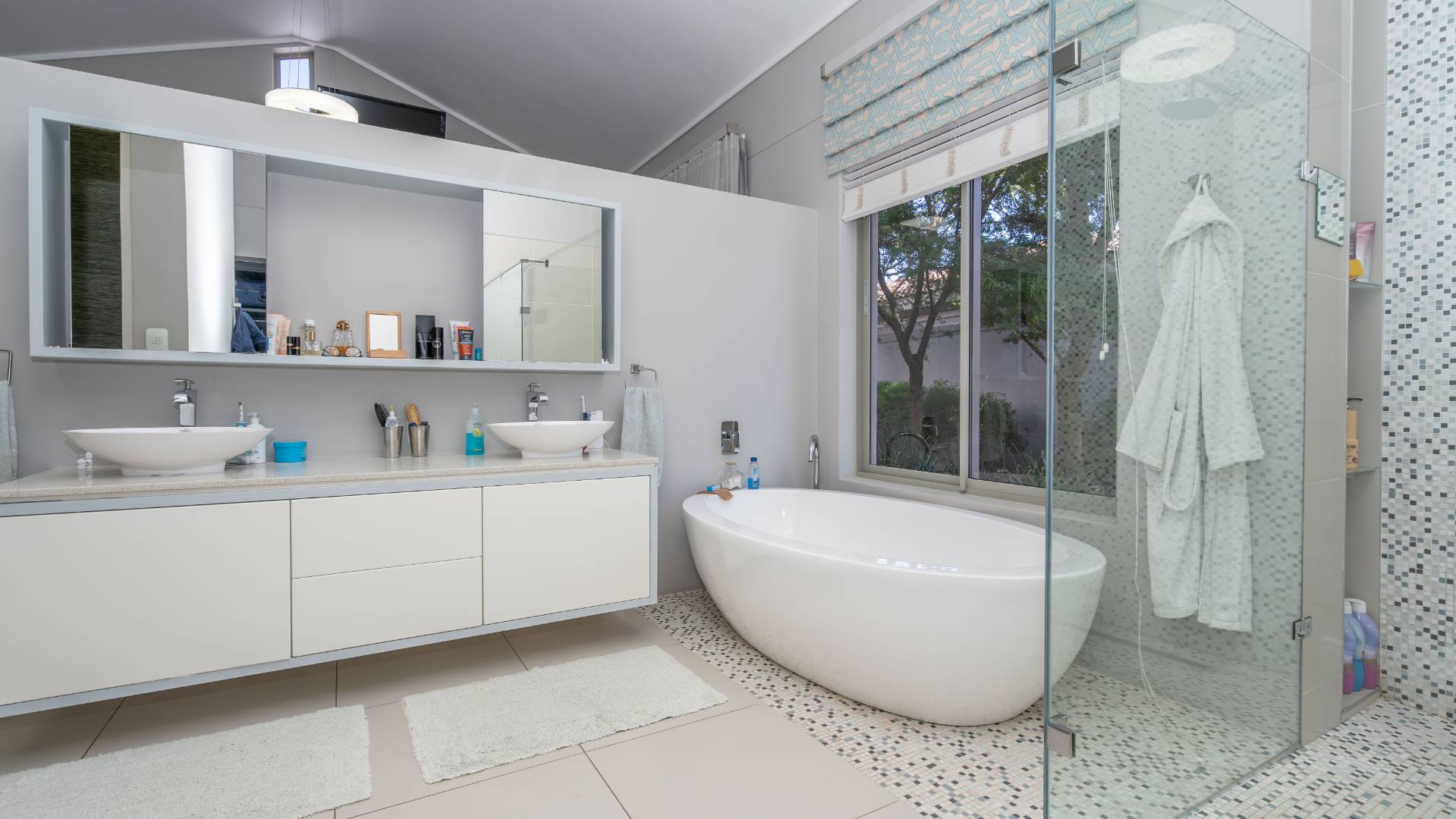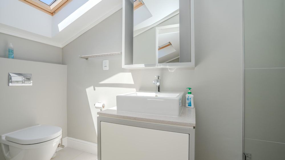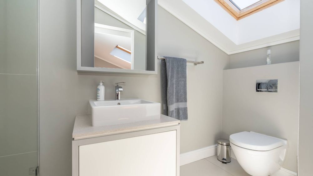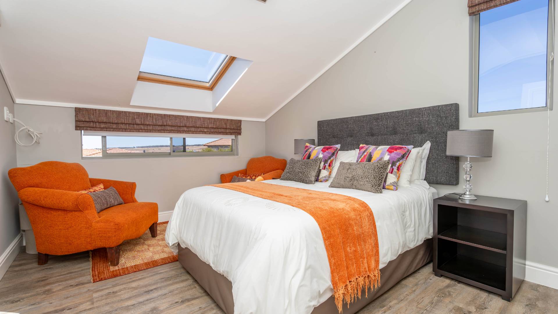 Upstairs, two additional bedrooms each offer en-suite bathrooms, built-in wardrobes, and skylights with automatic rain sensors, flooding the rooms with natural light.