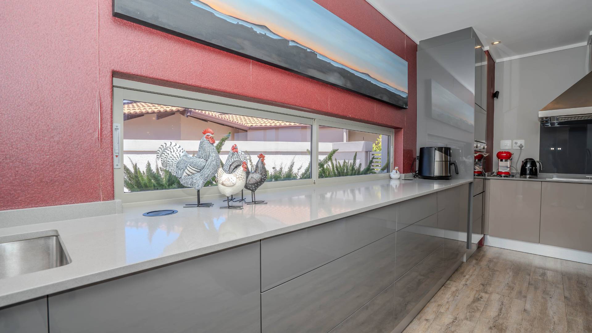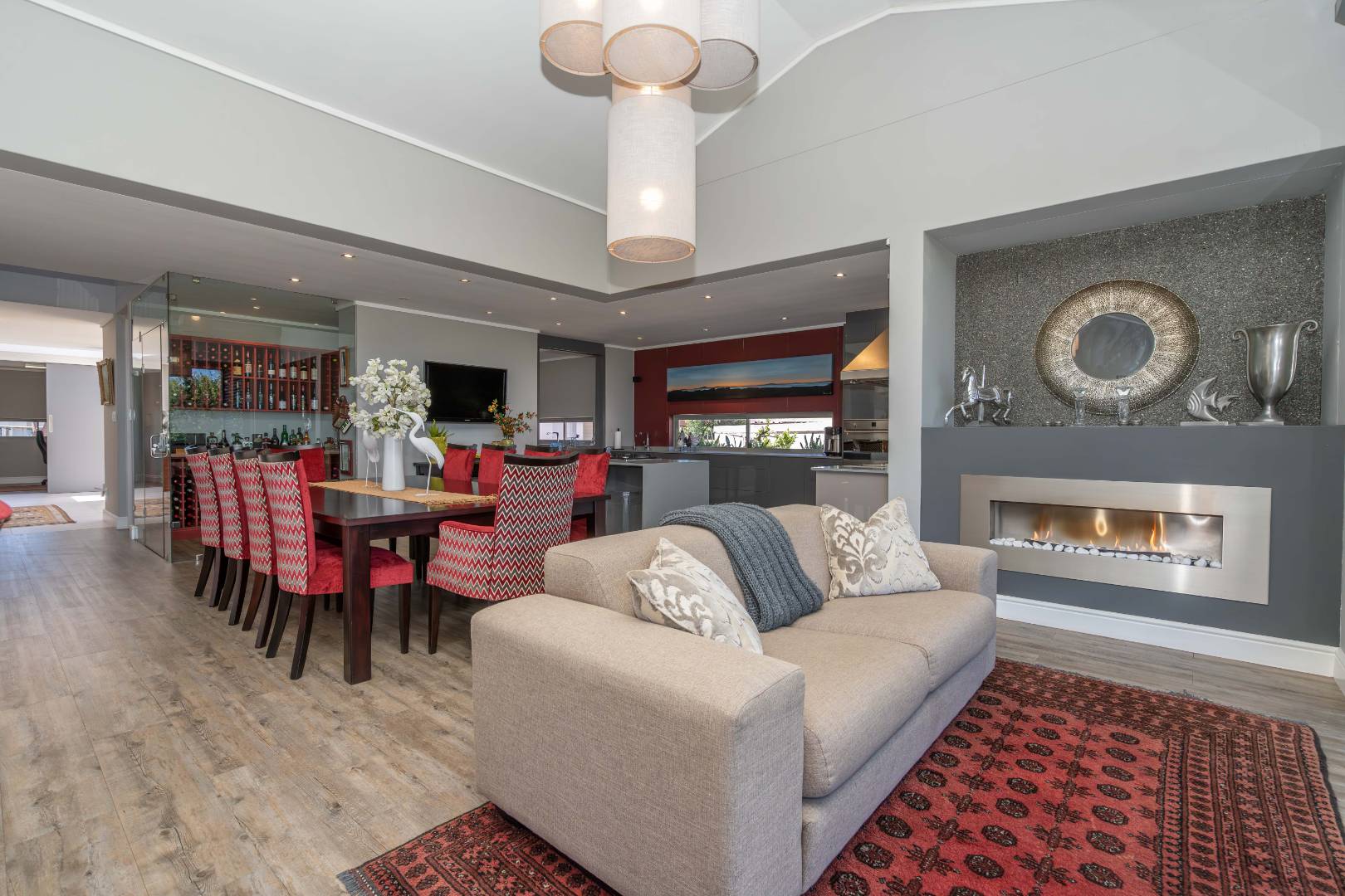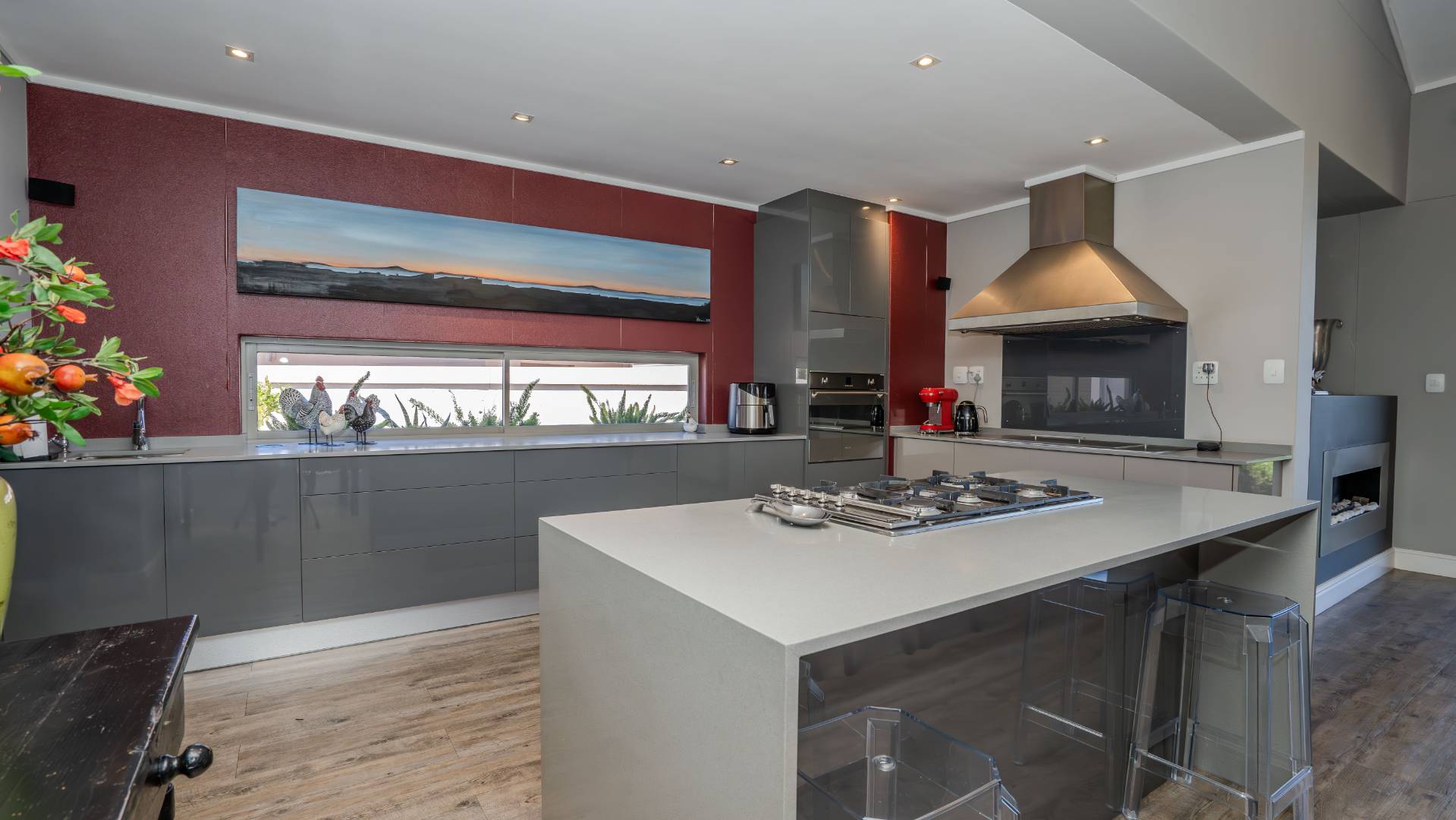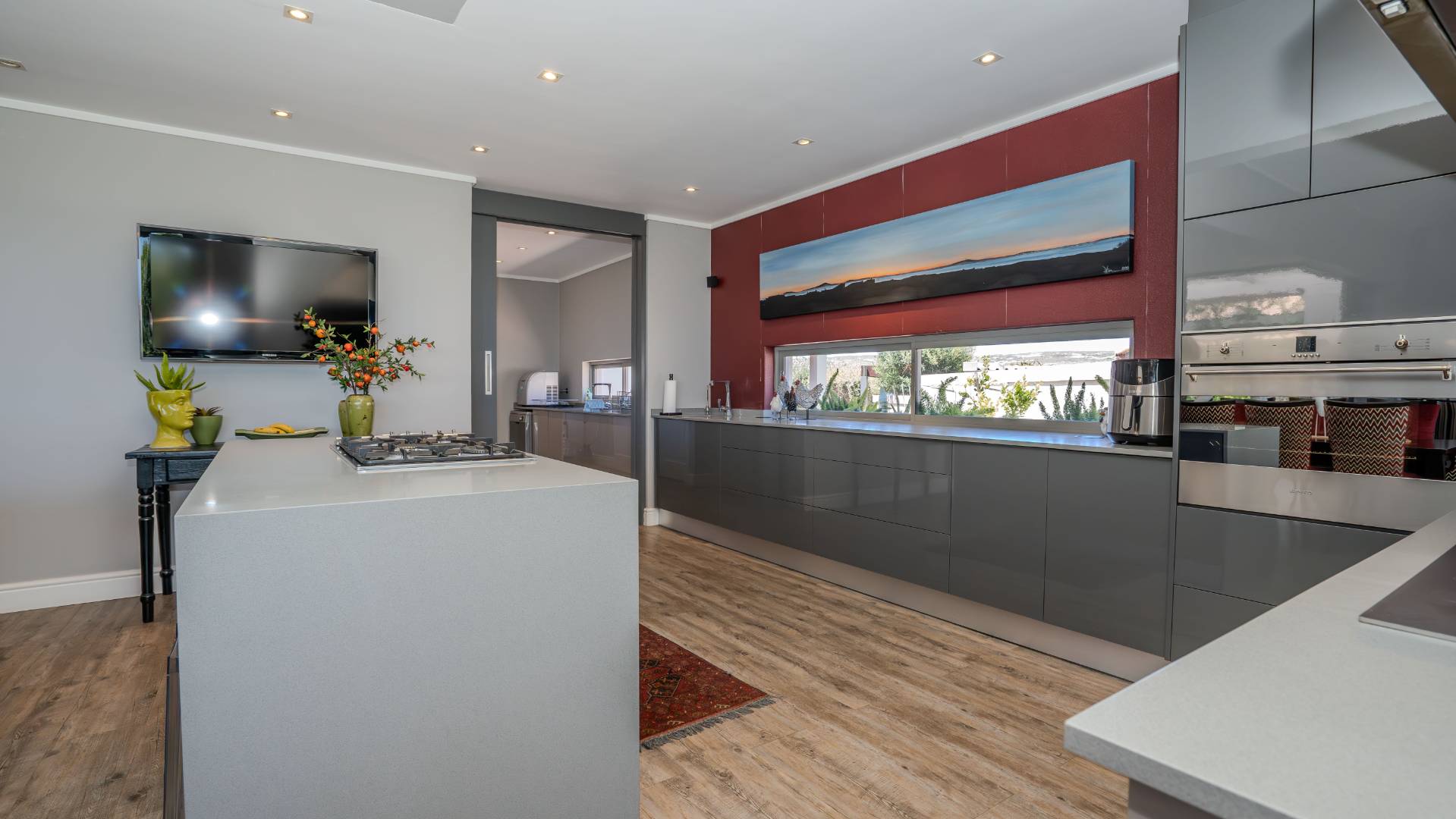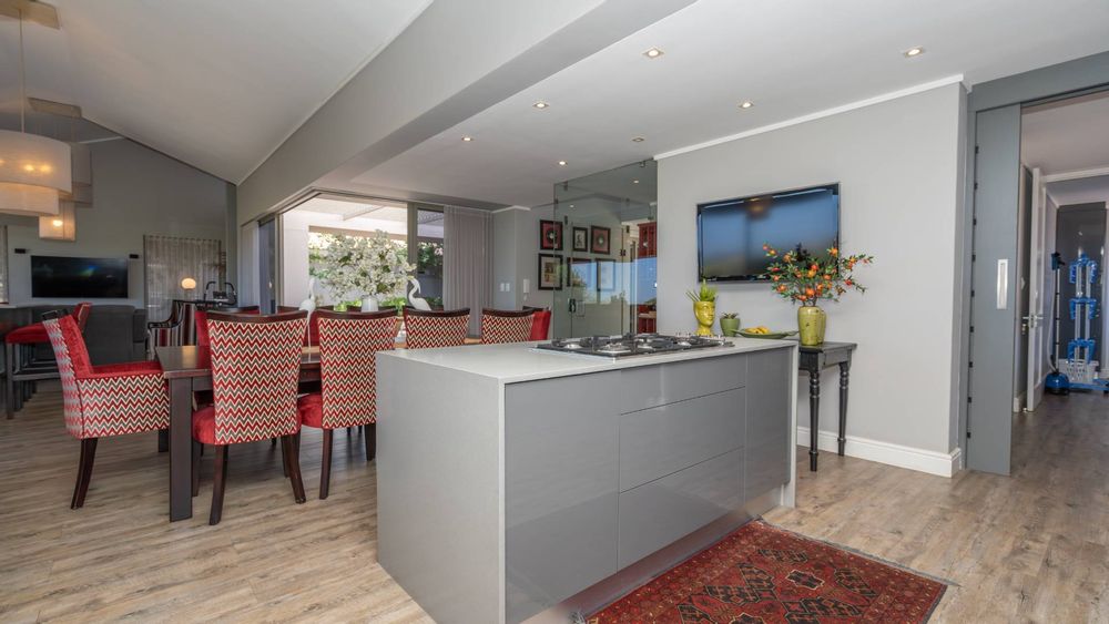 The modern kitchen is a chef’s delight, equipped with a premium Smeg five-burner gas hob, eye-level oven, stainless steel grill, extractor fan, and a central island with breakfast seating. Practicality meets luxury with a separate scullery, walk-in pantry, and a dedicated laundry room, providing ample storage and convenience.