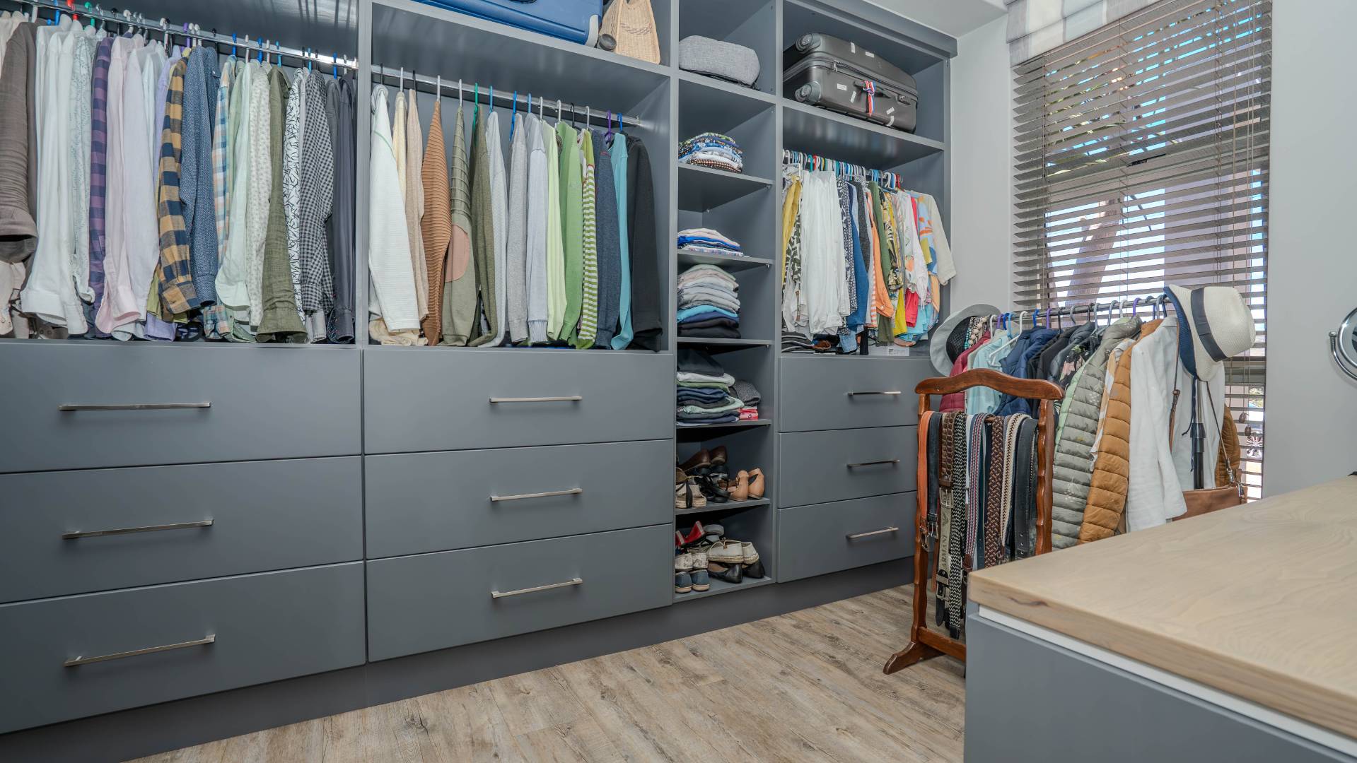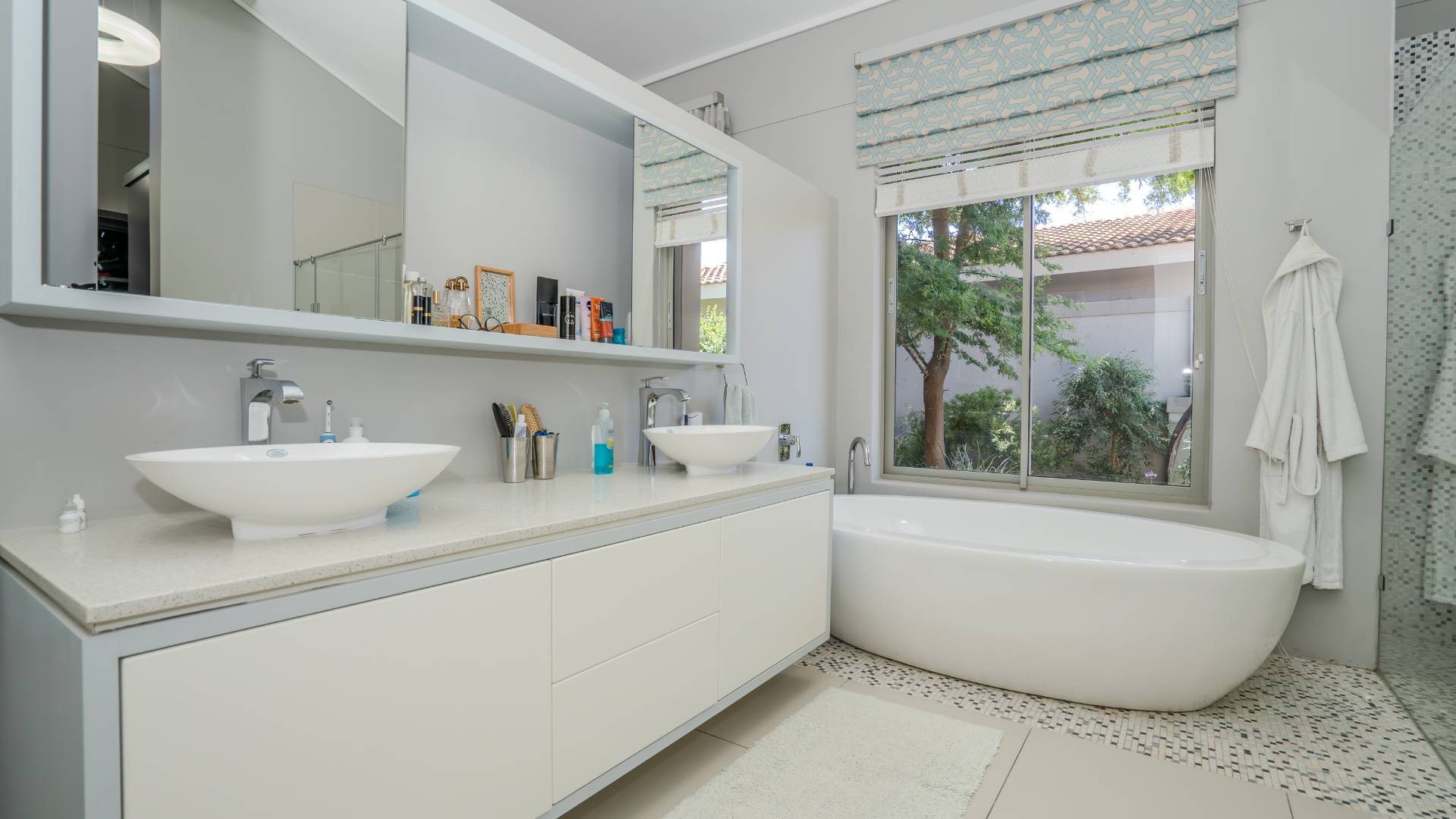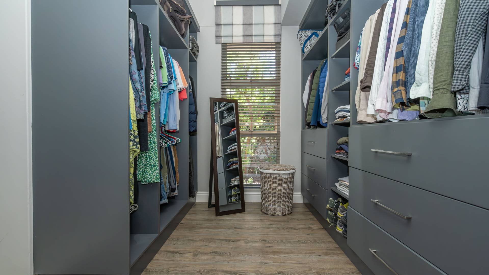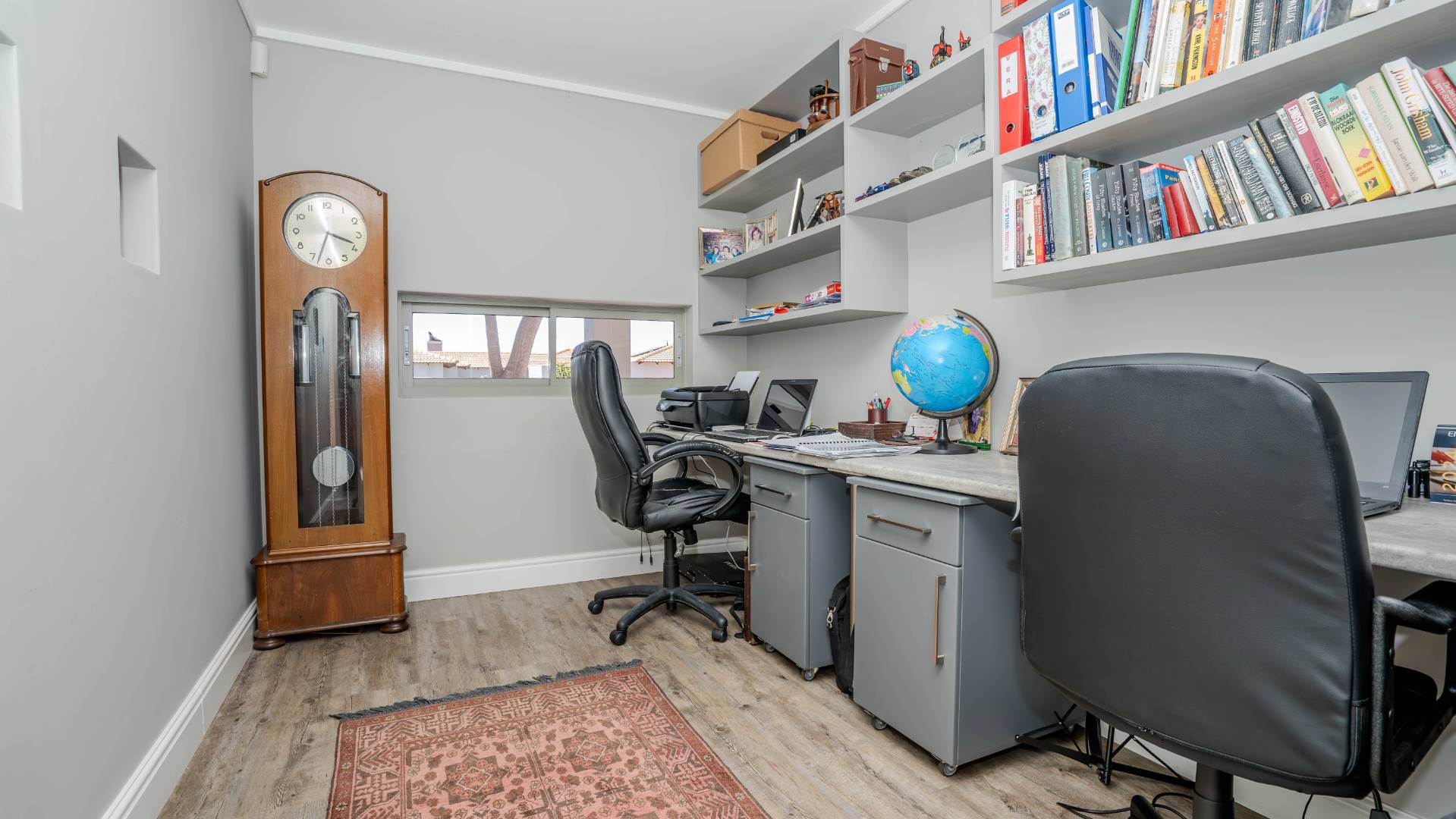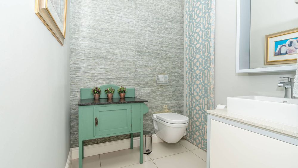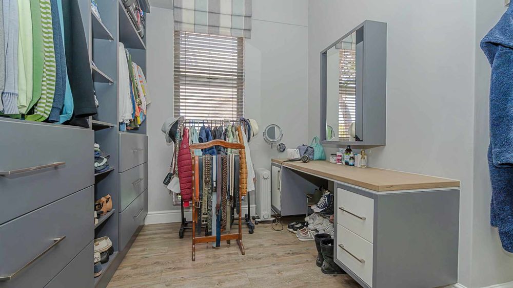 The modern kitchen is a chef’s delight, equipped with a premium Smeg five-burner gas hob, eye-level oven, stainless steel grill, extractor fan, and a central island with breakfast seating. Practicality meets luxury with a separate scullery, walk-in pantry, and a dedicated laundry room, providing ample storage and convenience.