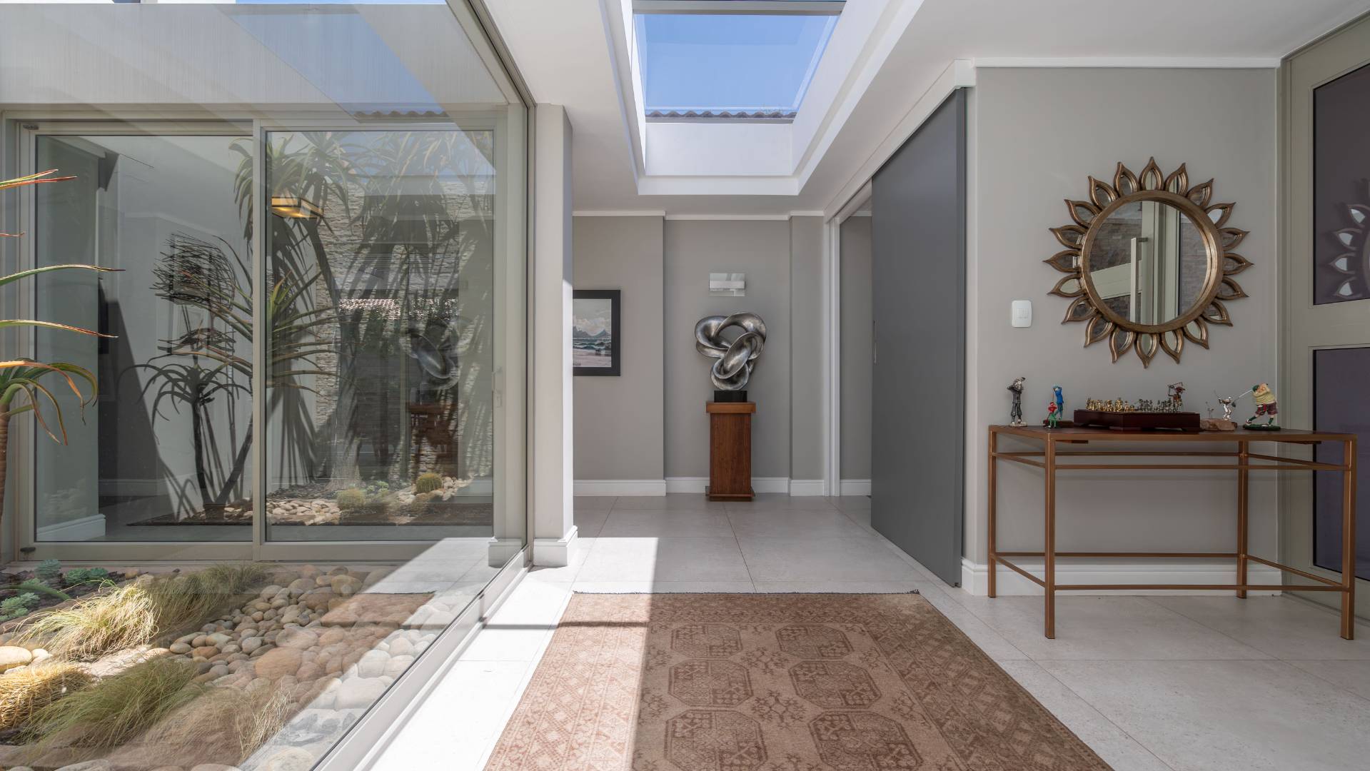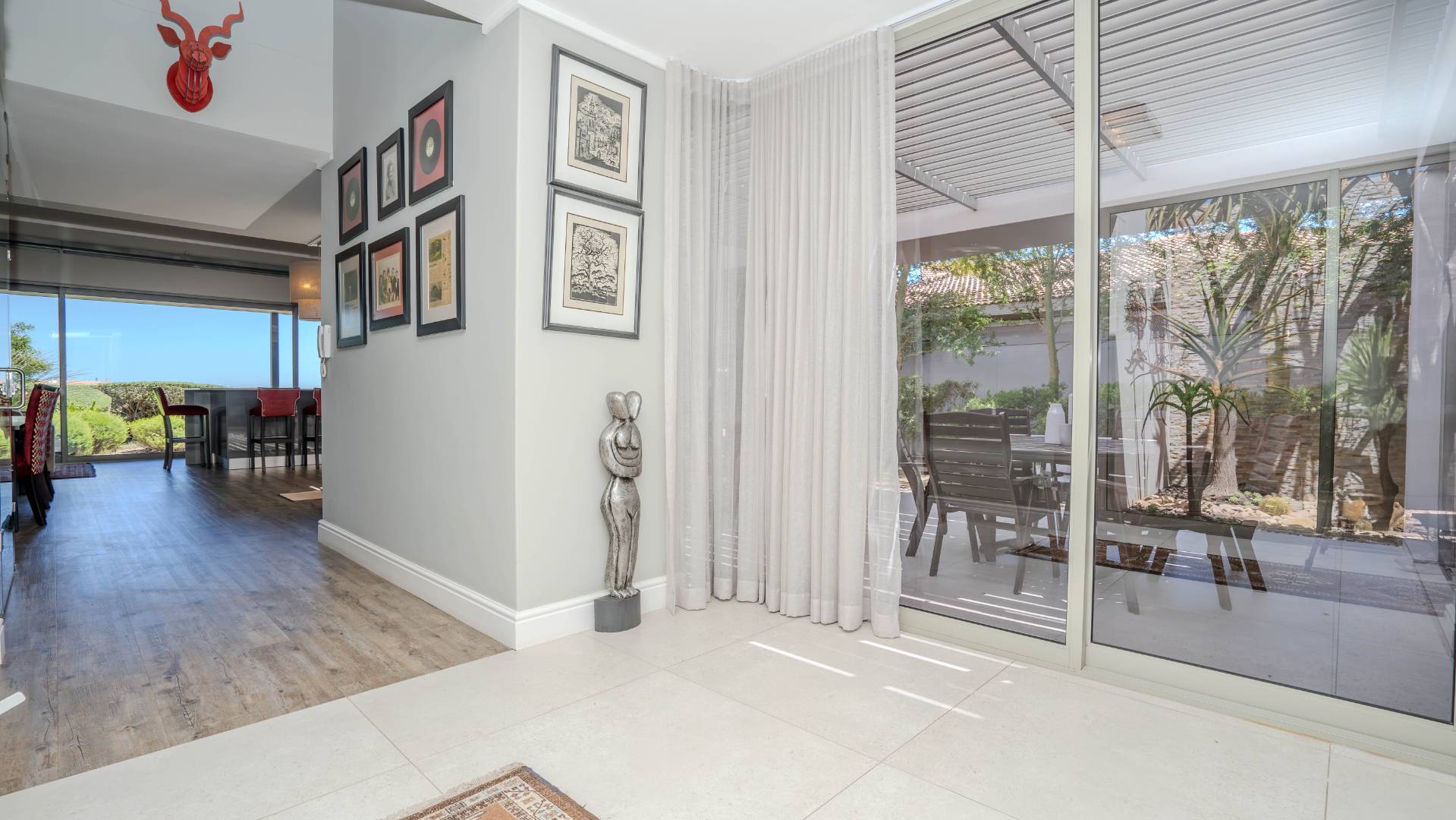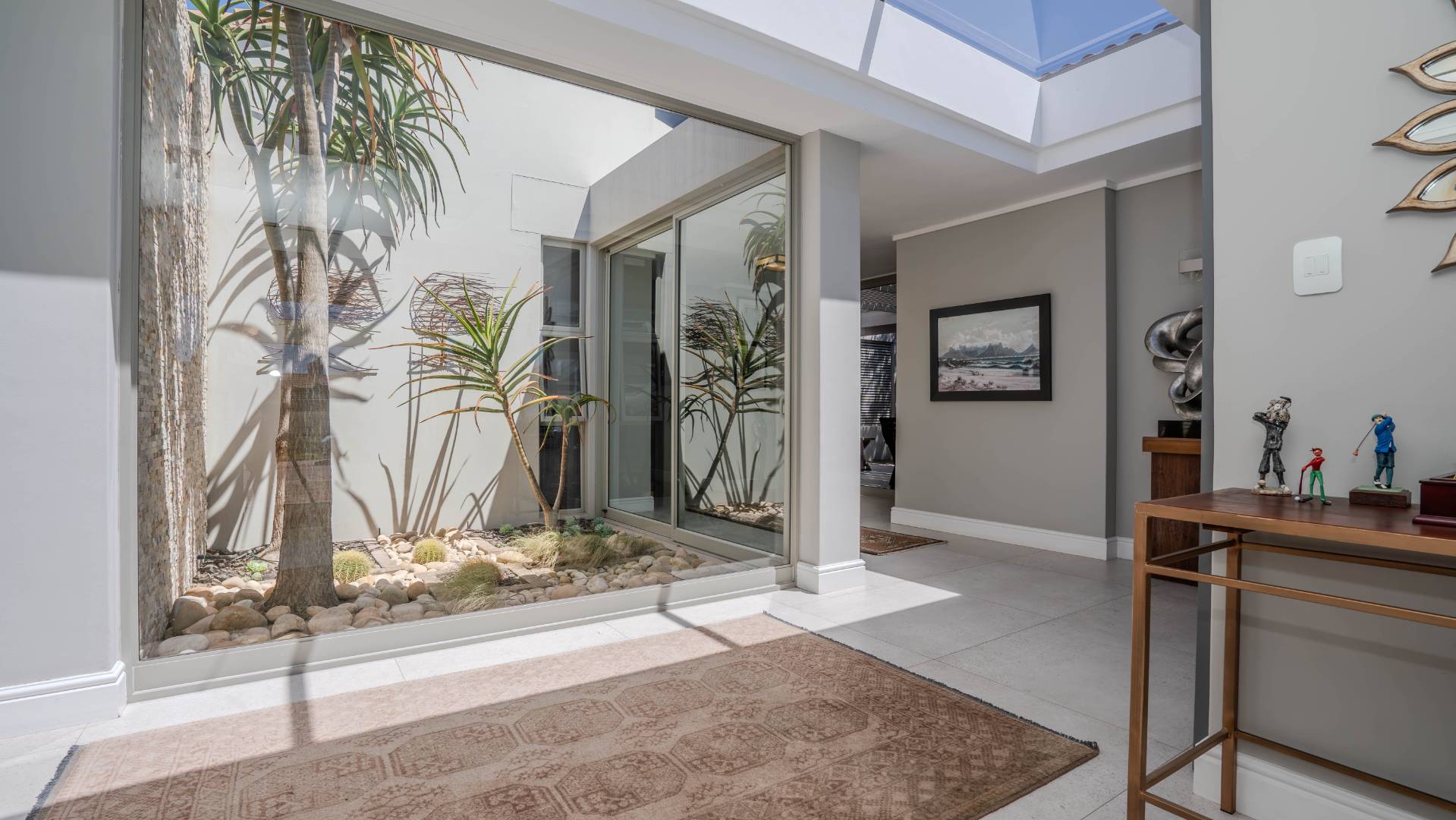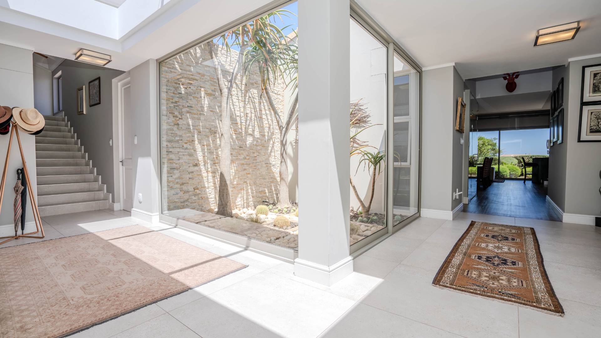 Upon arrival, you'll be welcomed by a striking foyer featuring a glass atrium that showcases a curated indigenous garden, highlighting native South African flora suited to the area’s climate.