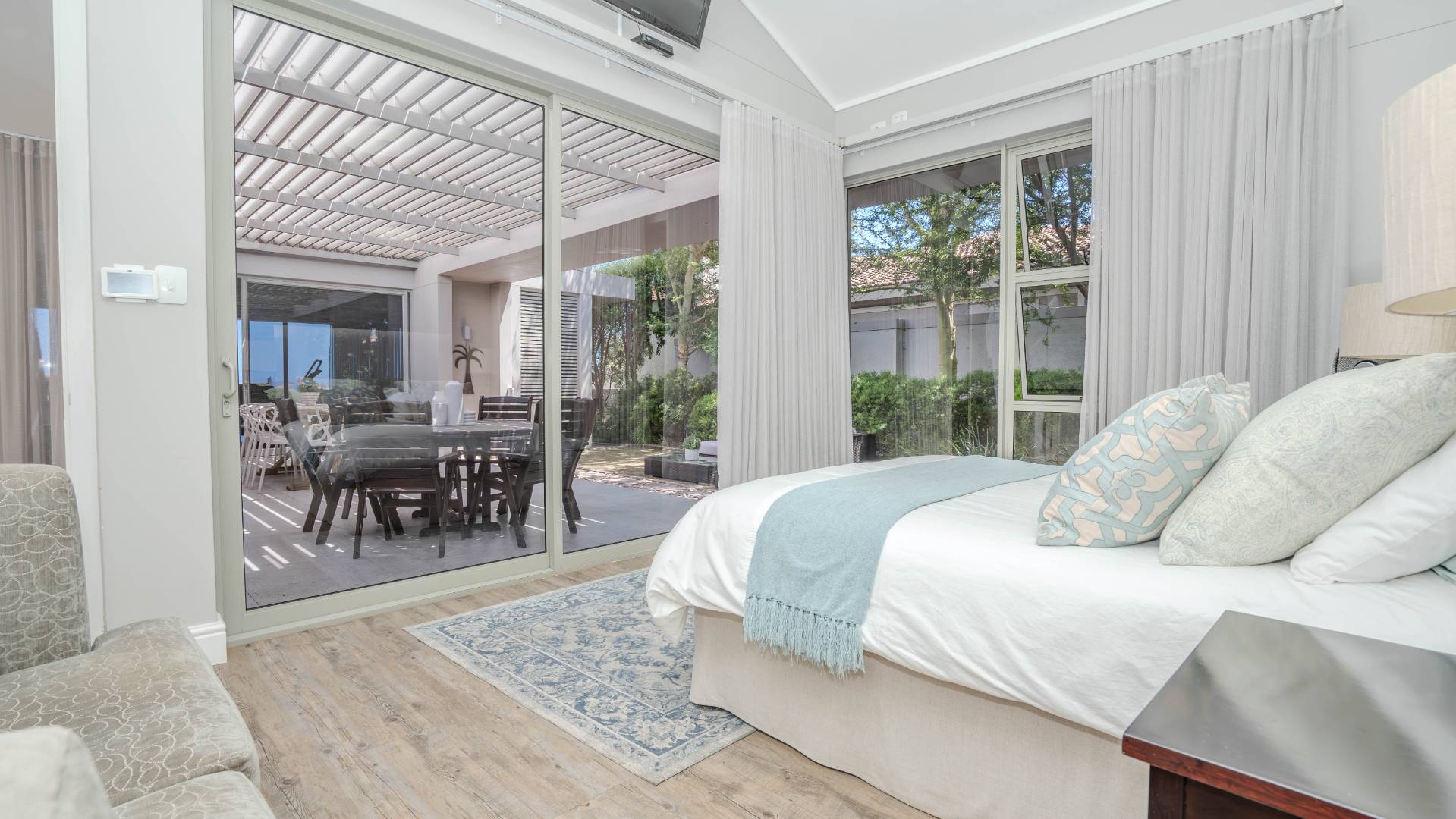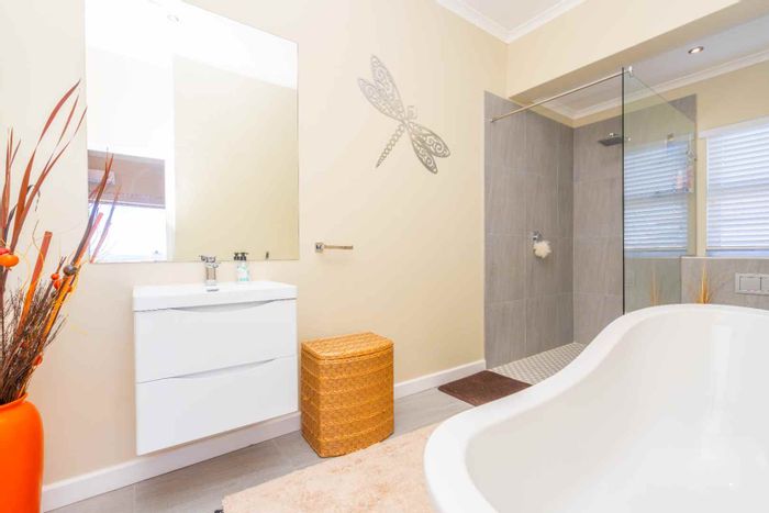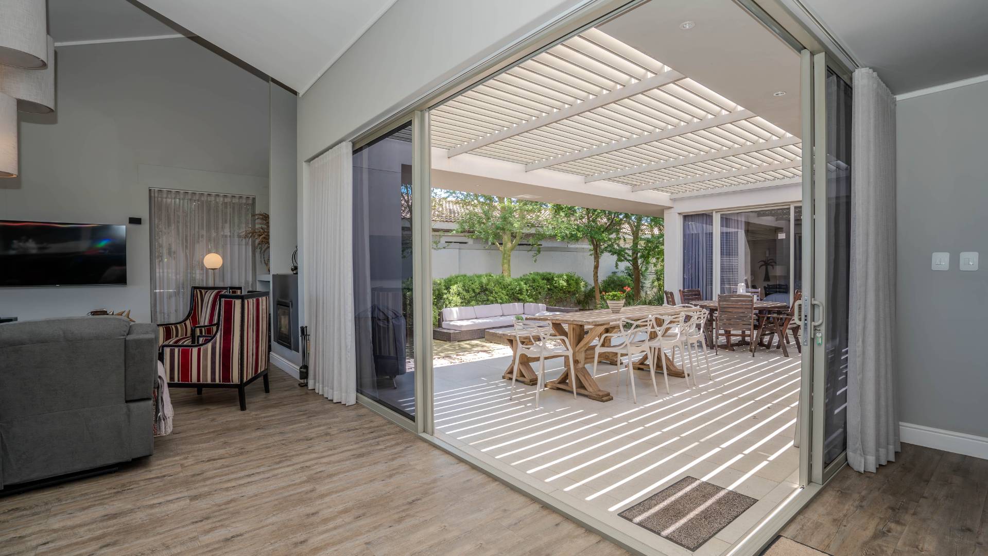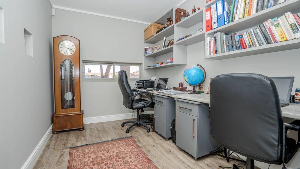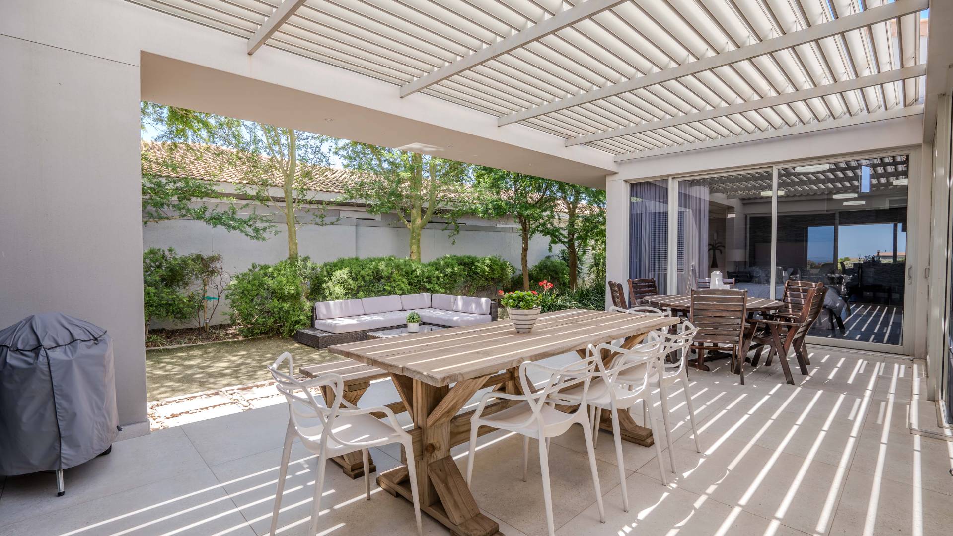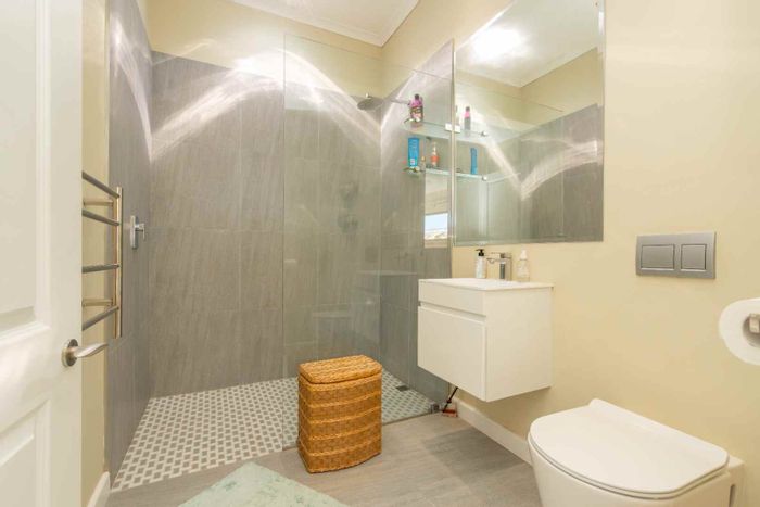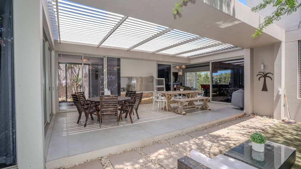 Step outside to the north-facing, wind-protected entertainment area, complete with a built-in braai and lush, low-maintenance landscaping. This inviting space is perfect for gatherings or tranquil moments of relaxation.