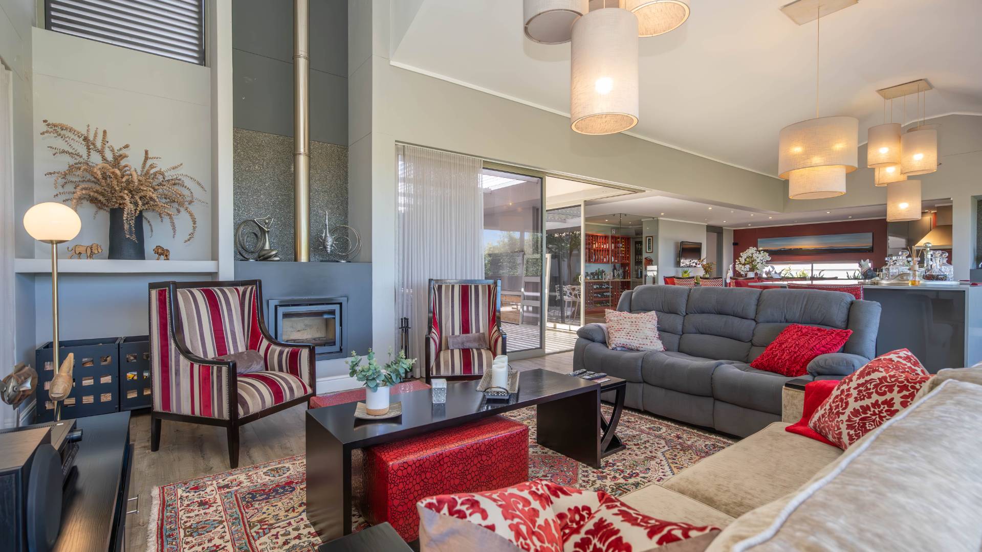 The living and dining spaces exude warmth and sophistication, enhanced by a combustion fireplace and a gas fireplace, respectively—perfect for cozy evenings or entertaining in style.