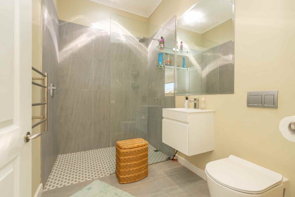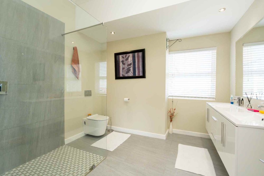 Upstairs, all three bedrooms have en-suite bathrooms and heated towel rails. The main suite includes a private balcony with views, built-in cupboards, American shutters, and a tilted awning. Guest bedrooms share similar lagoon views. Additional features include a private office and a large linen/storage room.