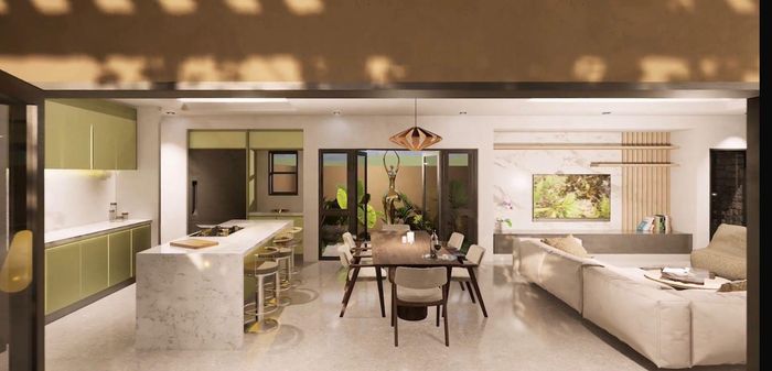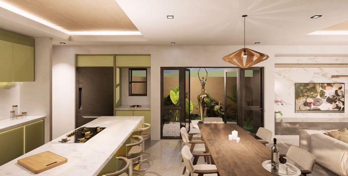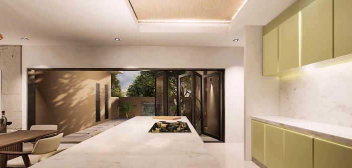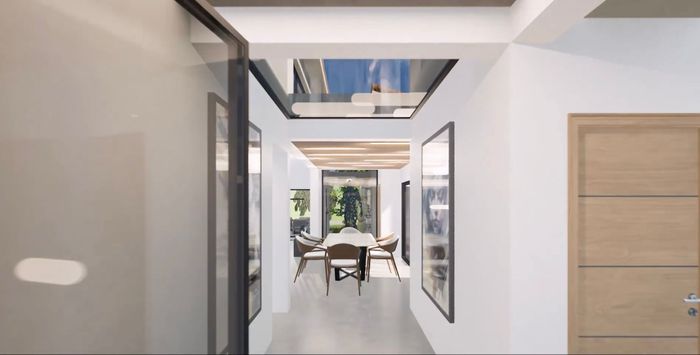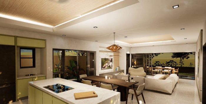 Four generously sized bedrooms ensure comfort for everyone, with two boasting private en-suite bathrooms. The main bedroom features large windows framing serene views of the pool.