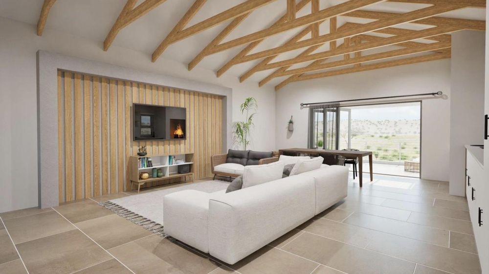 The upper floor is designed for leisure and entertaining. It features an open-plan TV lounge, dining area, and built-in barbecue, positioned to enjoy the sunset views. This level also includes a bathroom with a shower and a spacious bedroom with large windows and a private balcony.