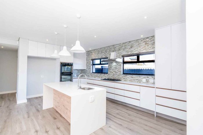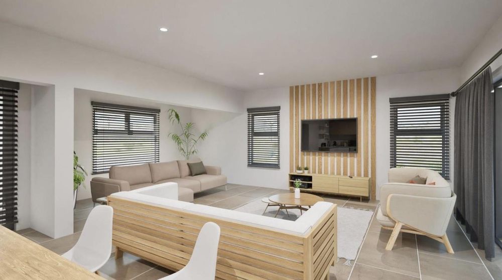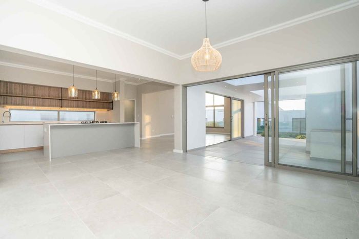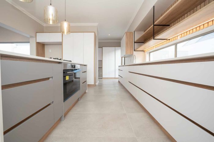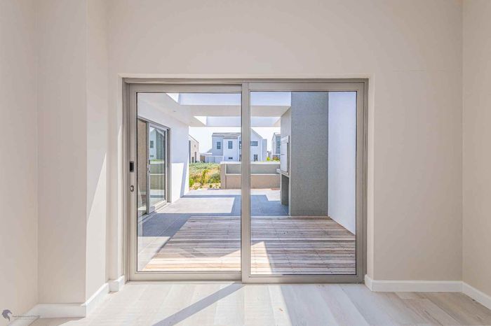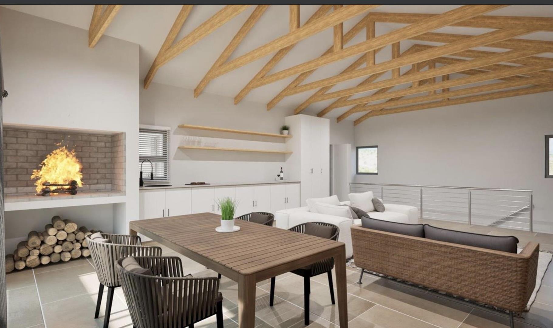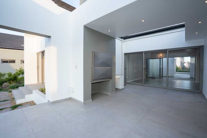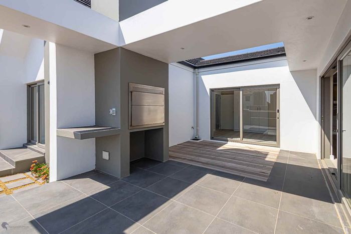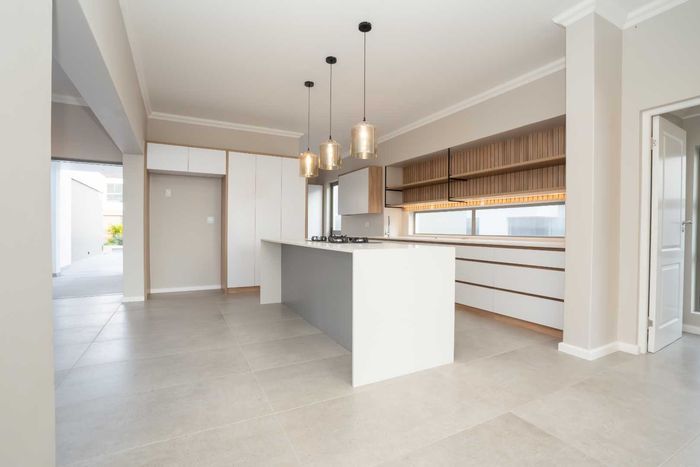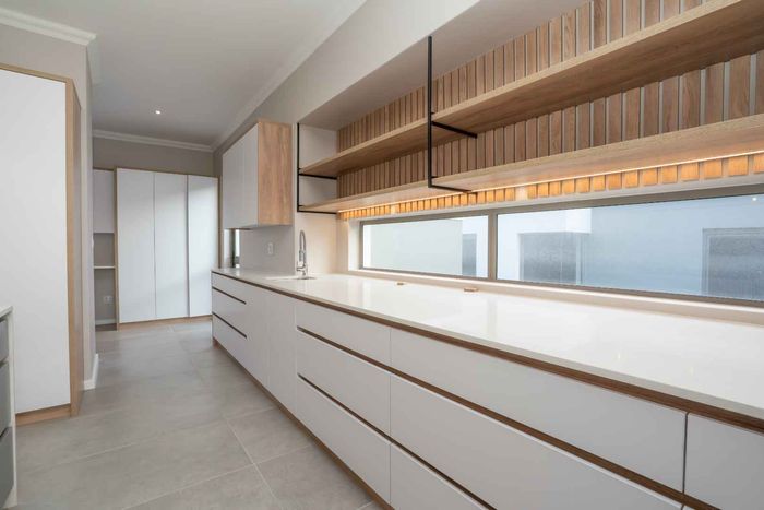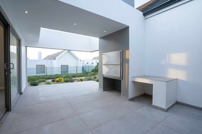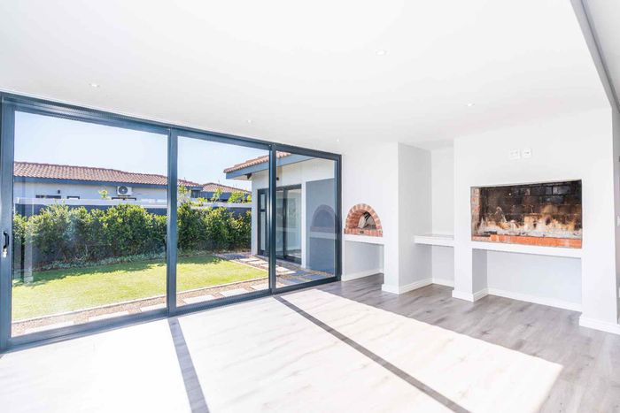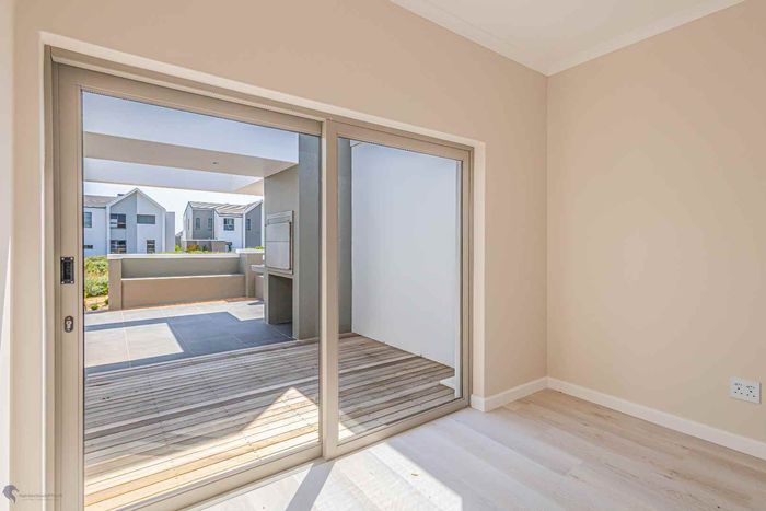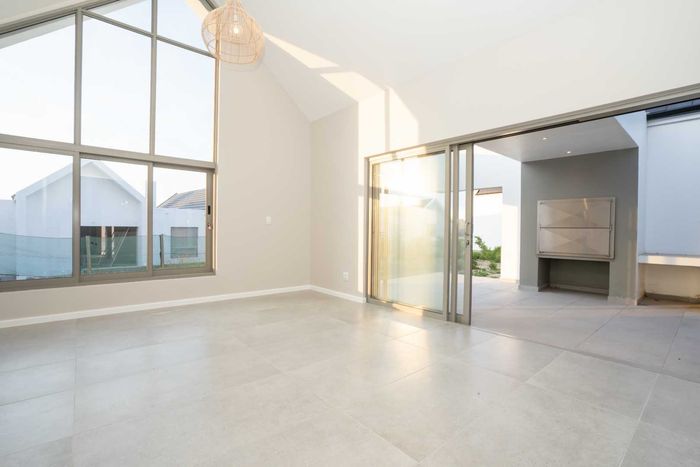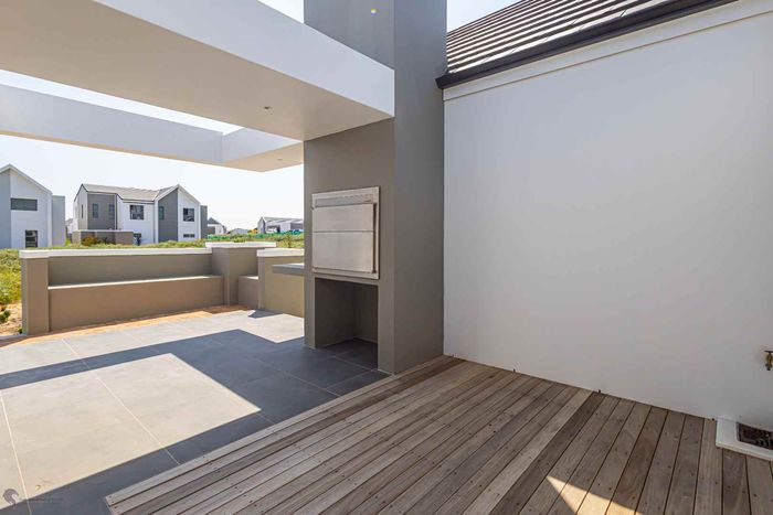 The ground floor offers practical and comfortable open-plan living. The modern kitchen includes a separate hidden scullery and connects seamlessly to the dining area and TV lounge. Sliding doors open onto a wind-protected outdoor entertainment area with a built-in braai, suitable for year-round use.