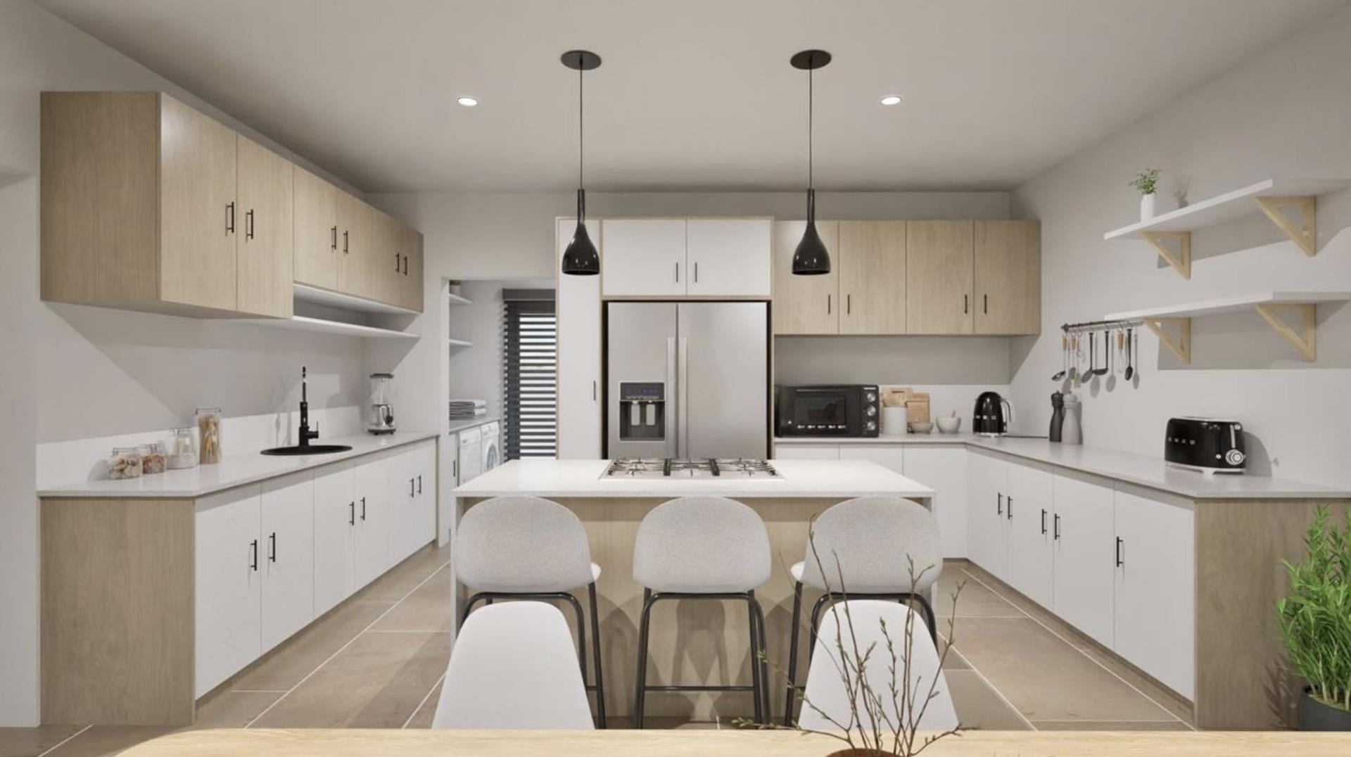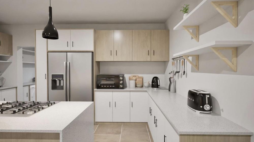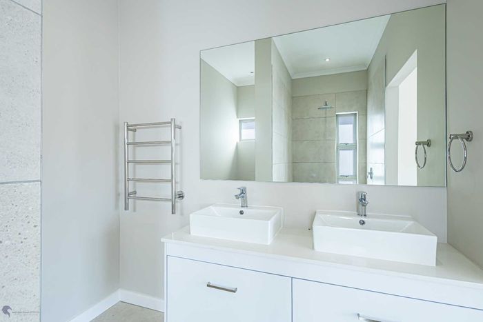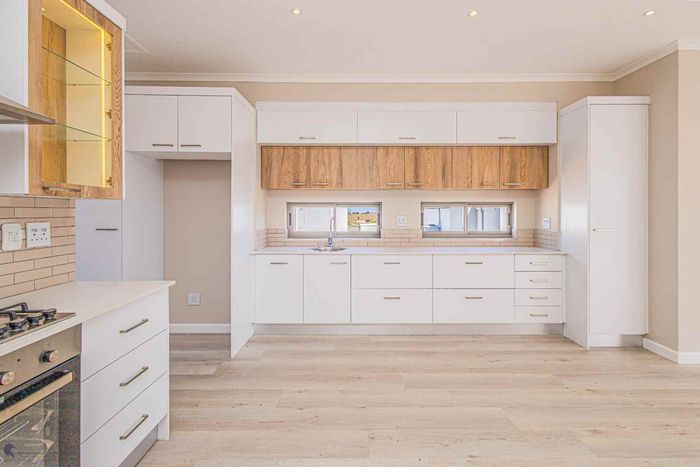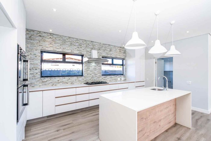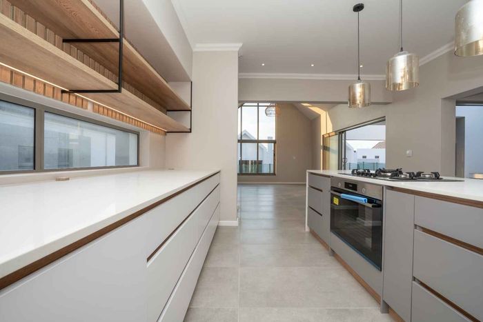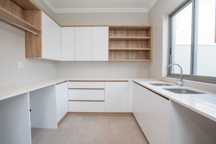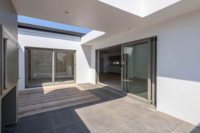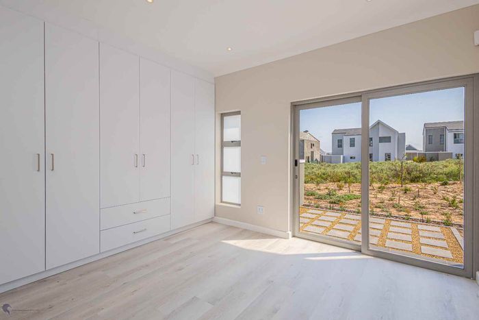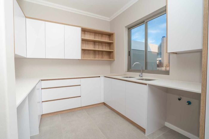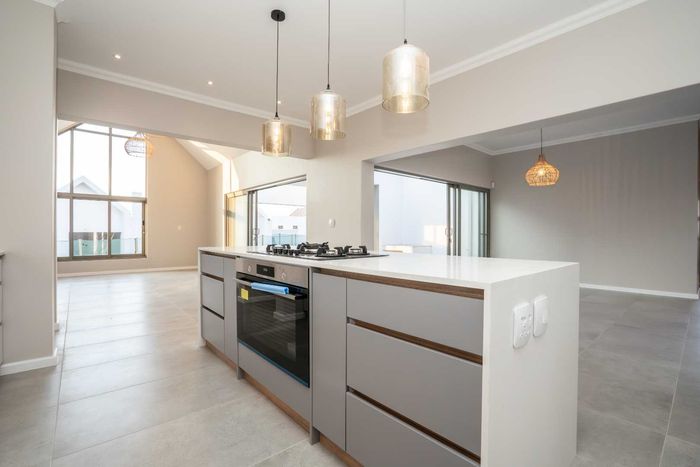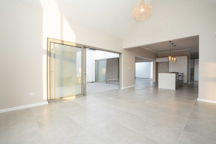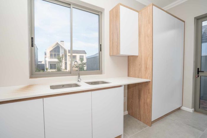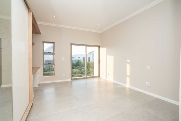 The ground floor offers practical and comfortable open-plan living. The modern kitchen includes a separate hidden scullery and connects seamlessly to the dining area and TV lounge. Sliding doors open onto a wind-protected outdoor entertainment area with a built-in braai, suitable for year-round use.