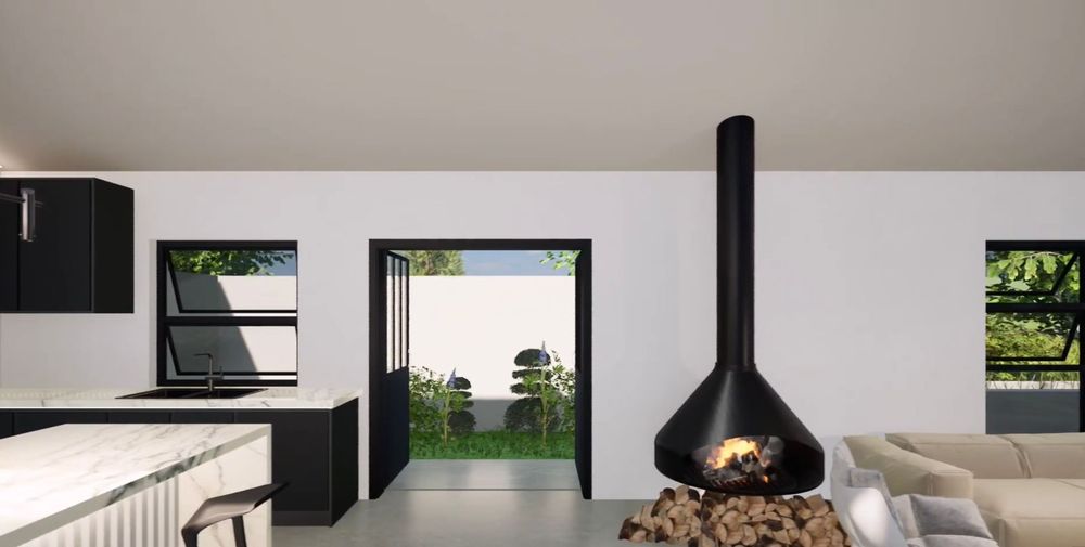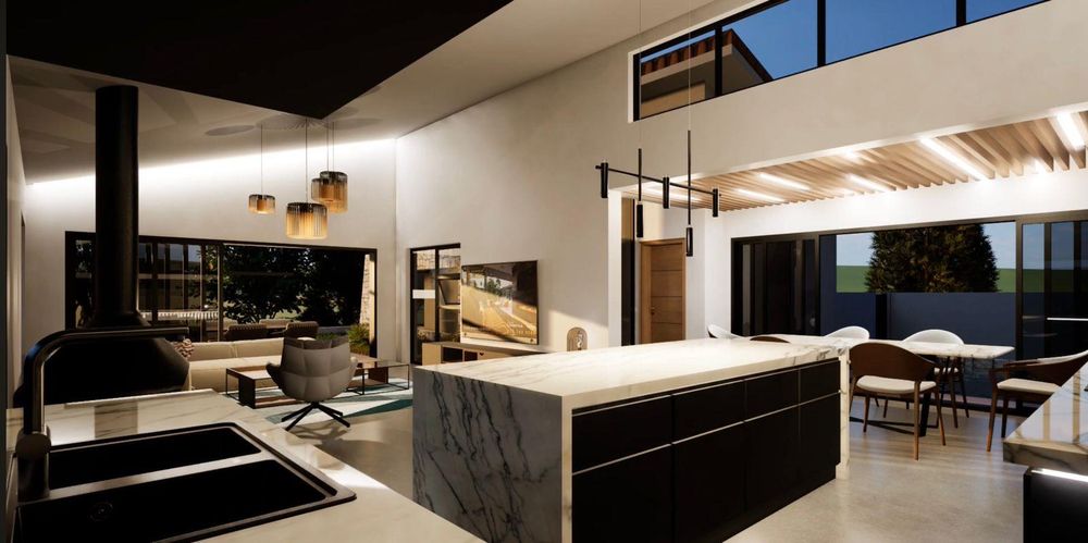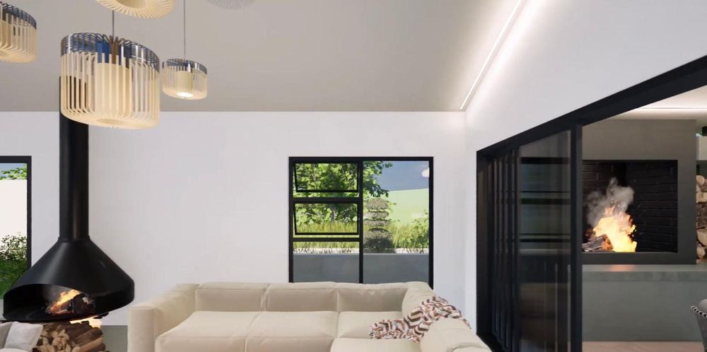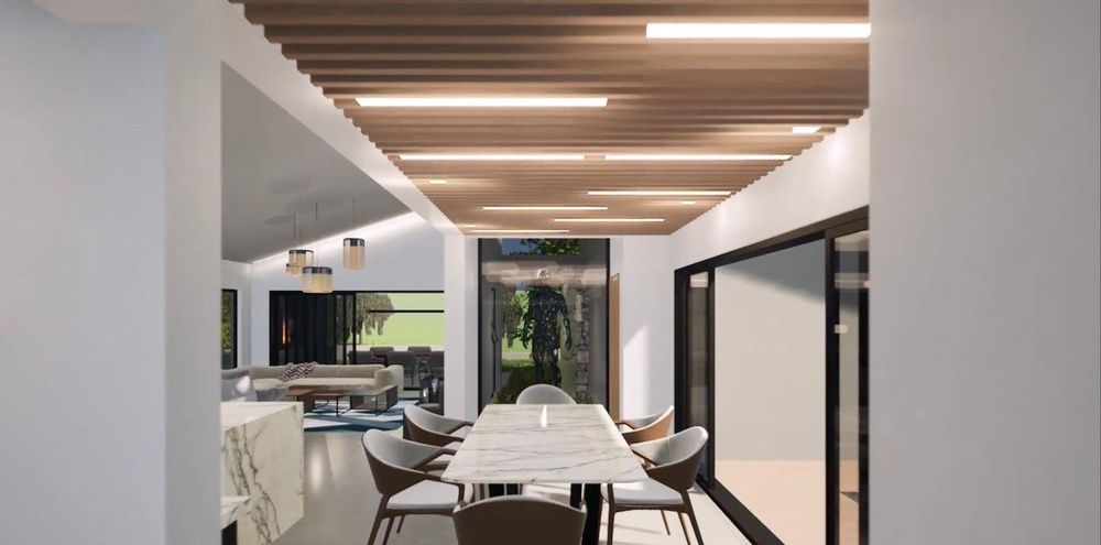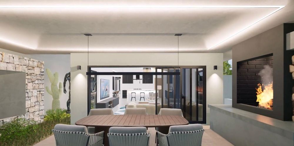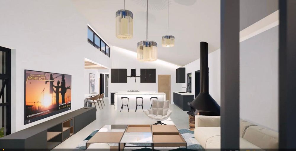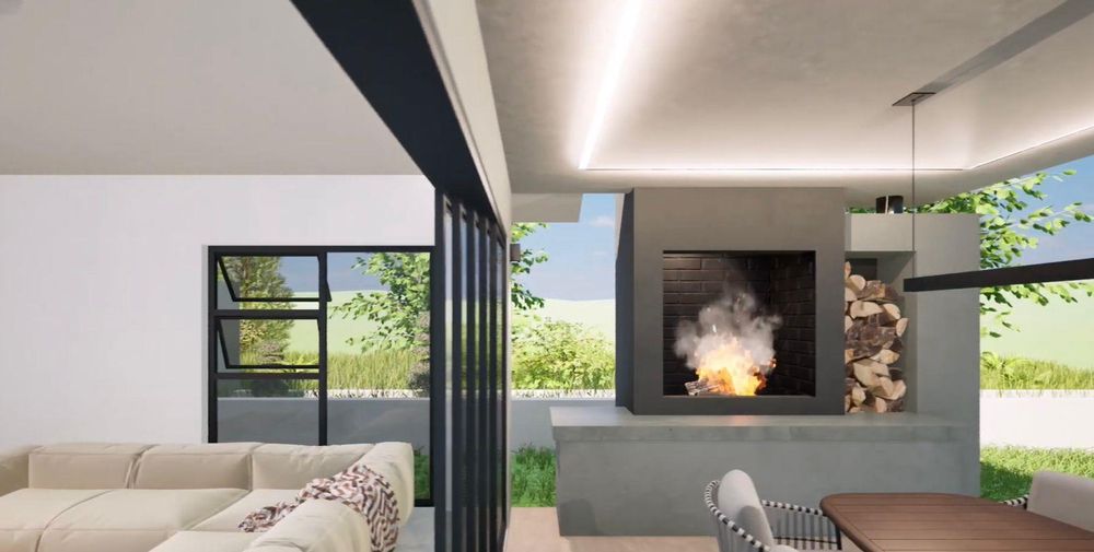 From the kitchen, the home opens into a generous open-plan living space with 4.8-metre ceilings and clean shadow-line detailing. The dining area sits to the right, while the spacious television lounge extends forward with provision for a freestanding fireplace. Large sliding doors allow the living space to flow effortlessly onto the covered braai and entertainment area.