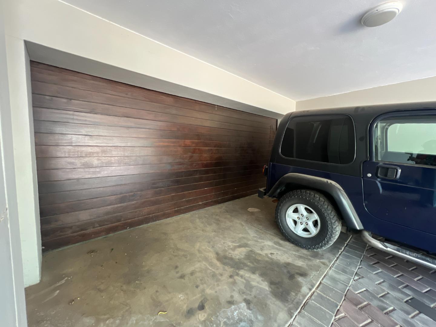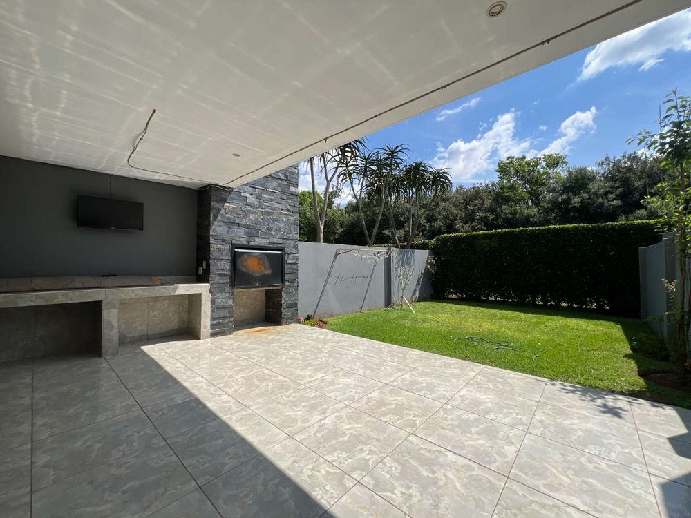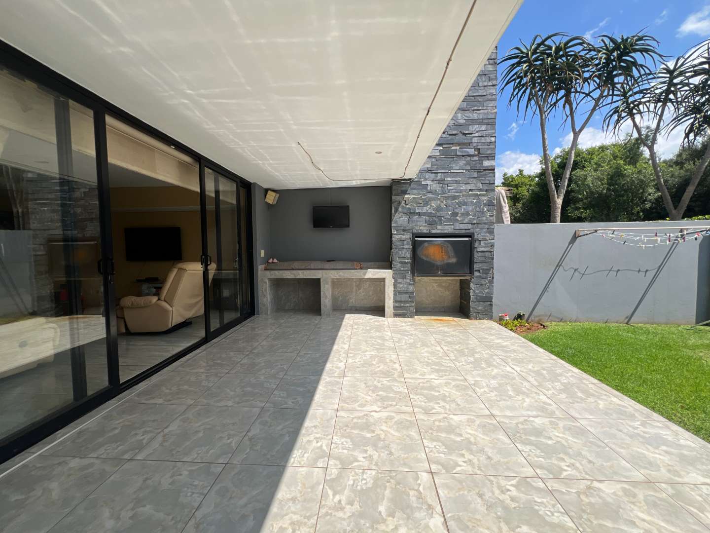 The house features open-plan living areas that flow easily onto a covered patio with a built-in braai, perfect for everyday gatherings or weekend entertaining. The patio overlooks a green, private garden, creating a calm spot to unwind. Large sliding doors in the dining area bring in plenty of natural light and showcase the estate’s neat, well-kept surroundings.