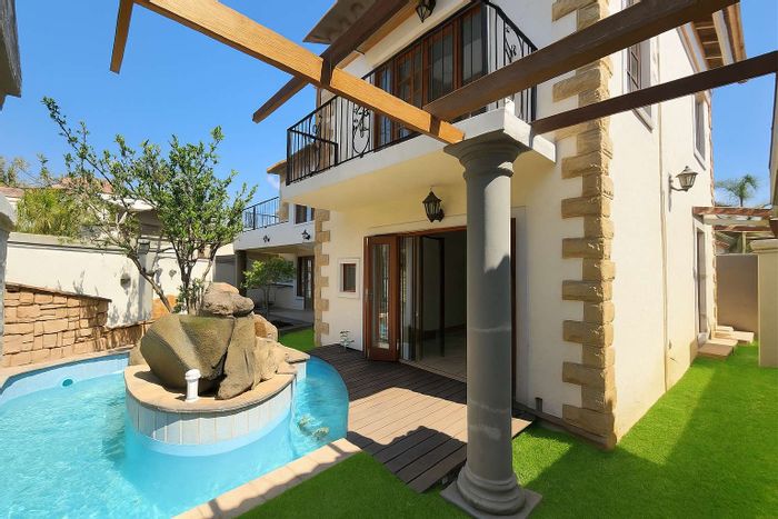 Resort-style Steyn City living with Nicklaus golf and parkland views; entertainer's flow to landscaped courtyard and private cinema — five en-suite bedrooms and six garages.