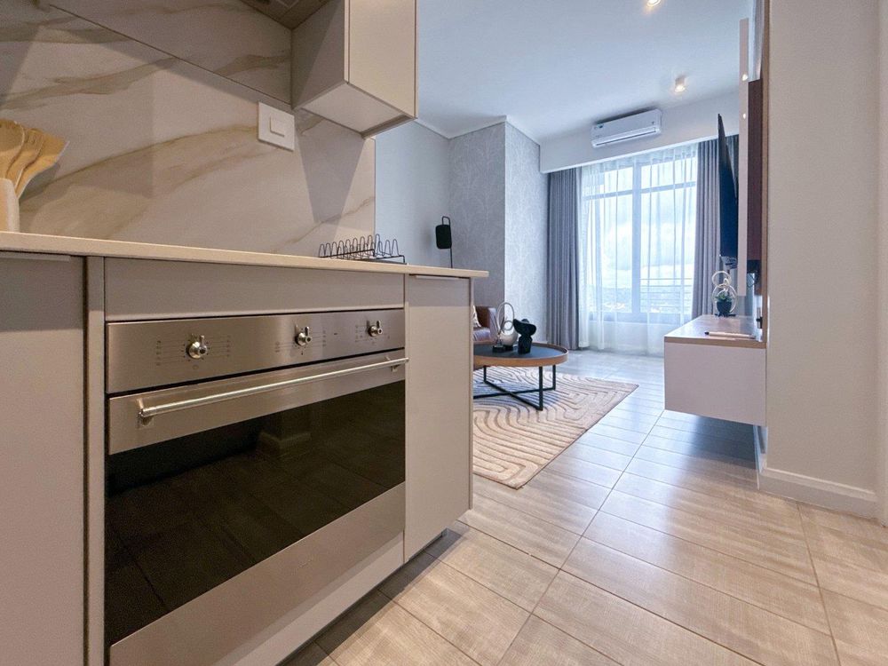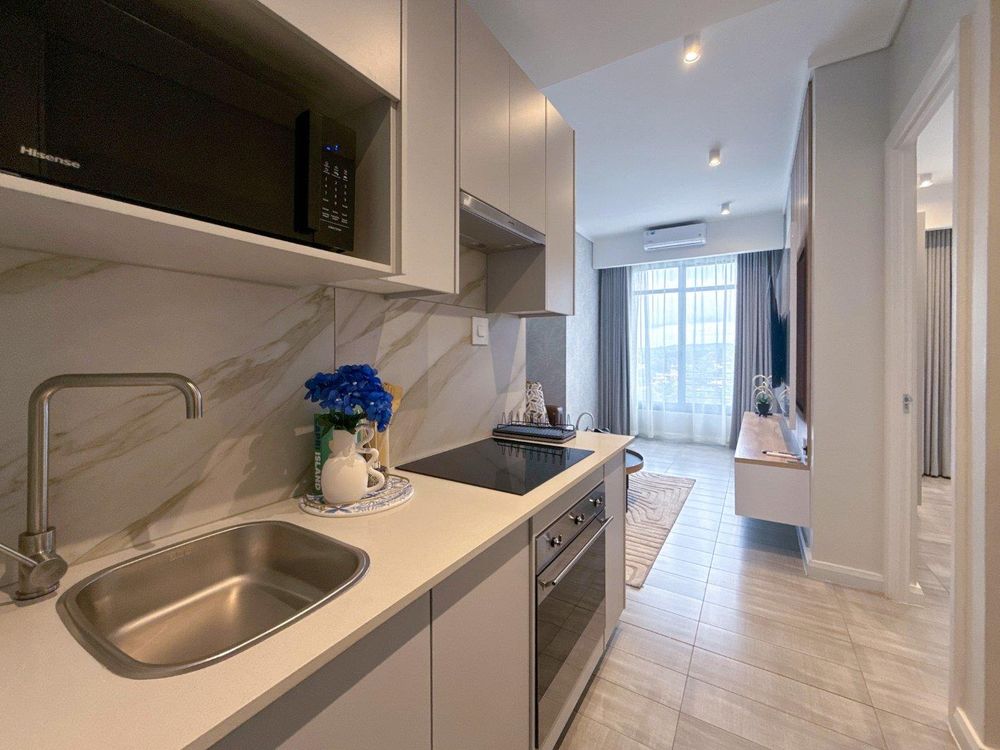 Featuring a high-spec kitchen (induction cooking, full fridge, oven, microwave), a generous living area and a dedicated workspace with desk and chair. The bathroom is sleek and modern, and the entire unit is finished to the highest standard.