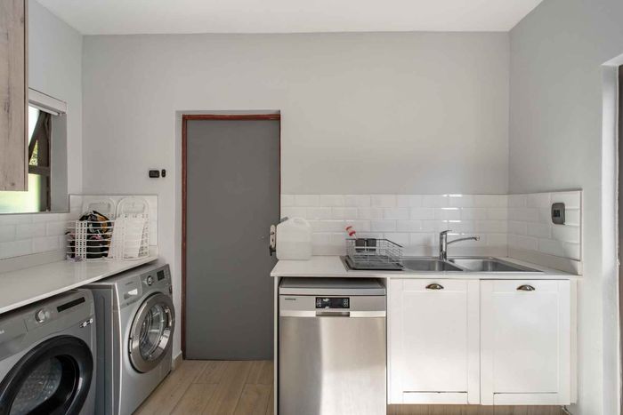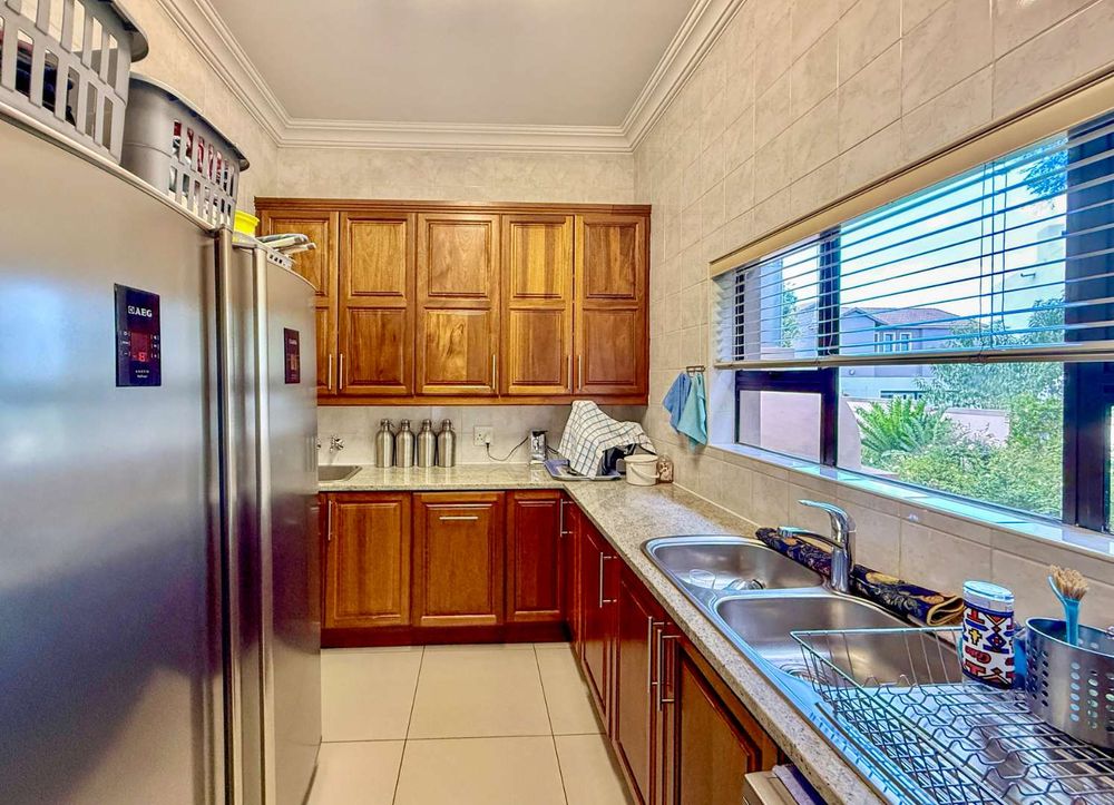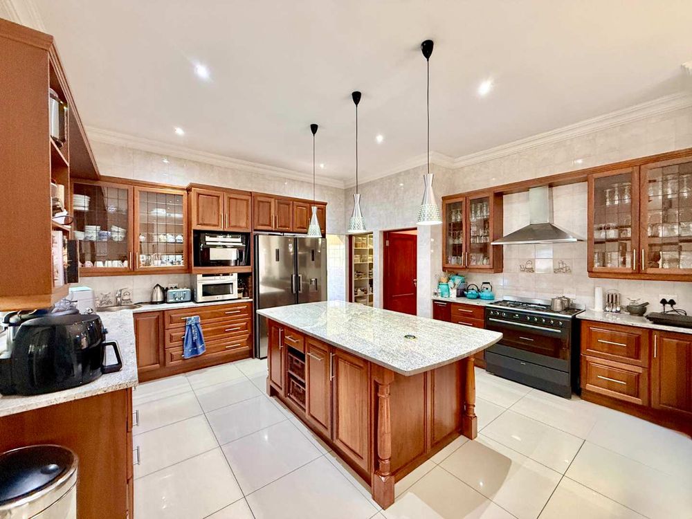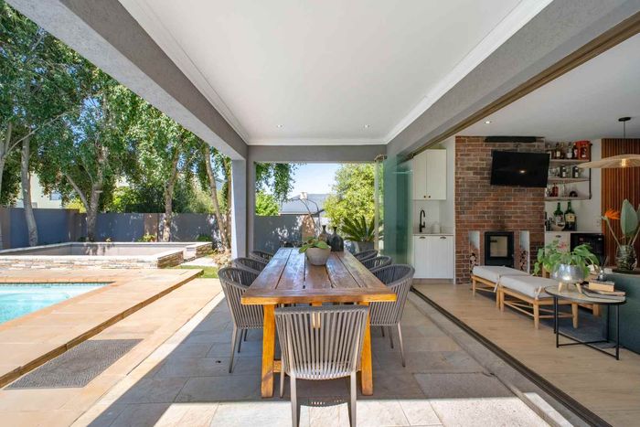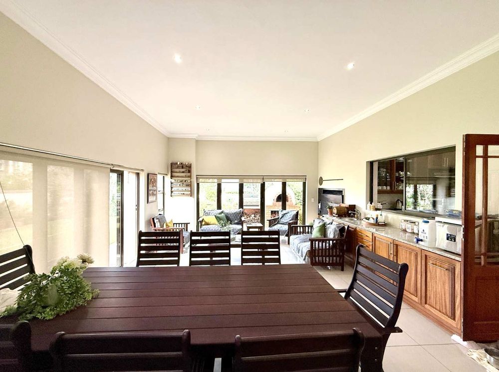 At the heart of the home, the beautifully appointed kitchen is both stylish and practical, featuring a gas stove, solid wood cabinetry, and quality craftsmanship in every detail. The kitchen flows effortlessly into the indoor-outdoor entertainment area, complete with a built-in braai and pizza oven, an inviting space designed for effortless year-round entertaining.